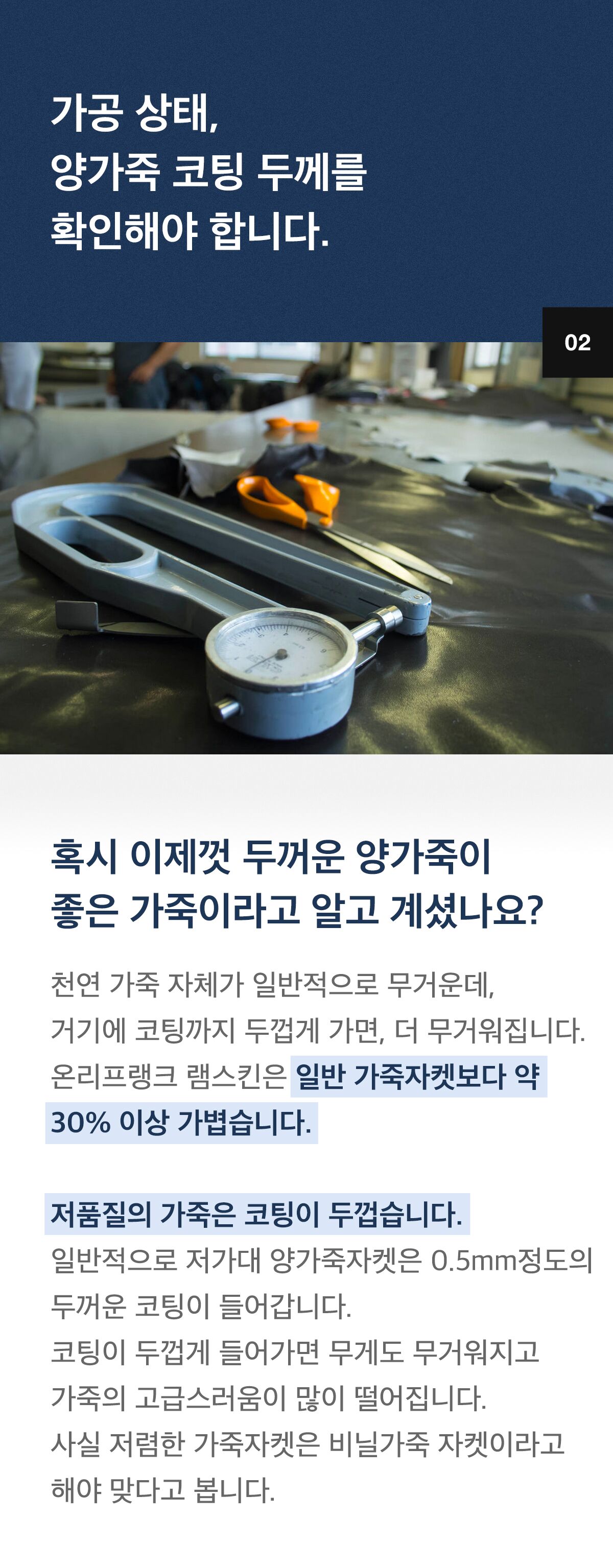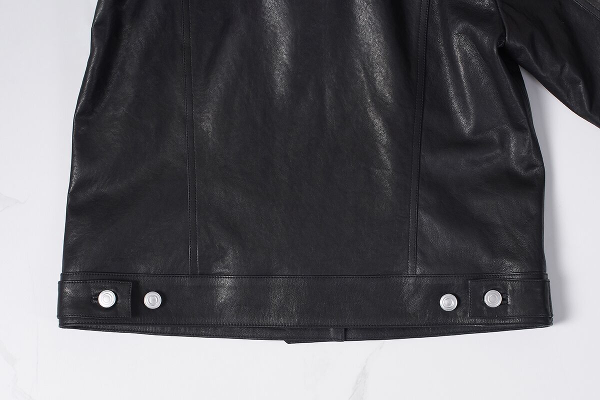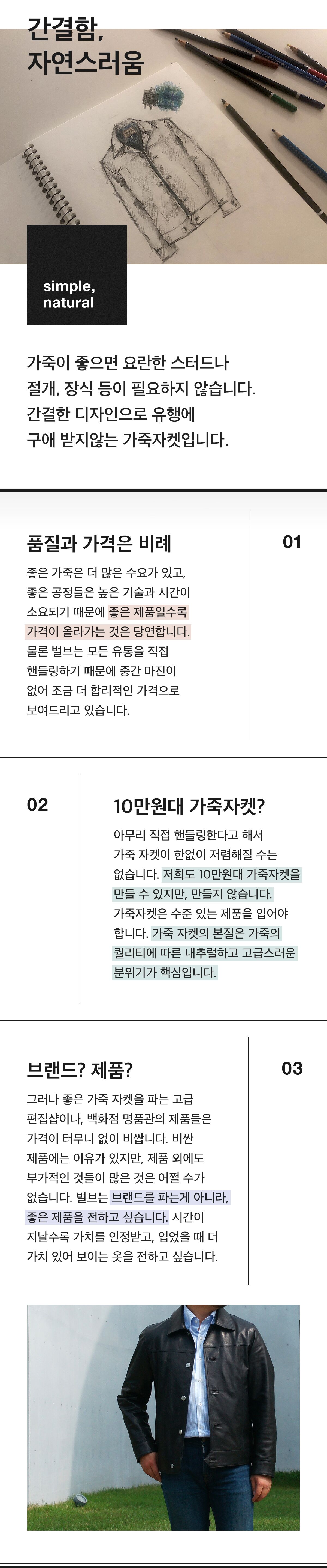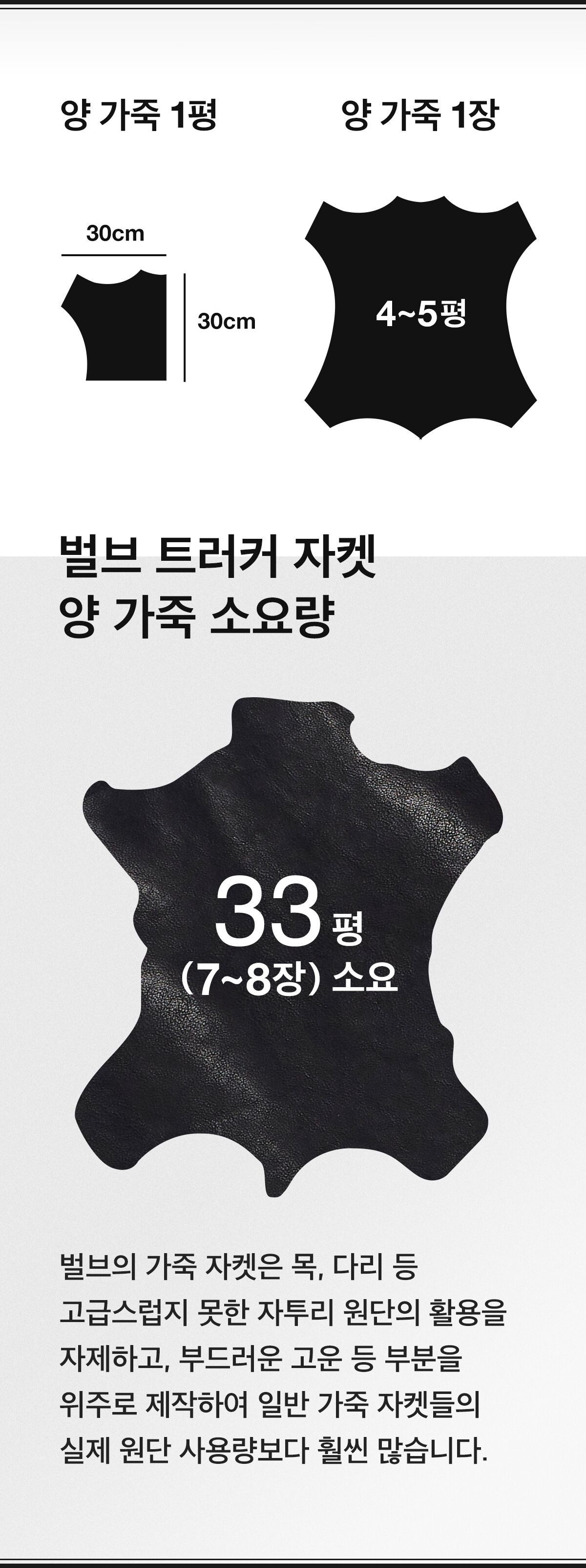 A : 일반적으로 절개가 많이 들어간 가죽자켓(일명 라이더자켓)과는 달리 절개 디자인을 간결한 디자인으로 간결하고 편안함이 포인트입니다. 절개 디자인이 거의 없는 경우 원단 사용량은 훨씬 많이 소요가 됩니다. (양의 거의 등쪽만 사용하게 됩니다.)