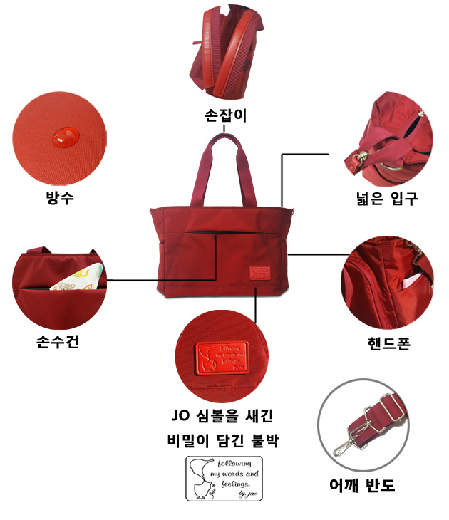 제이오 맘마 가방은 방수 처리가 가능한 재질로 만들어졌으며