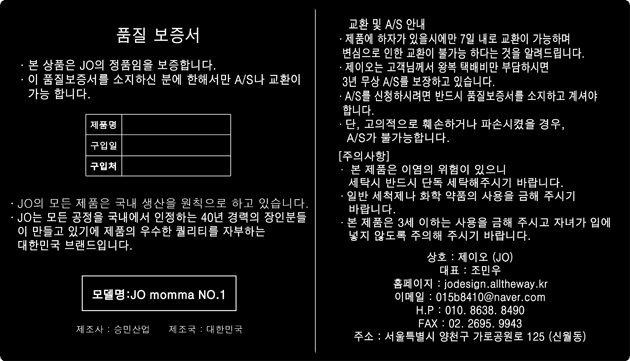 - 문의처 : 제이오 010-8638-8490 / 015b8410@naver.com - 교환/반품 : 생산불량으로 인한 제품에 대한 반품과 교환을 무상교환으로 제공해드리며 구매 후 3년 내 사용 중 하자 발생시 무상 A/S처리 서비스를 제공합니다. 단, 크라우드 펀딩의 특성상 후원을 통하여 제작된 제품이기 때문에 단순 변심으로 인한 교환 및 환불을 어려우니 결정에 유의하여 주시기 바랍니다.
