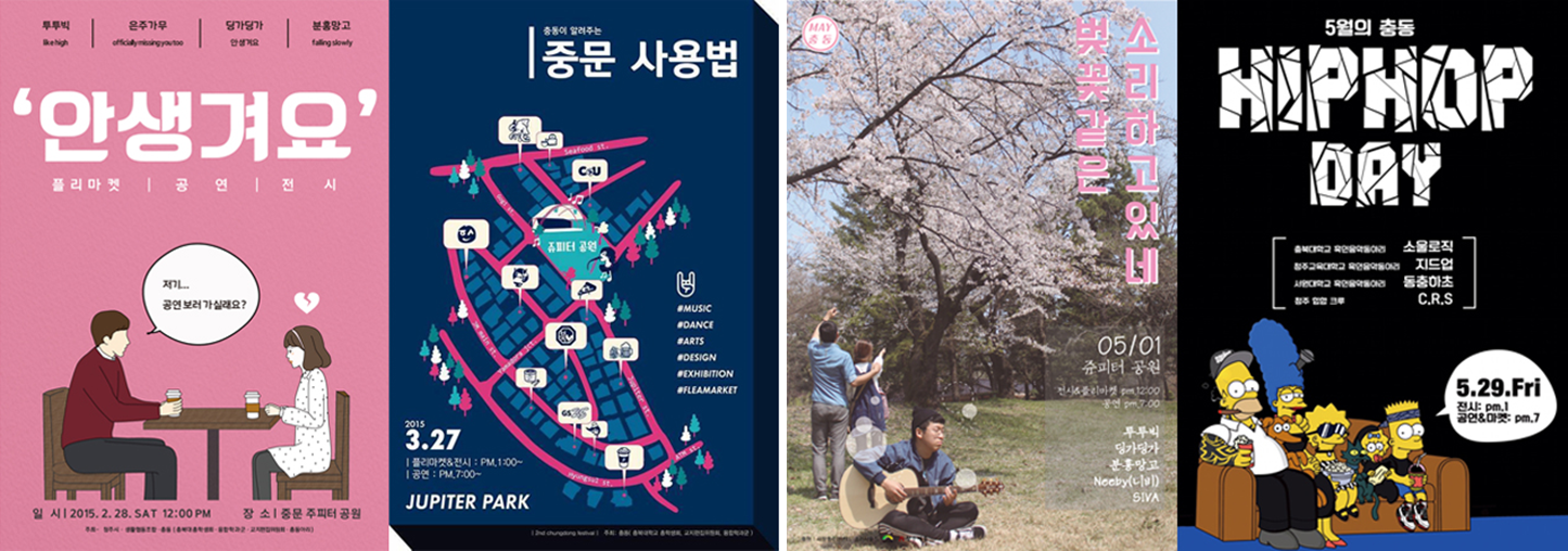충북대학교를 중심으로 도보 15분거리에는 영화관 1개, 전시시설 1개, 야외공연시설 1개로 문화시설이라고는 단 3개뿐입니다. 걸어서 향유할 수 있는 문화시설이 3개 뿐이라는 것은 관람자 입장에서도, 공연이나 전시를 하는 입장에서도 치명적입니다. 그나마 존재하는 문화시설도 다양한 장르의 문화를 향유할 수 있는 공간이라기 보다는, 제한적으로 주어진 컨텐츠를 받아들이는 공간이라는 점입니다.