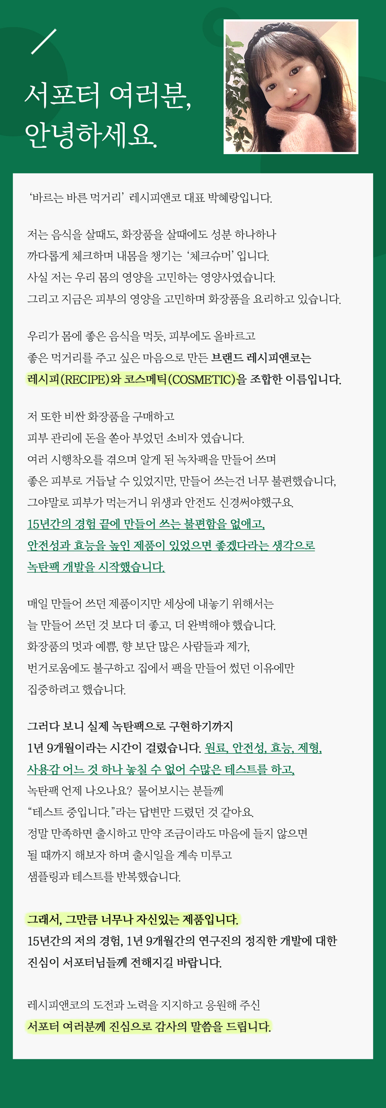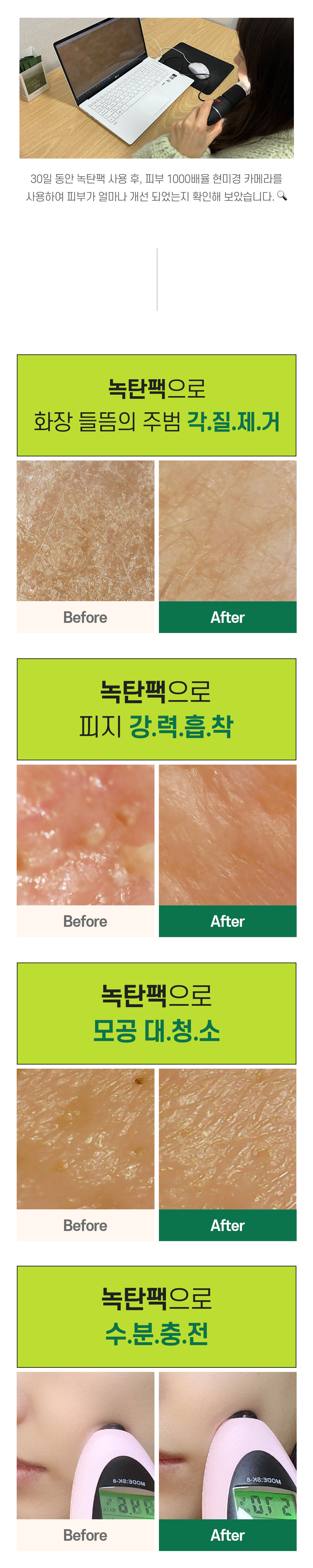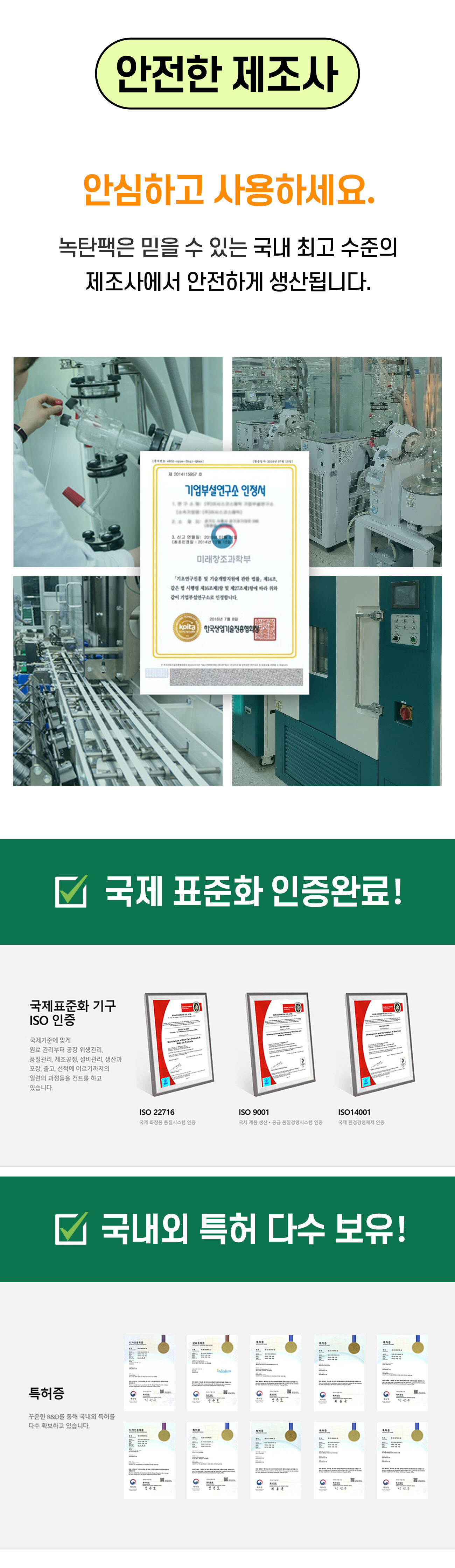 지난 15년간 경험을 바탕으로 연구진들과 함께 진심을 담아 1년9개월을 연구한 끝에 ‘만들어 나온 팩’ 녹탄팩이 탄생하였습니다.