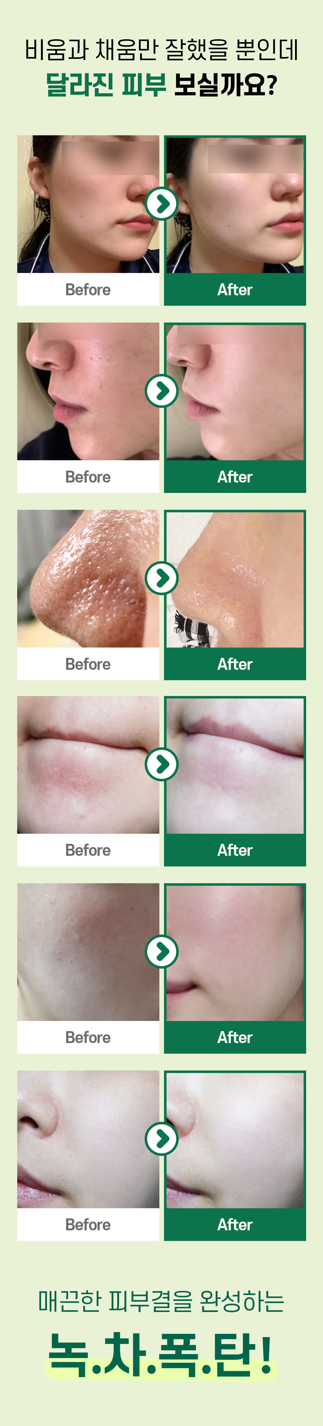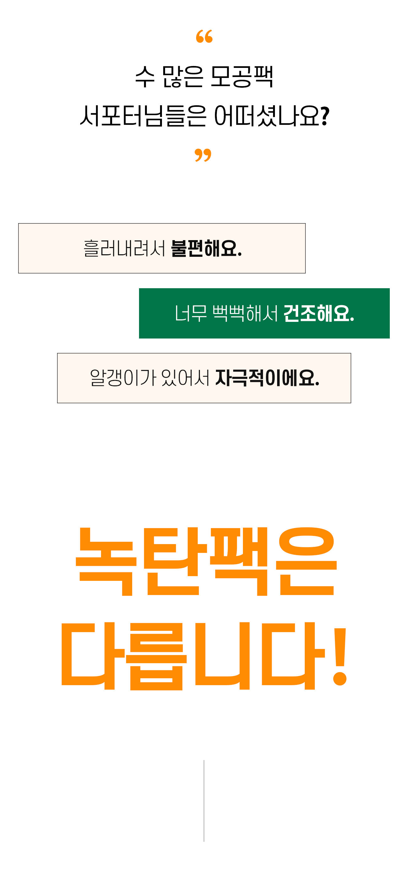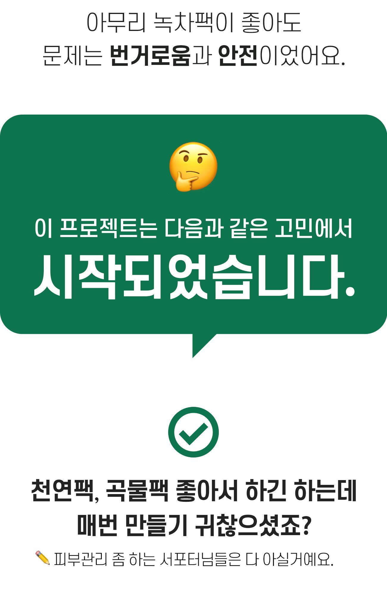 지난 15년간 경험을 바탕으로 연구진들과 함께 진심을 담아 1년9개월을 연구한 끝에 ‘만들어 나온 팩’ 녹탄팩이 탄생하였습니다.