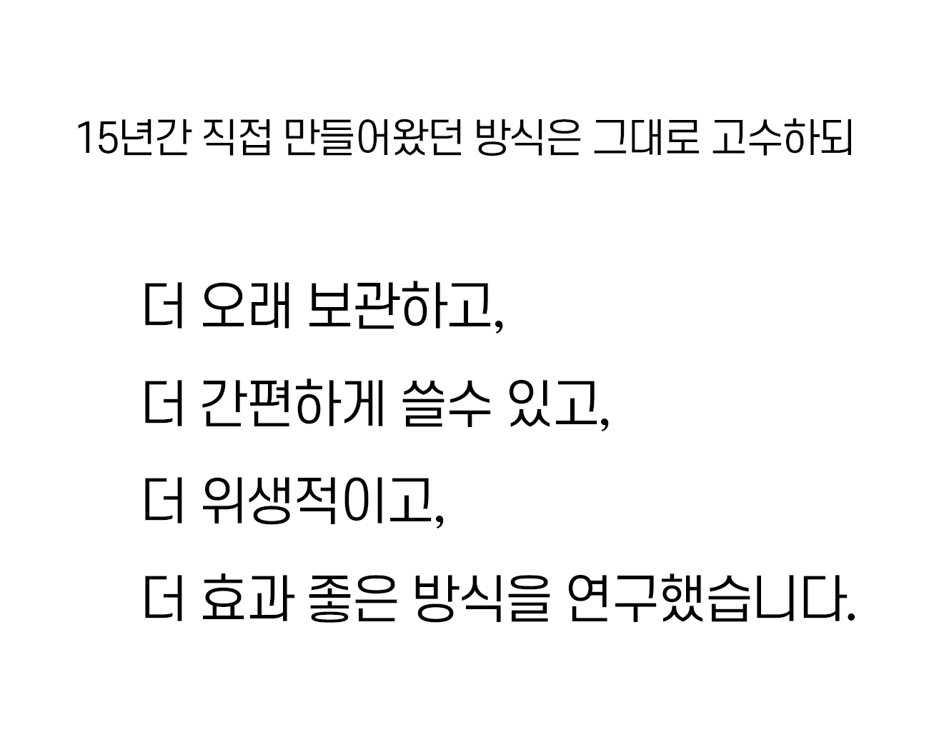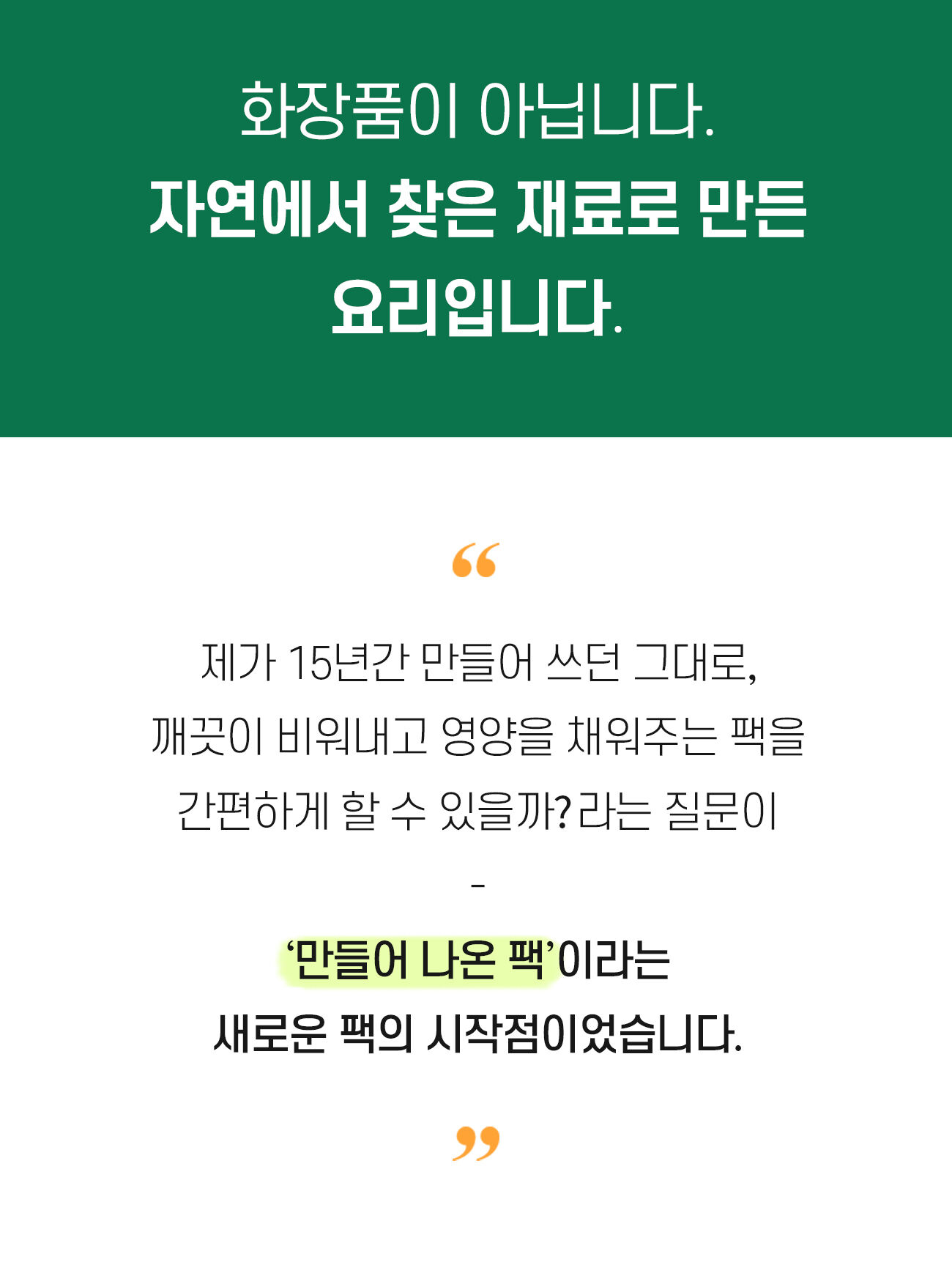원료부터 제조, 생산, 성분, 제형, 향까지 '바르는 바른 먹거리'에 집착하며 인위적인건 모두 빼고 본질에만 집중했습니다.