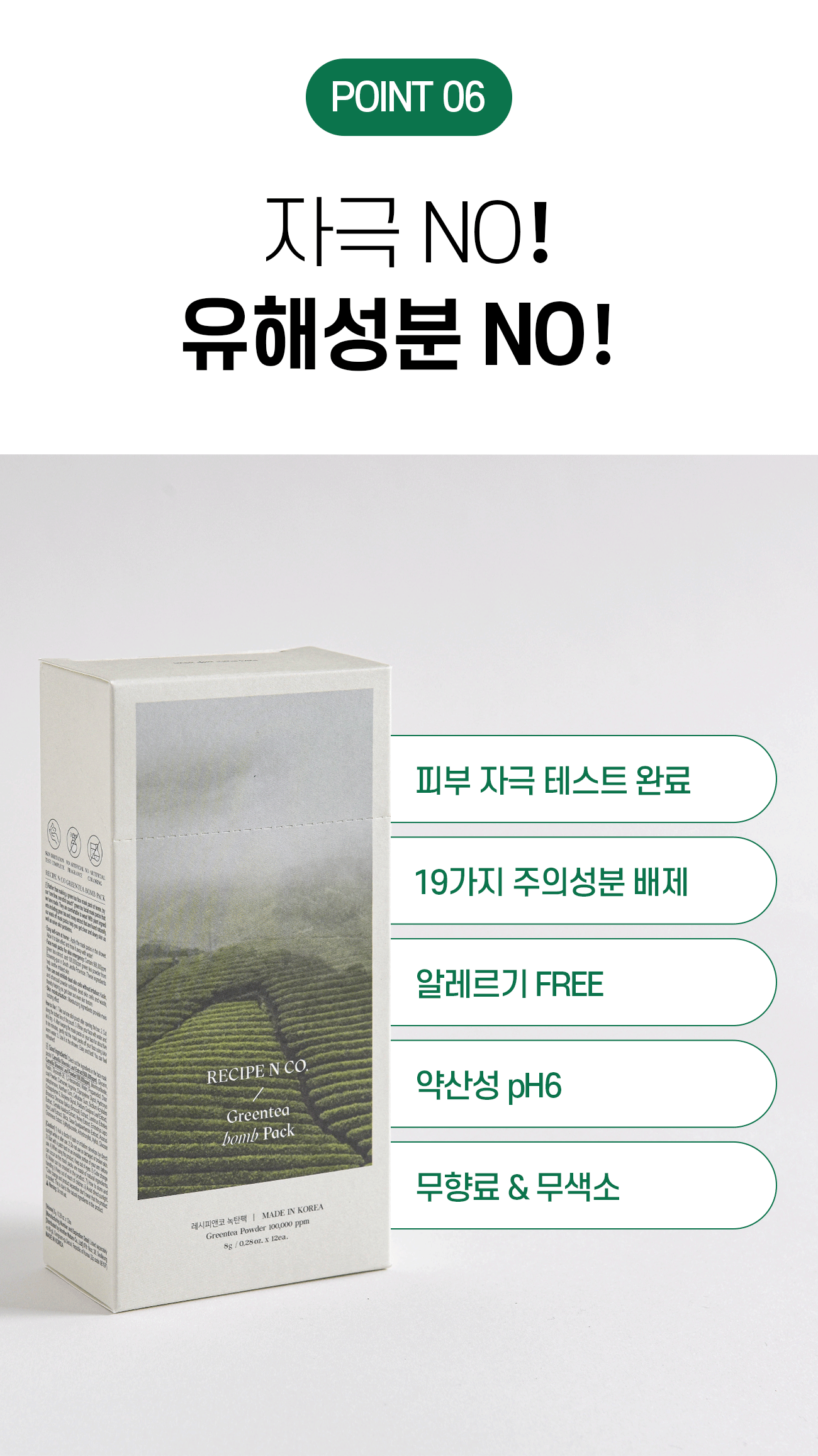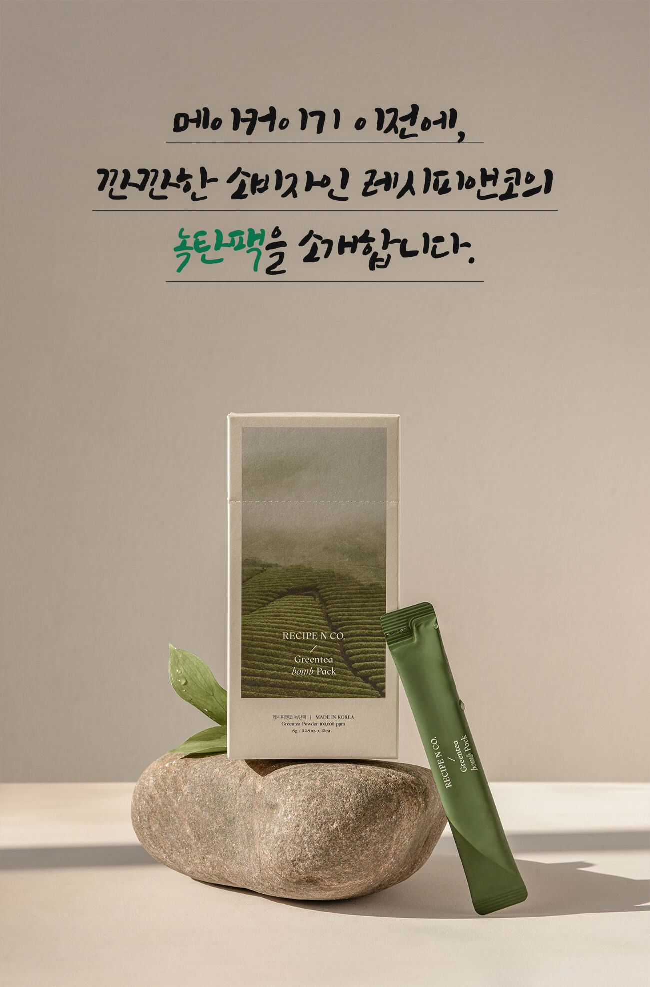 레시피앤코는 당당하게 '녹탄팩’이라는 이름을 쓴 만큼, 단순 컨셉으로 잡다하게 애매한 성분을 넣는게 아니라 오직 피부 변화를 위해 고가의 유기농 녹차성분을 압도적으로 많이 넣었습니다.