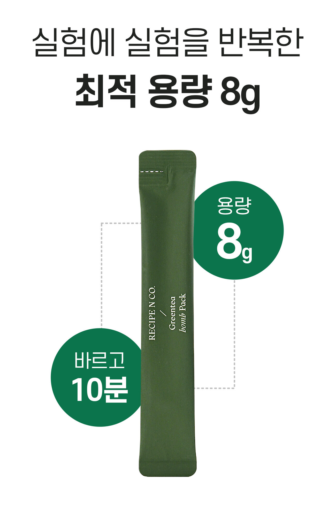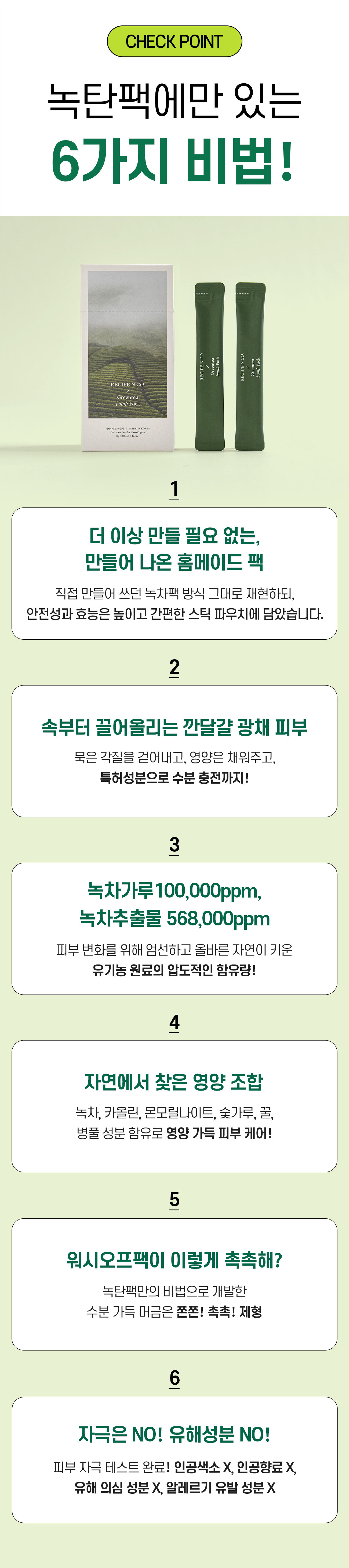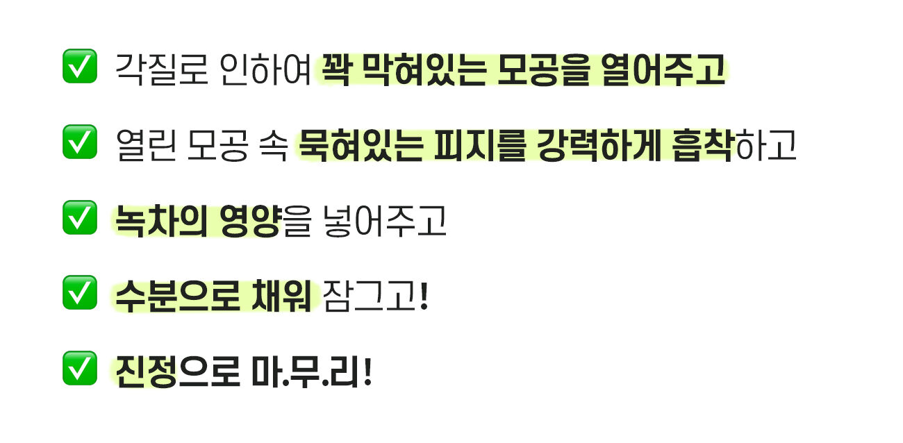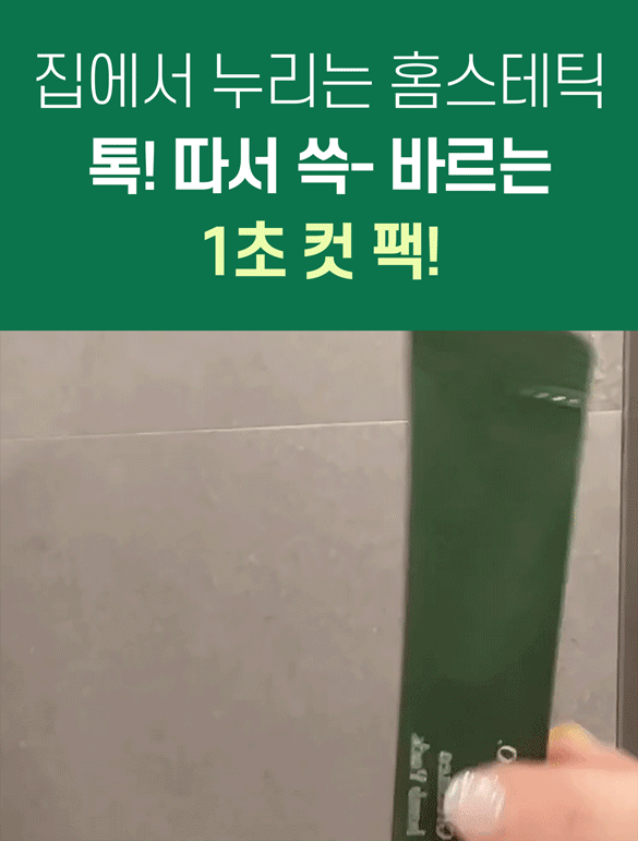피부 건강을 위한 녹차를 양껏 충분히 넣어 누구나 ‘깐달걀 피부’가 될 수 있는 방법에 집중하였고, 병풀을 넣어 마지막에는 진정으로 마무리 해주는 팩이에요! 불편함도 해소 하기 위해 간편하게 홈스테틱을 언제 어디서나 누리 실 수 있도록 이 모든걸 1포에 넣었습니다.