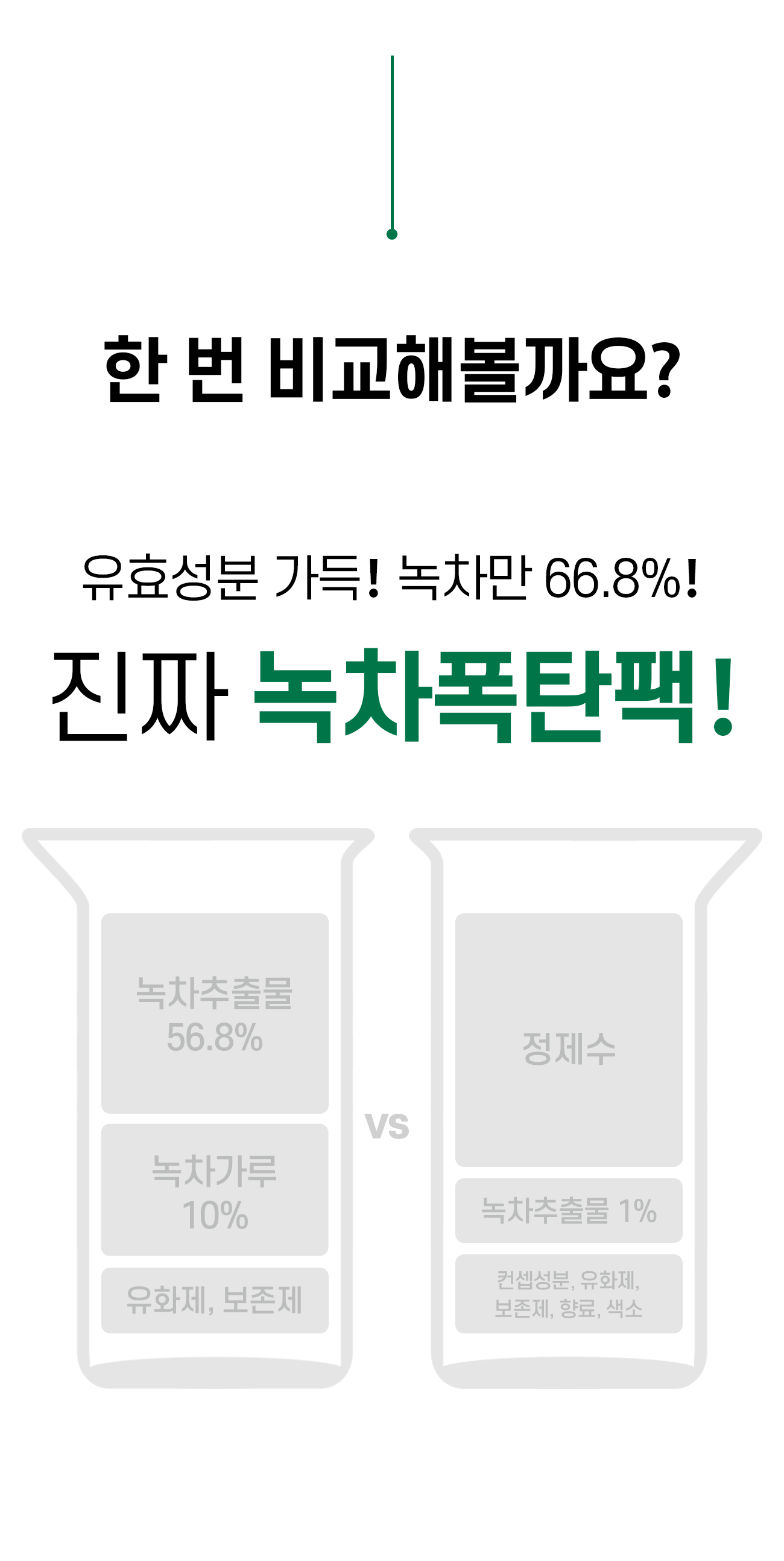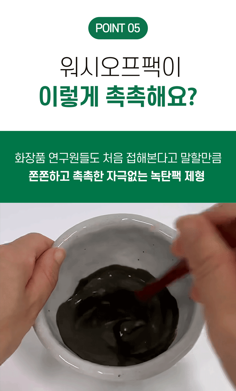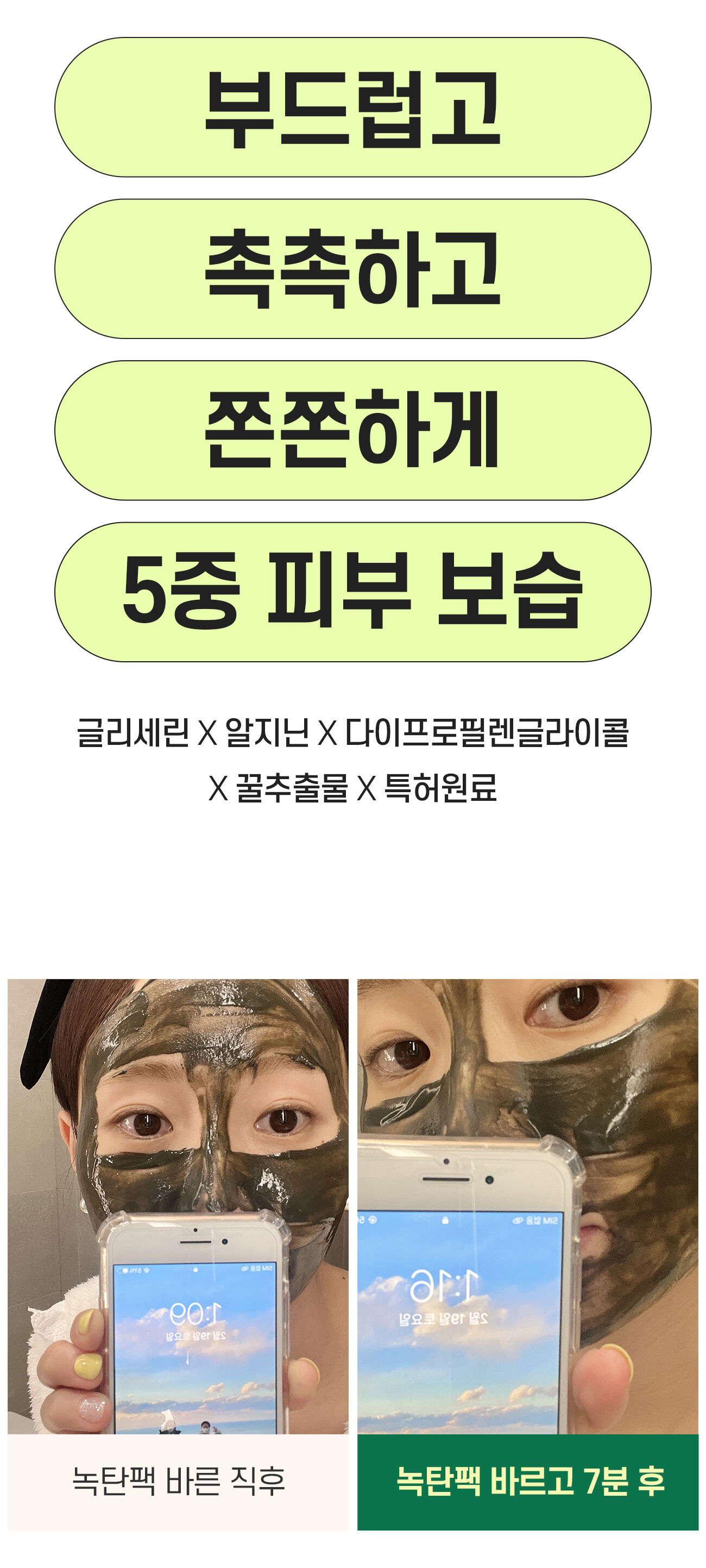 화장품은 보통 정제수를 베이스로 만들어지지만, 녹탄팩은 녹차추출물이 베이스입니다.