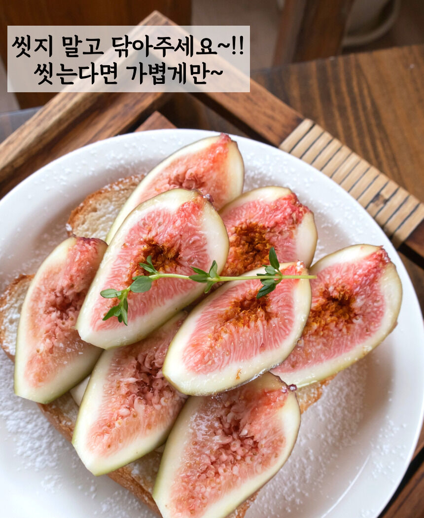 무화과는 물이 닿으면 쉽게 무를 수 있는 과일이에요!! 그렇기 때문에 키친타올에 물을 살짝 묻혀 닦아내거나 아주 살짝만 물로 행궈주시는 것을 추천드립니다!!