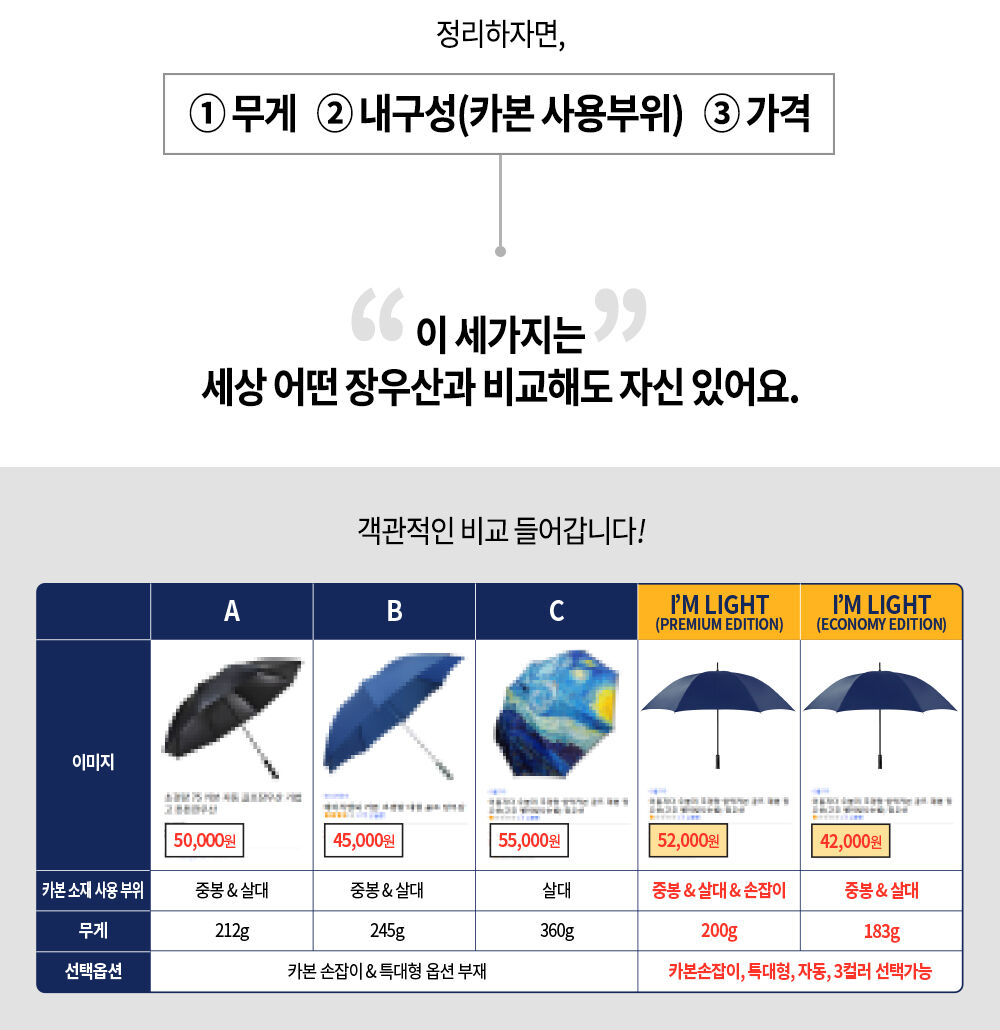 다년간 초경량 우산을 제작하면서 지속적으로 시장 리서치를 해왔기 때문에 세상 어떠한 우산과의 스펙 비교는 자신있어요