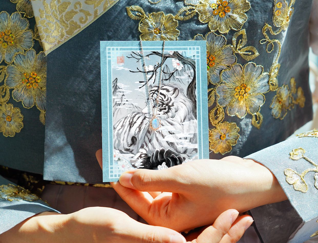 아주아주 먼 옛날 아픈 아이를 위해 새벽의 설산에서 약초를 캐던 할머니가 있었어요. 추운 산길을 헤치고 헤치다 지쳐 쓰러졌을때 푸른 눈과 흰 털이 아름다운 백호가 앉아있었습니다. 눈을 감았다 뜨니 백호는 눈꽃처럼 사라져버리고 백호가 있던 자리엔 투명한 보석이 놓여 있었어요. 그건 달의 힘을 품은 '문스톤' 보석이었습니다. 달의 주기가 반복되는 것 처럼 육체의 정상적인 리듬을 맞춰주는 능력은 건강을 보호해주며 보석 안의 푸르고도 다채로운 빛들은 소유자의 분노와 슬픔을 치유해 마음이 다치거나 아플 때 안정과 위로를 선사해 주는 상냥한 보석이었어요. 할머니는 백호의 보석을 목걸이로 만들어 아이에게 걸어주었고 할머니의 바람대로 아이는 약해진 심신을 회복하여 할머니와 함께 오래오래 건강하게 살았답니다.
