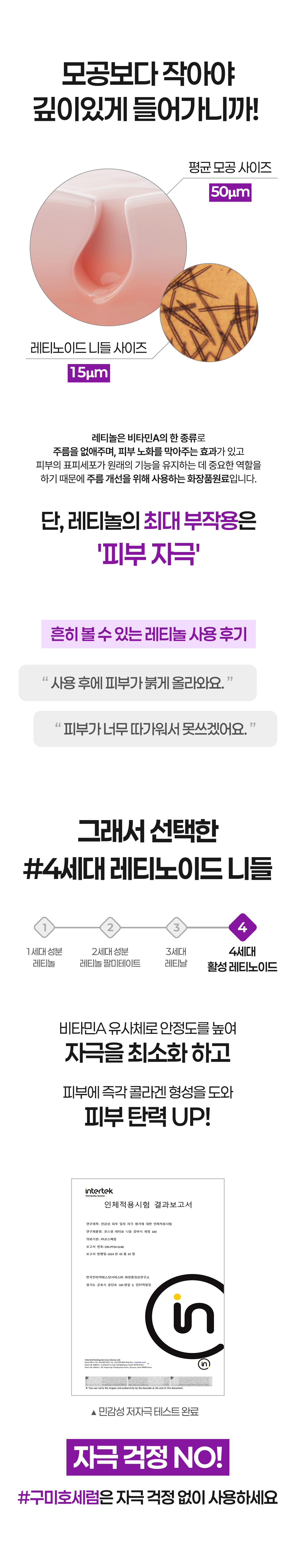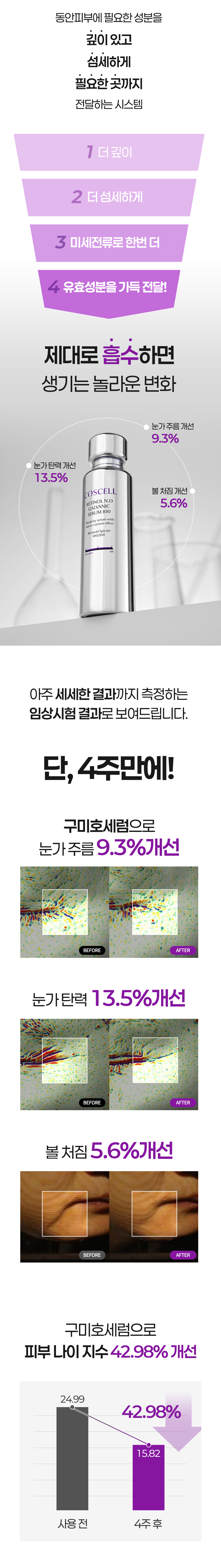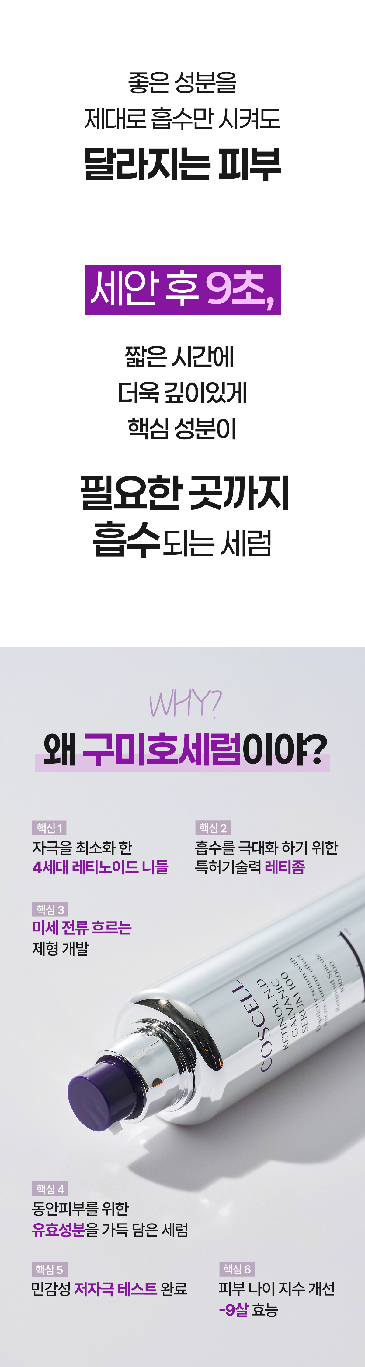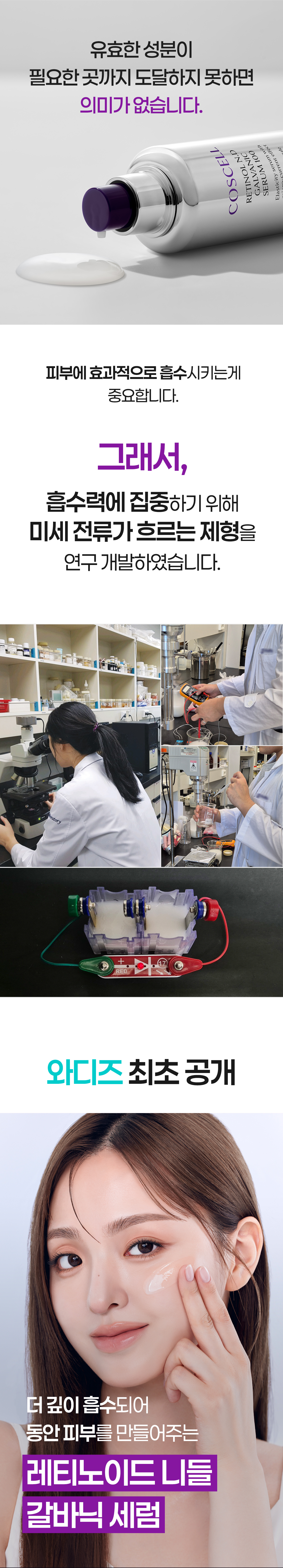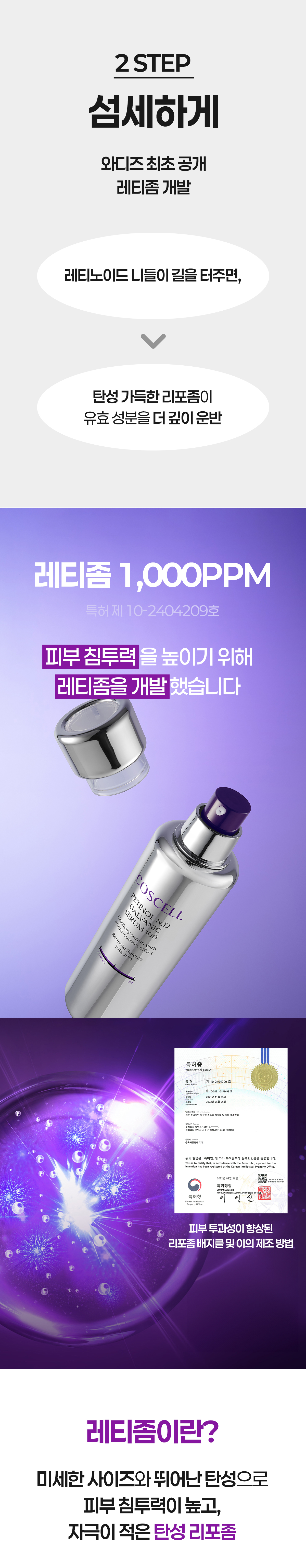 두번째로 순수 레티놀 경우 자극으로 고민하는 분들이 많죠? 그래서 특허 기술력인 탄성 리포좀 안에 순수 레티놀을 담아 피부에 좀 더 깊숙이 안전하게 전달 시킬수 있게 개발했어요! 이렇게 성분, 제형, 기술력 하나 하나 엄청 꼼꼼하게 최상급으로 만들기 위해 노력했고 그 노력한 결과물이 바로 "코스셀 레티놀 니들 갈바닉 세럼 100" 이라고 자신있게 말할 수 있어요!