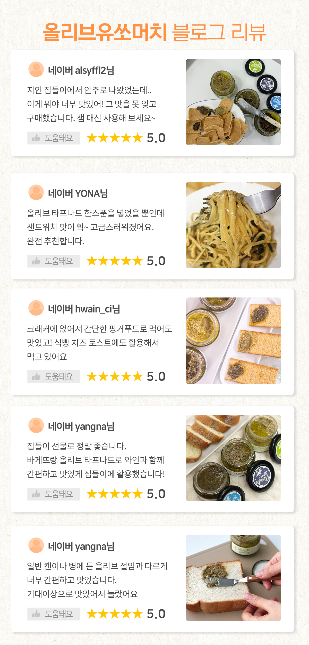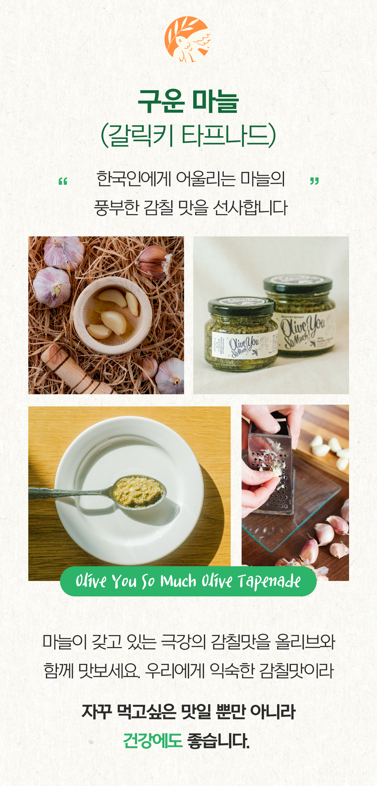 마켓 나갔을 때나, 이벤트 판매시 맛있다는 평가를 많이 받았어요. 갈릭키 타프나드를 드셔보시고는 정말 맛있다며 엄지 척! 드셔보신 분들은 좋은 제품인지 아시더라구요.