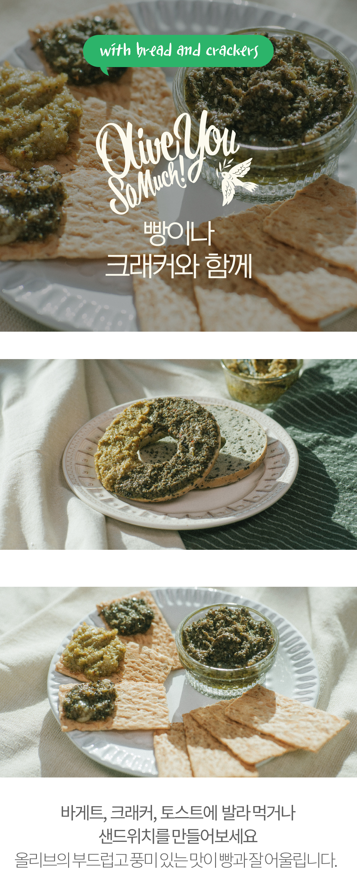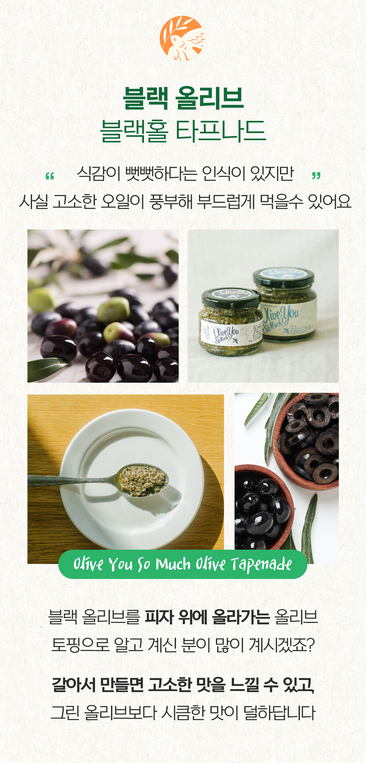 건강함을 살리면서도 한국인의 입맞에 맞게 만들었습니다. 갈아서 만들었기 때문에 올리브의 고소함은 그대로라 올리브를 싫어하는 분들도 편하게 드실 수 있으실 거에요.