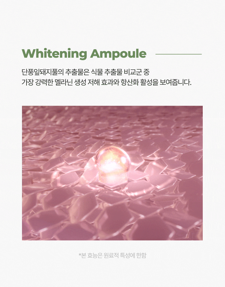 "Revolutionary brightening antioxidant power combined with natural ingredients and a refreshing formula! Proudly presenting our patented maple leaf pigweed extract ampoule. Experience clear radiant skin with this ampoule."
