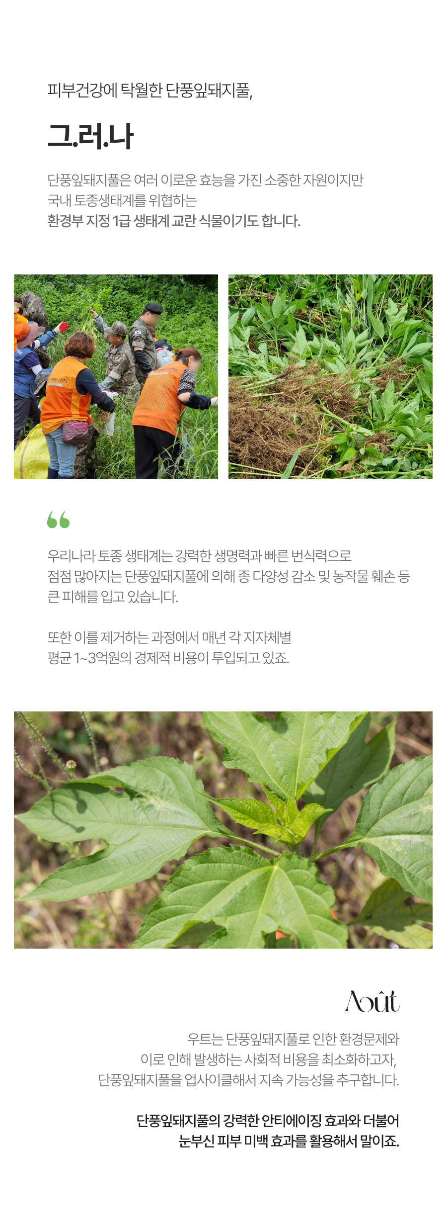 단풍잎돼지풀은 피부 미용 분야에서 주목 받고 있는 자원 식물이기도 합니다. 단풍잎돼지풀추출물은 다른 식물 추출물 대비 뛰어난 미백 효과와 항산화 효능을 가지고 있습니다. 우트는 단풍잎돼지풀이 피부에 주는 효능에 집중하여 단풍잎돼지풀의 가치를 담은 풀로 미백 흔적 앰플을 개발했습니다. 단풍잎돼지풀은 지속적인 연구와 관리가 필요합니다. 우트는 생태계교란식물의 쓰임새를 찾고 꾸준히 모니터링함으로써 생태계를 보호하여 지속가능한 미래를 위해 앞장서고자 합니다. 나의 피부에 선물을, 자연에 도움을. 앰플 한 병의 가치 있는 소비를 통해 우트의 뜻에 함께해주세요.