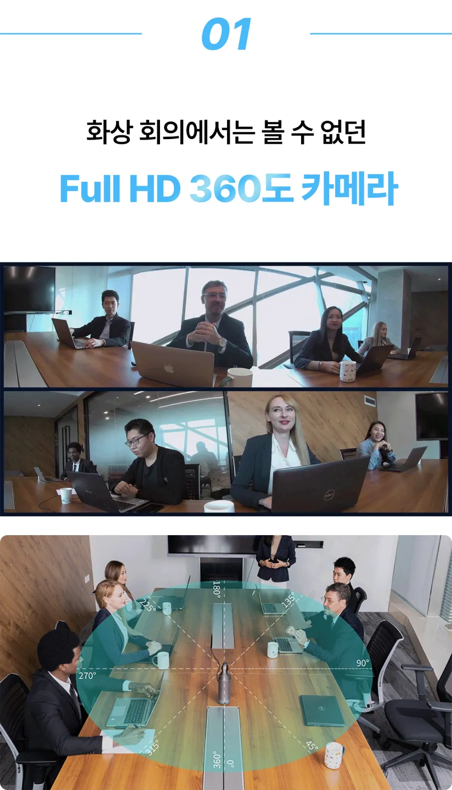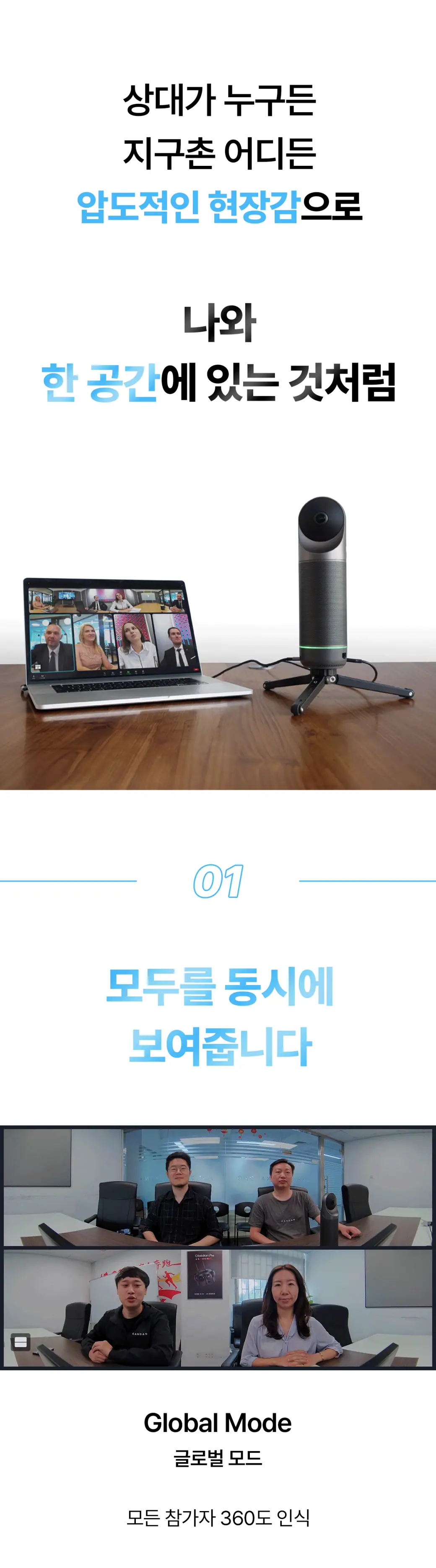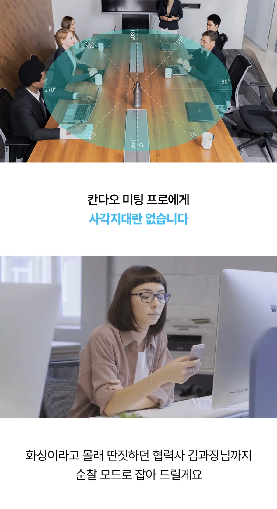 모든 각도에서의 완벽한 협업을 만들어낼 수 있는 비밀, 우리의 공간을 상대방에게 360도로 전달하는 현장감 덕분입니다. 모든 참석자들이 한눈에 보이는 화면을 바라보면서 미팅의 상대방은 마치 우리와 한 공간에 있는 듯한 착각에 빠지게 될 거예요.