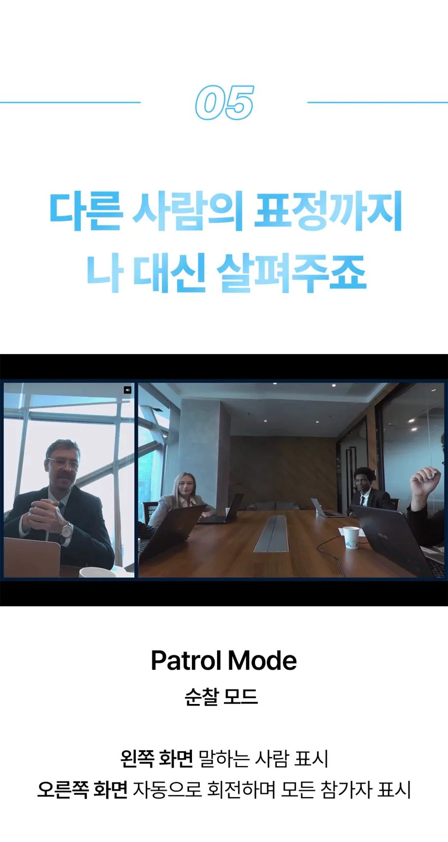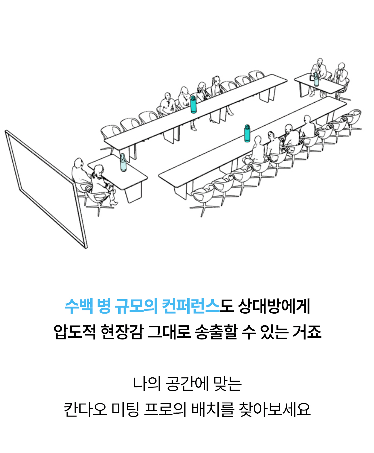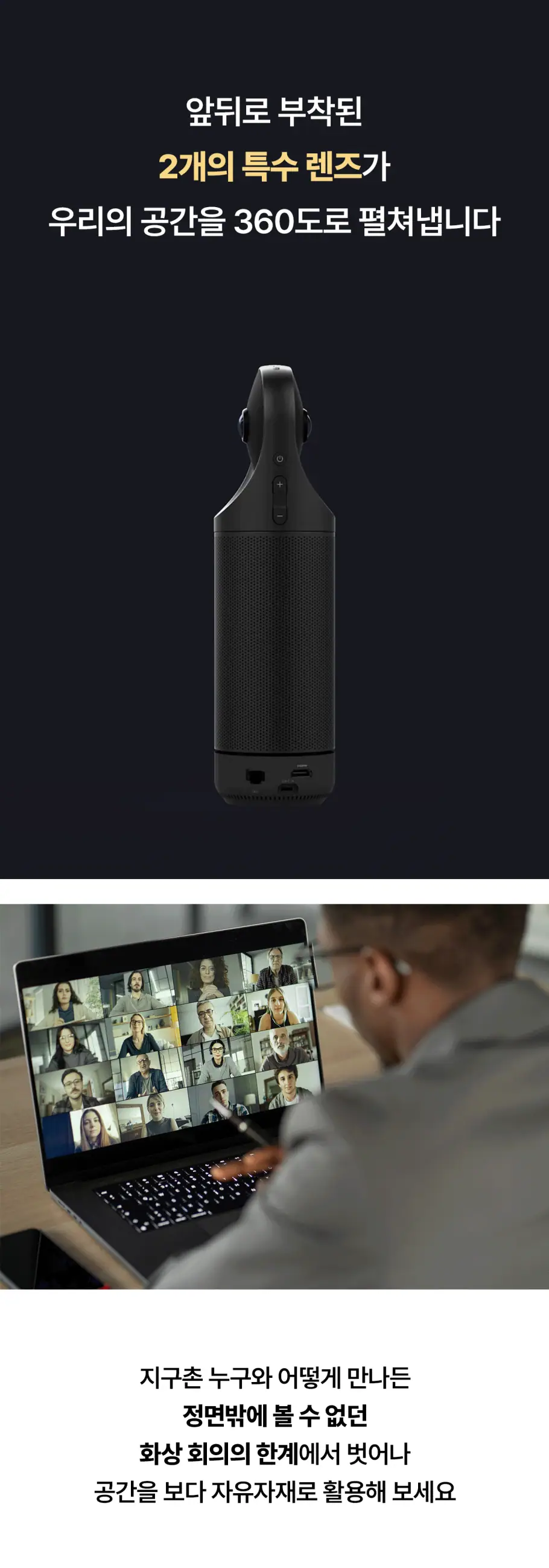 모든 각도에서의 완벽한 협업을 만들어낼 수 있는 비밀, 우리의 공간을 상대방에게 360도로 전달하는 현장감 덕분입니다. 모든 참석자들이 한눈에 보이는 화면을 바라보면서 미팅의 상대방은 마치 우리와 한 공간에 있는 듯한 착각에 빠지게 될 거예요.