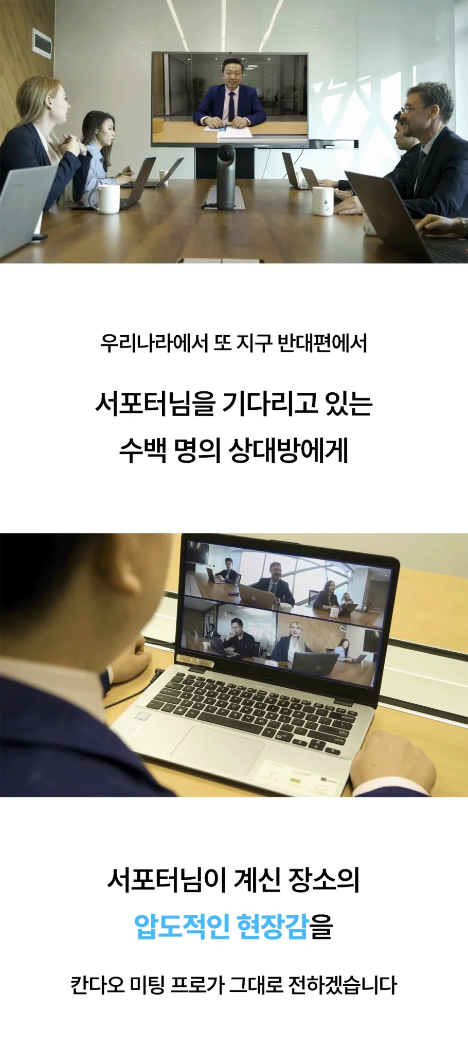 360도로 오프라인 공간을 압도적인 현장감으로 전달하고, 서포터님의 의사가 최적으로 전달될 수 있는 다양한 모드들과 기능을 지원하죠. 설령 소통의 능력이 조금 부족하더라도 칸다오 미팅 프로는 이를 훌륭하게 보완해 서포터님들이 원하는 방향으로 소통이 마무리 되는 즐거움을 선보일 겁니다. 물론 그 과정에서 상처를 받거나 아쉬움에 입맛을 다셔야 하는 사람은 없을 테고요.