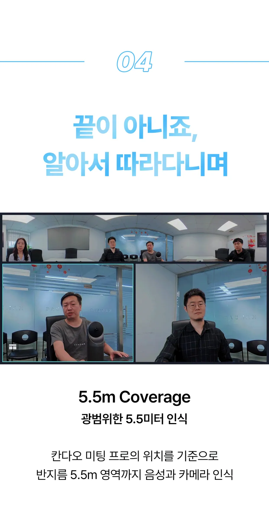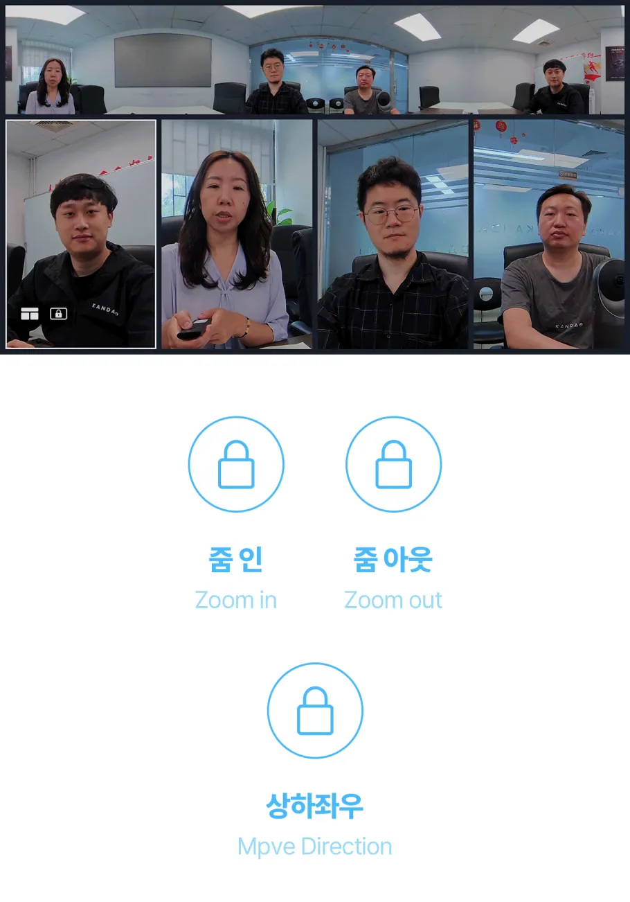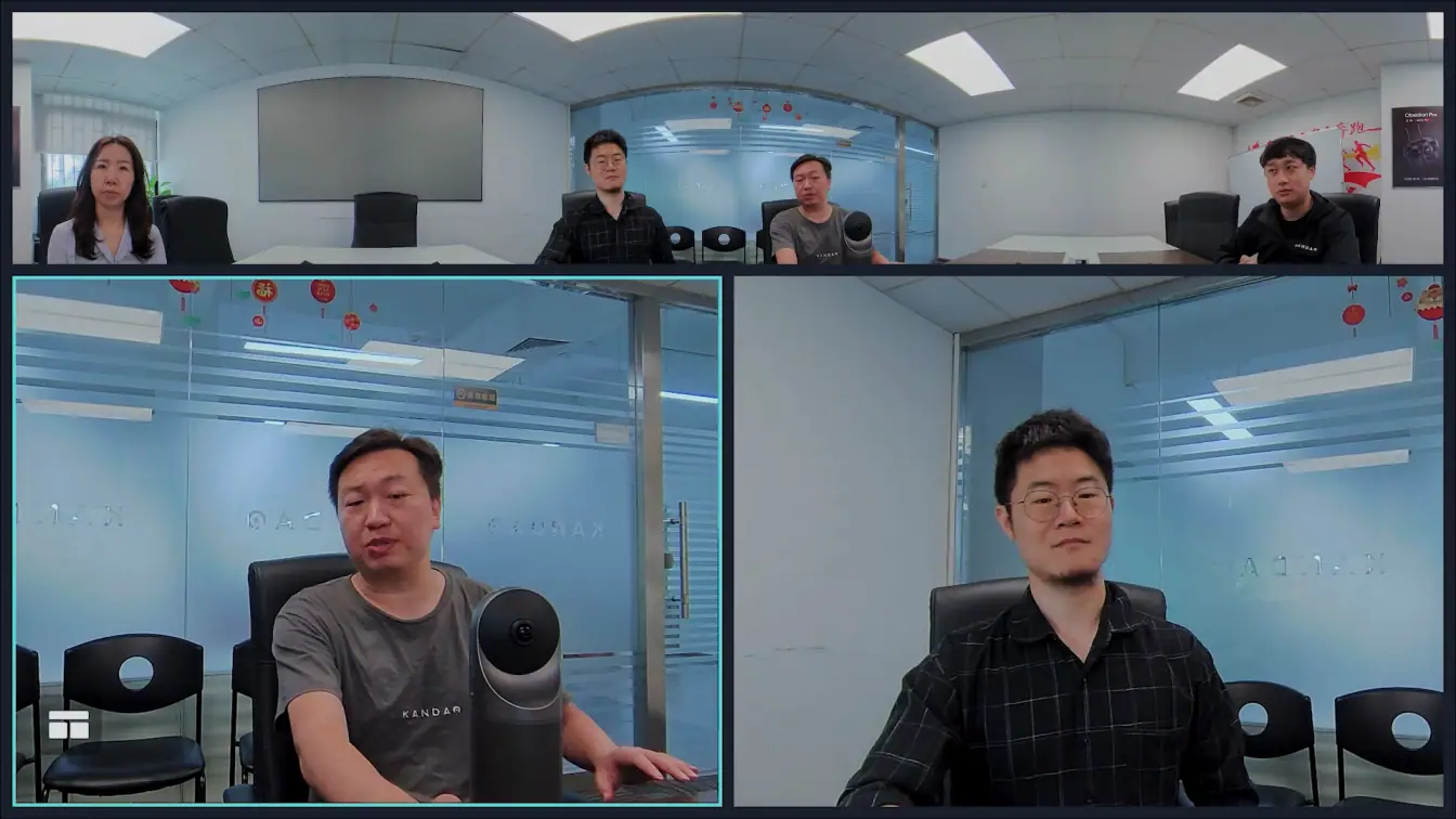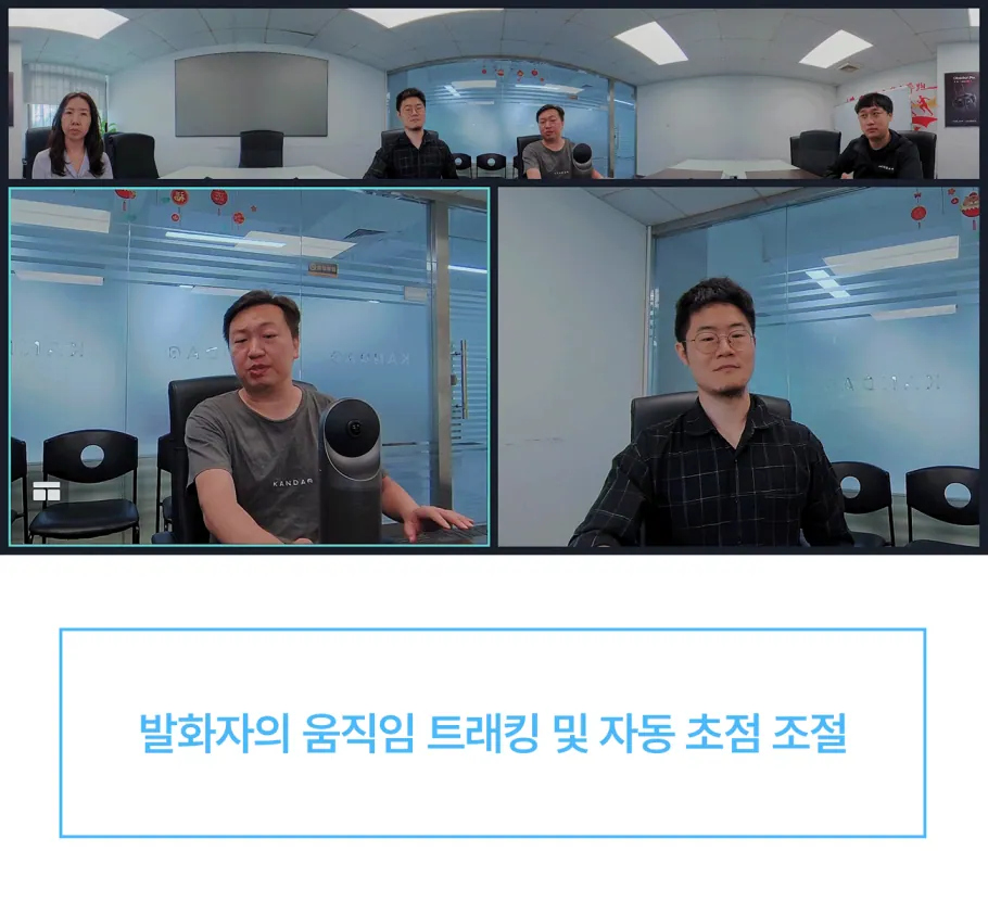 공간을 인식하면, 칸다오 미팅 프로 안에 자체적으로 내장된 시스템이 이 화면을 합쳐 상대방에게 360도 화면으로 전송합니다. 그간 화상 미팅에서 한 번도 상상해 본 적 없던 360도의 현장감이 탄생하는 순간이죠.