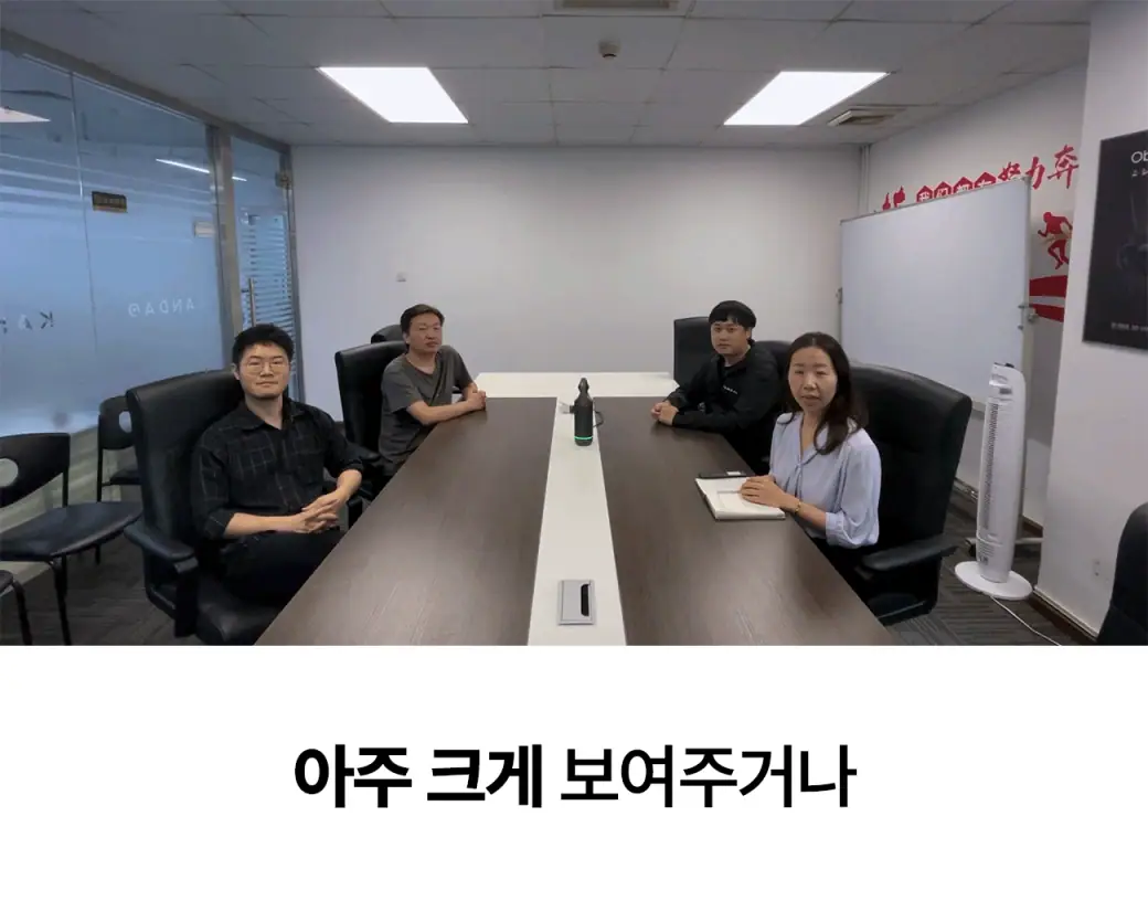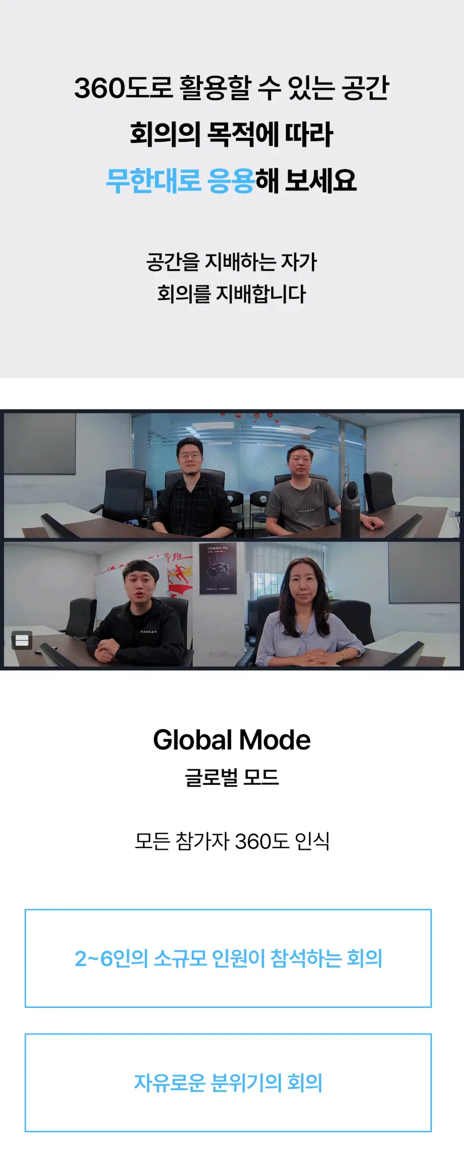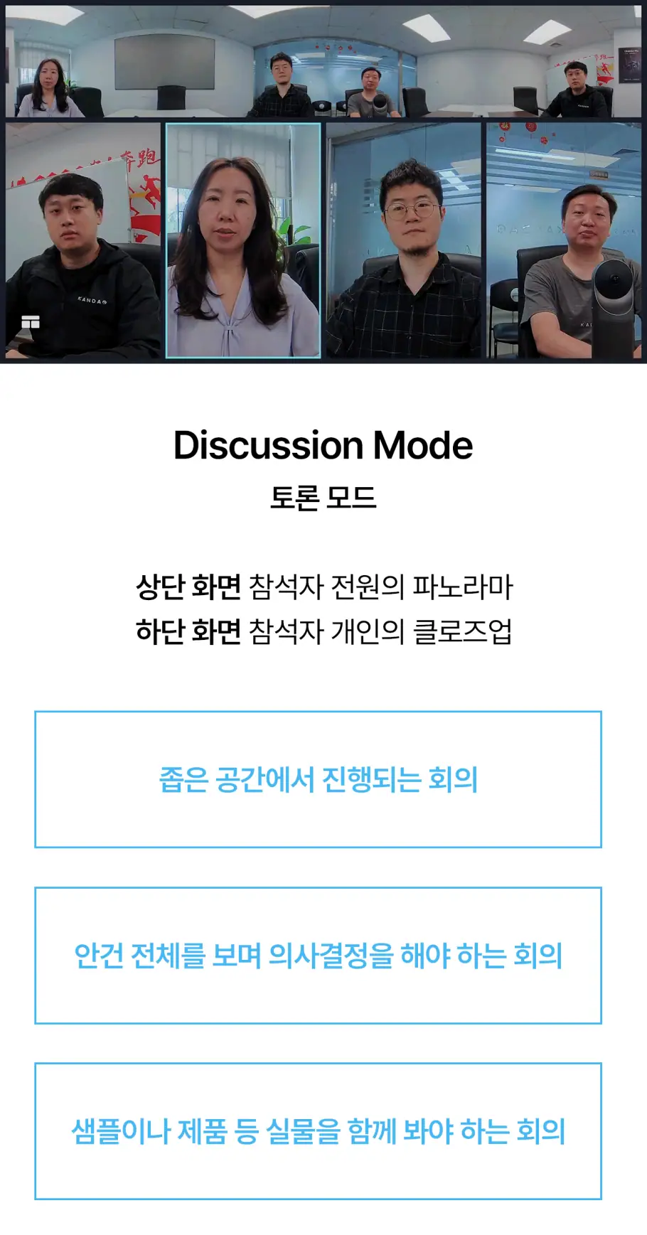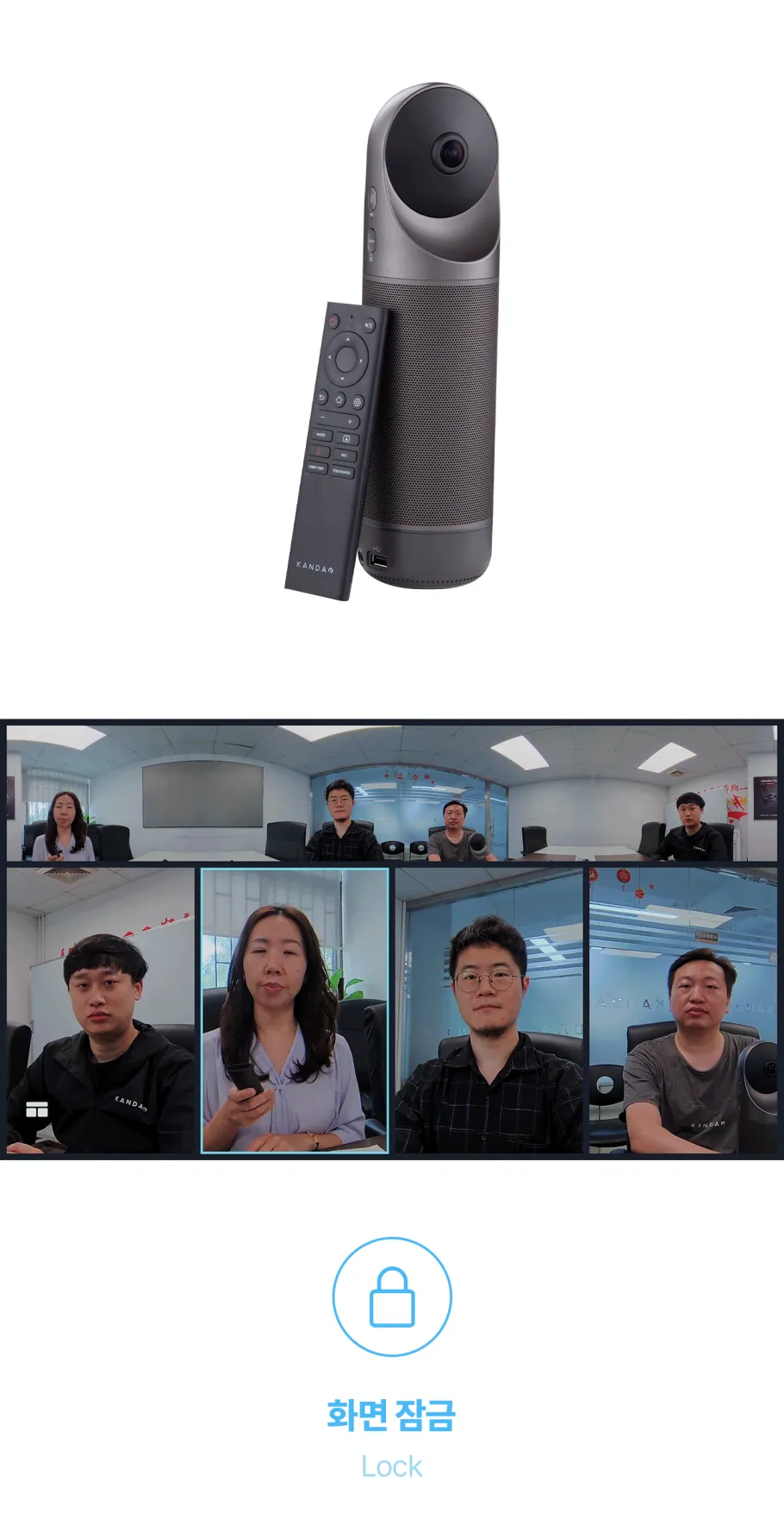 공간을 인식하면, 칸다오 미팅 프로 안에 자체적으로 내장된 시스템이 이 화면을 합쳐 상대방에게 360도 화면으로 전송합니다. 그간 화상 미팅에서 한 번도 상상해 본 적 없던 360도의 현장감이 탄생하는 순간이죠.