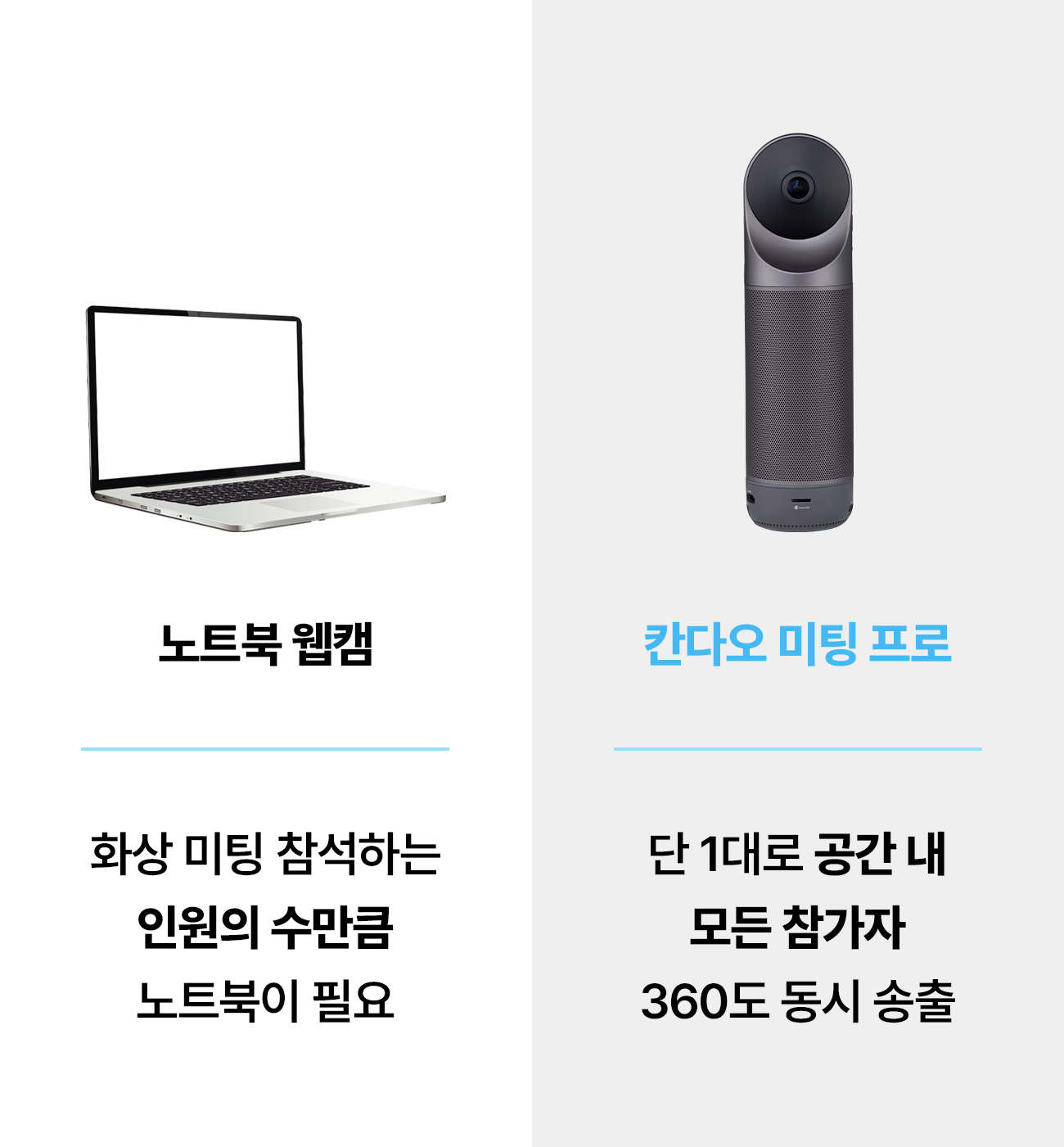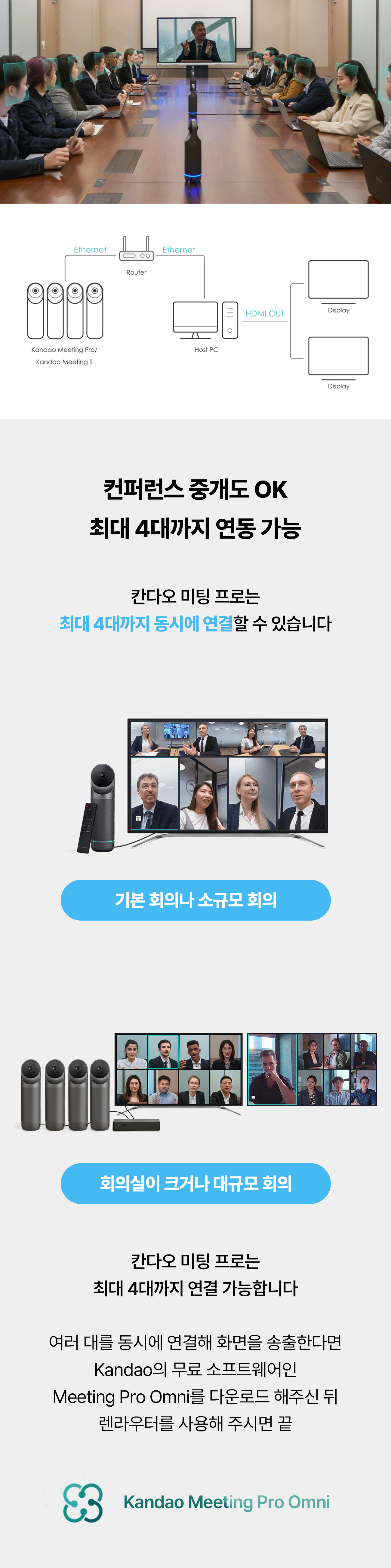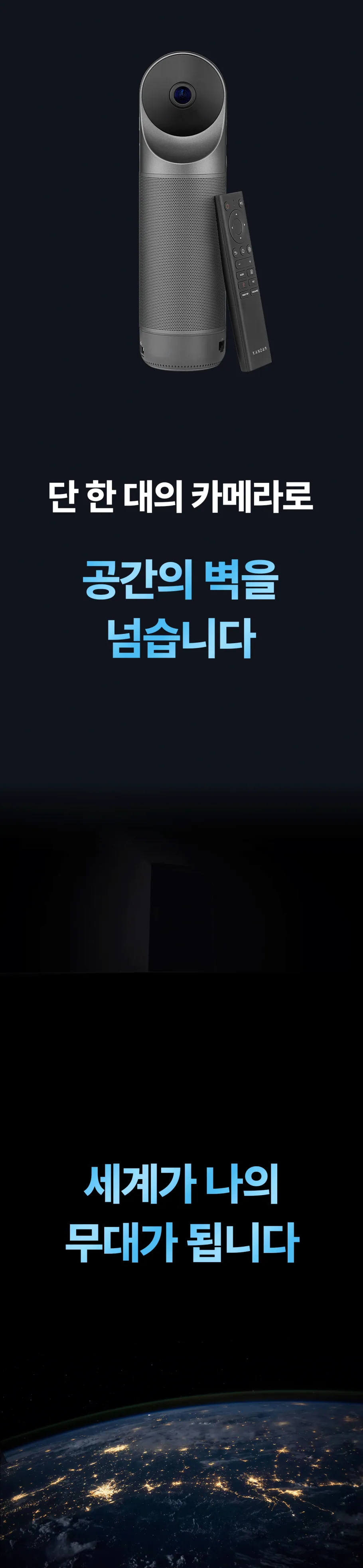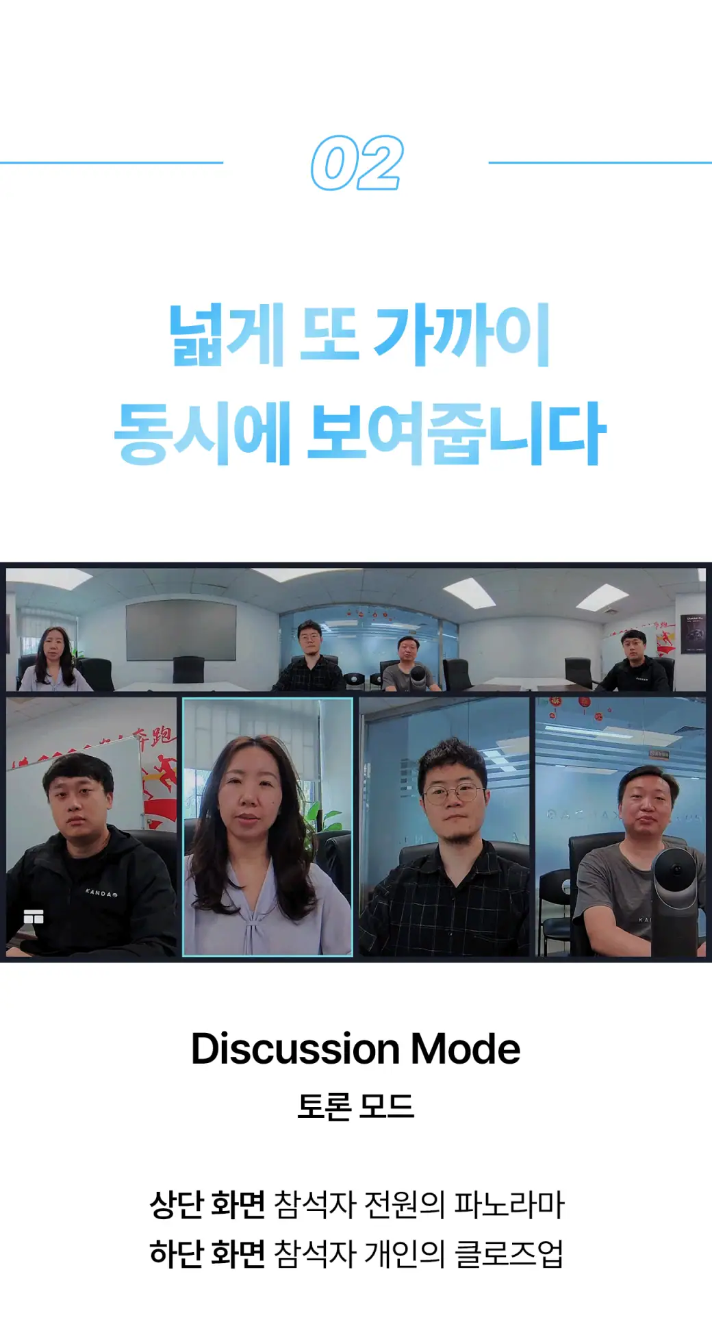 공간을 인식하면, 칸다오 미팅 프로 안에 자체적으로 내장된 시스템이 이 화면을 합쳐 상대방에게 360도 화면으로 전송합니다. 그간 화상 미팅에서 한 번도 상상해 본 적 없던 360도의 현장감이 탄생하는 순간이죠.