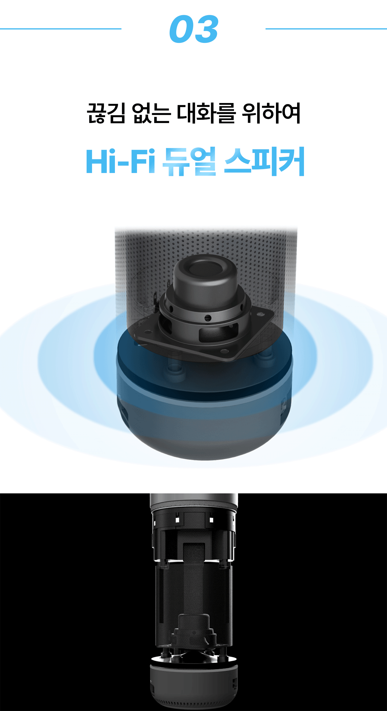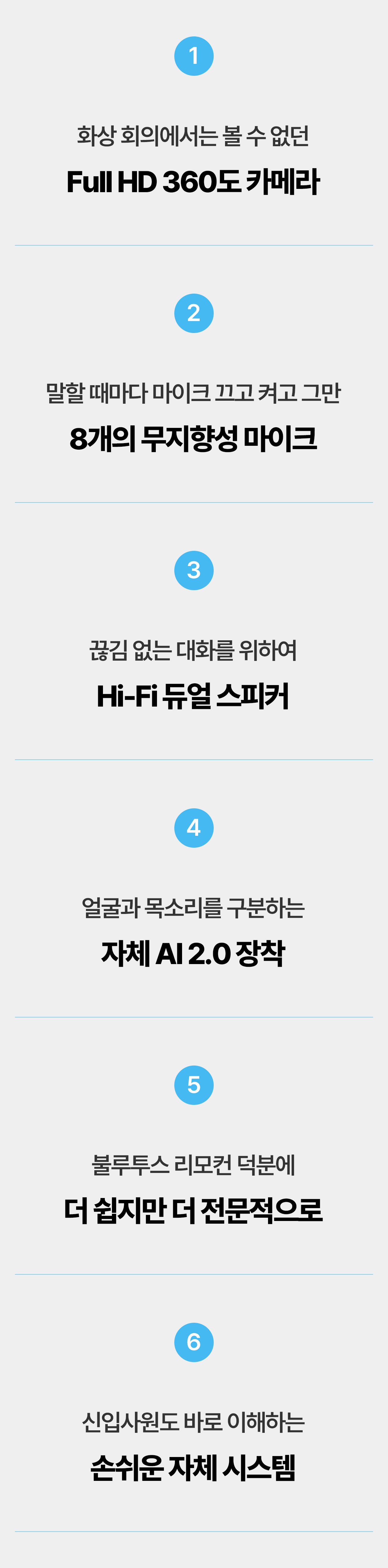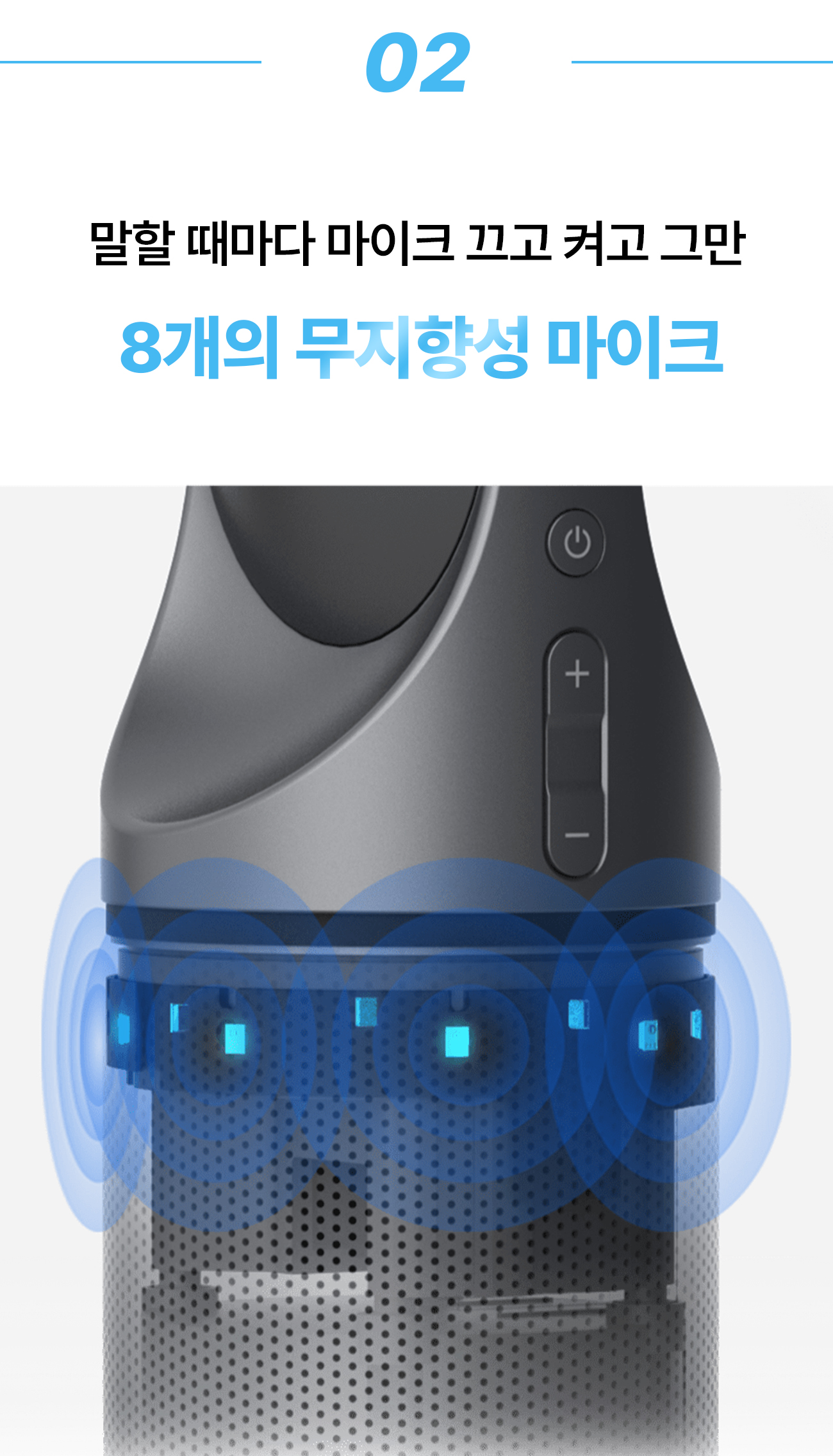 먼 거리의 의견을 상대방에게 전하던 8대의 무지향성 마이크처럼, 상대방의 작은 의견까지 놓치지 않고 들려 드릴 듀얼 Hi-Fi 스피커를 장착했습니다. 360도의 원통형을 잘 살려 어느 곳에서나 고른 음향 기술을 선보입니다
