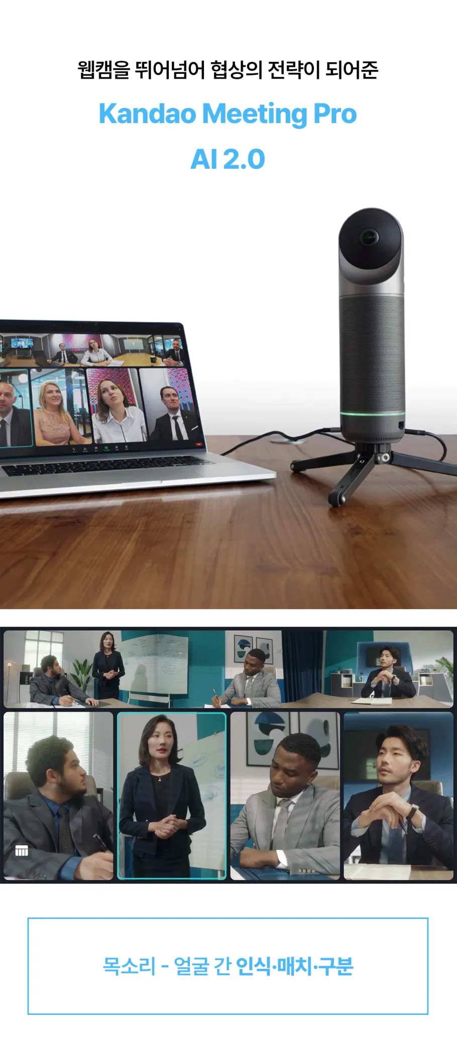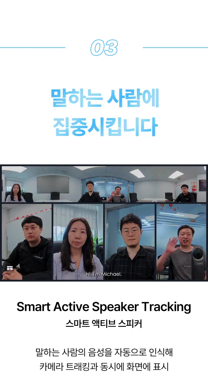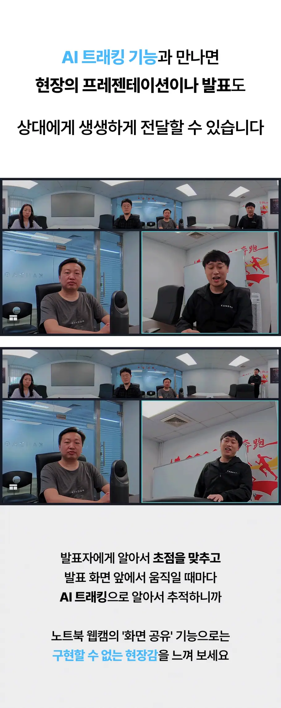 말하는 사람의 목소리를 얼굴과 매치 시키고, 발표하는 사람의 움직임을 쫓아 초점을 알아서 맞춰주기까지. 존의 노트북 웹캠에서는 기대할 수 없던 기능들이 가능한 이유, 칸다오 미팅 프로의 자체 AI 2.0 덕분입니다.