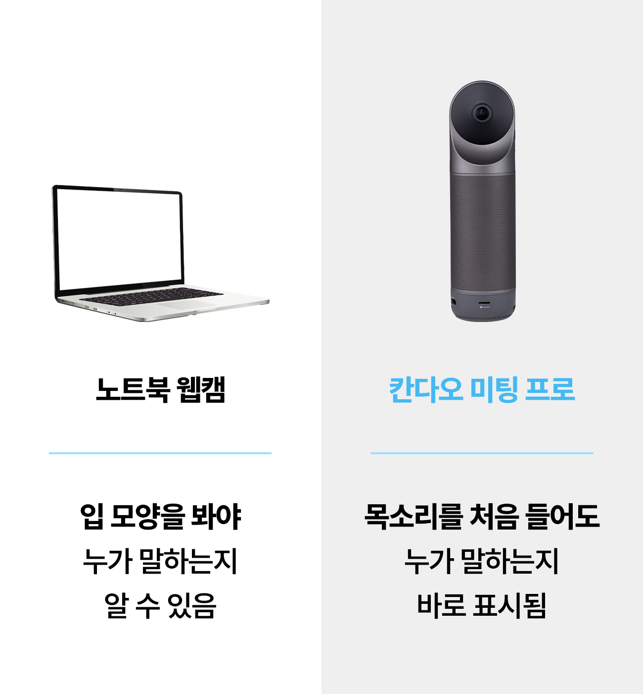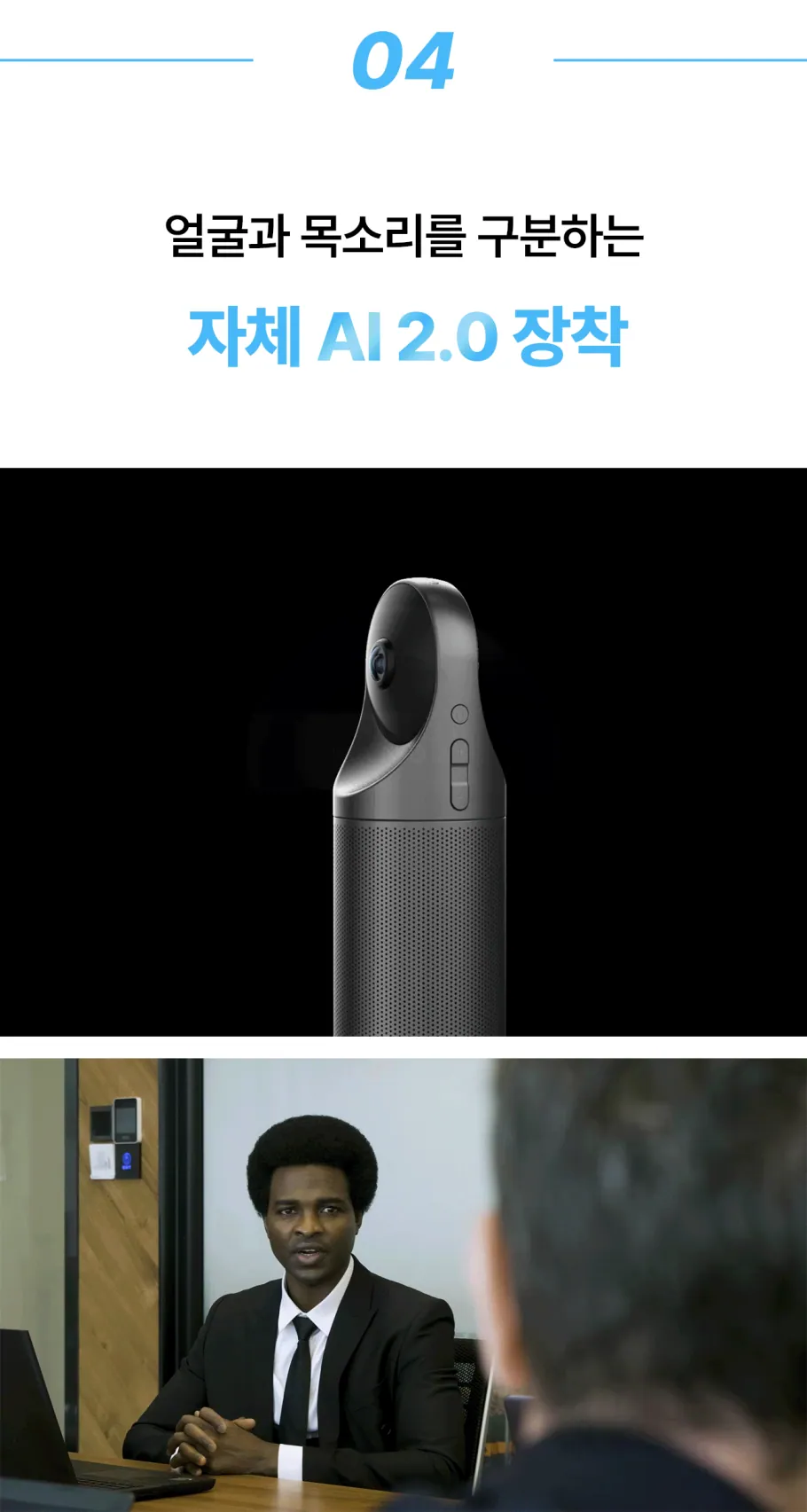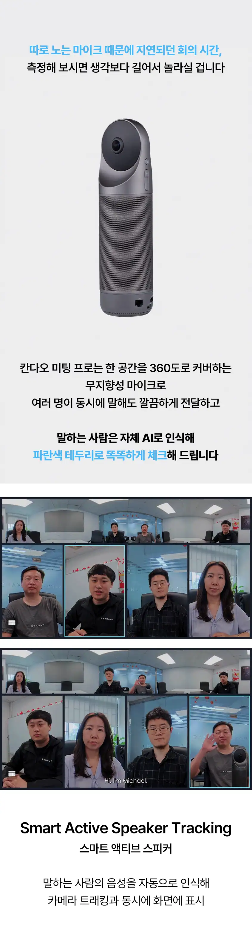 말하는 사람의 목소리를 얼굴과 매치 시키고, 발표하는 사람의 움직임을 쫓아 초점을 알아서 맞춰주기까지. 존의 노트북 웹캠에서는 기대할 수 없던 기능들이 가능한 이유, 칸다오 미팅 프로의 자체 AI 2.0 덕분입니다.