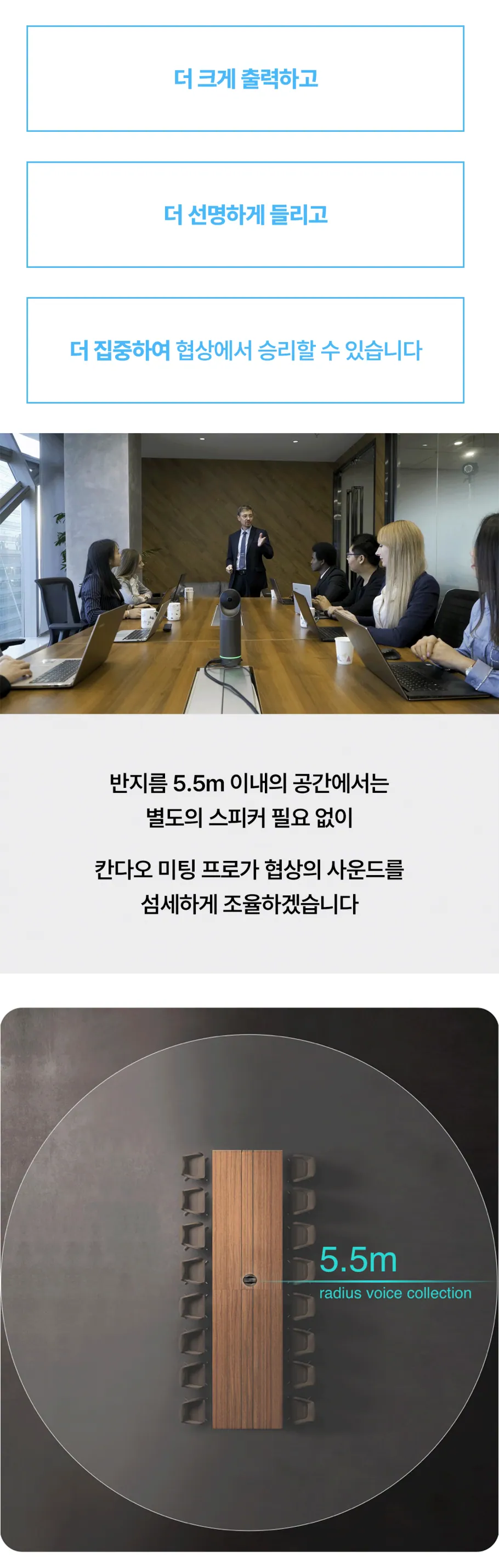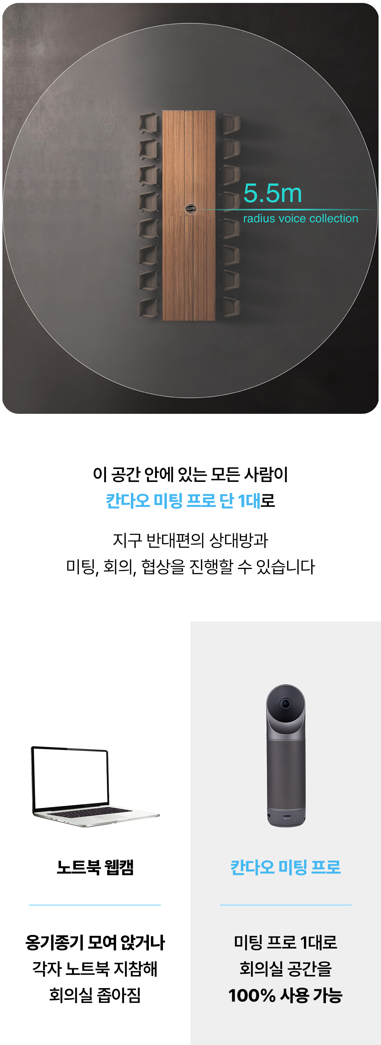 5.5m 반지름의 공간을 단 1대로 커버할 수 있는 칸다오 미팅 프로. 멀리서 나온 작은 의견까지 소중하기에 무지향성 마이크 8개를 균일하게 배치하여 수준 높은 전달력을 구현했습니다.