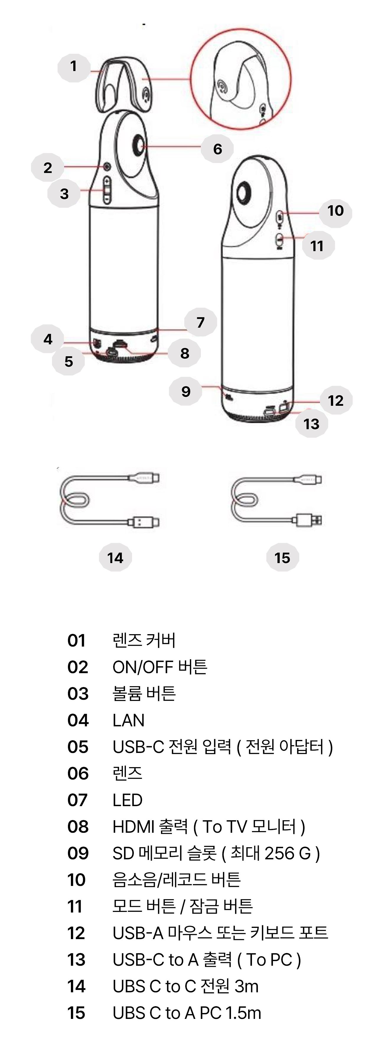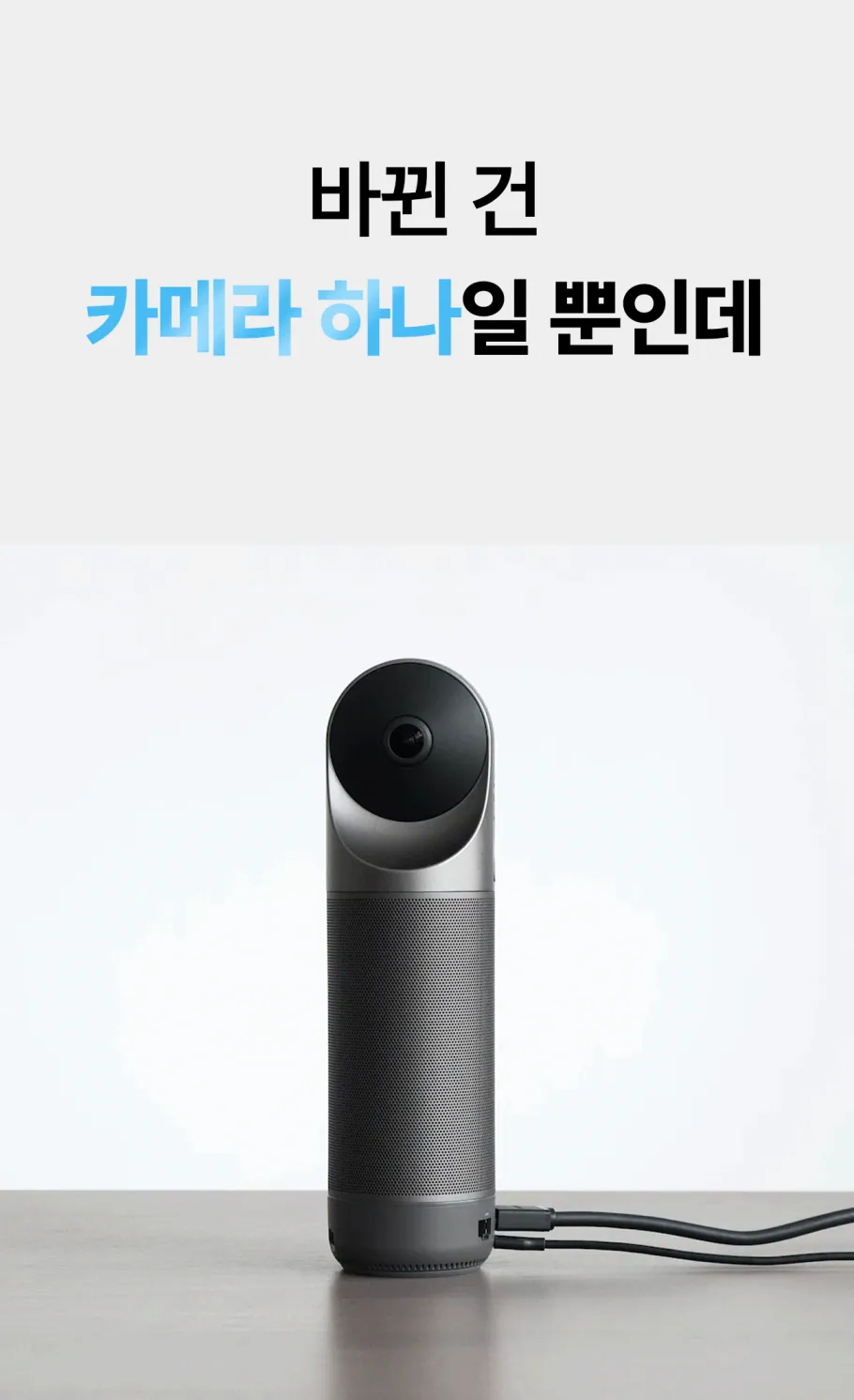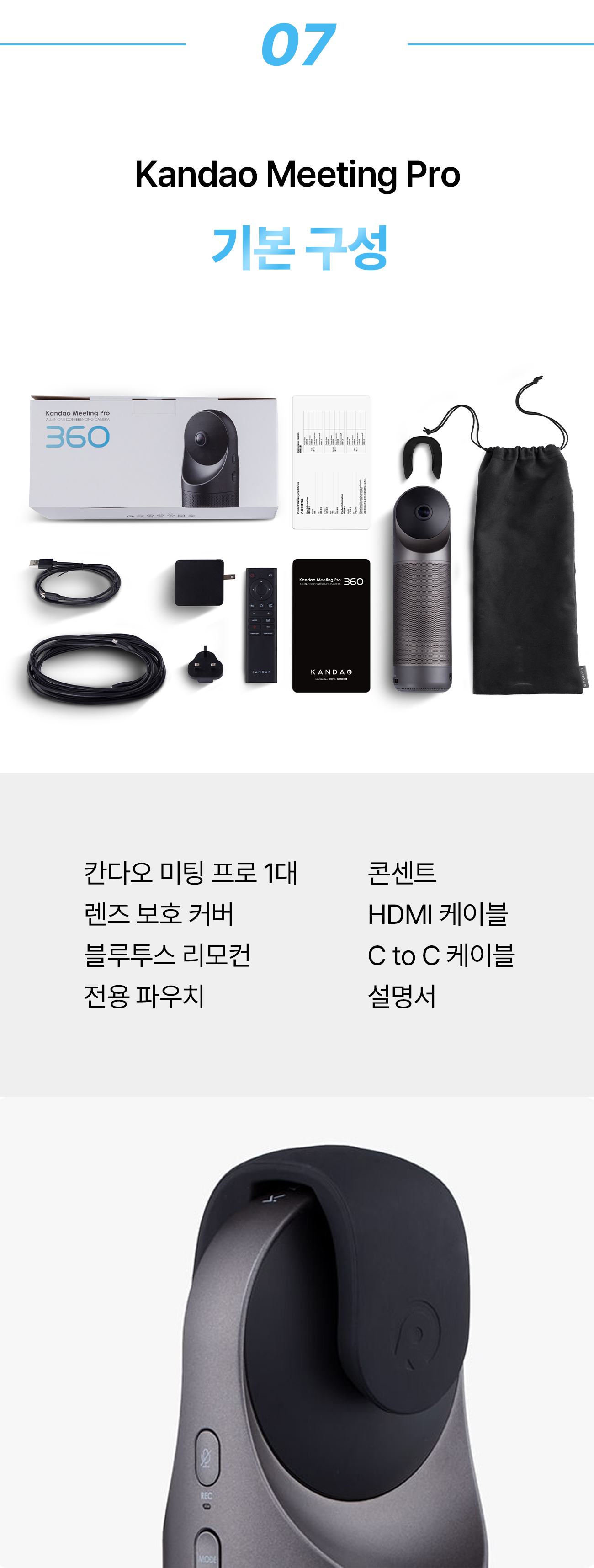칸다오 미팅 프로를 사용하지 않을 때에는 렌즈 보호 커버를 위에서 아래로 끼워 렌즈를 보호해 주세요. 360도의 드넓은 공간감을 확보하기 위해 특수 렌즈 2개가 내장되어 있는데, 렌즈의 소재 특성 상 유리로 제작되어 있어 떨어지거나 큰 충격을 받으면 렌즈가 깨질 수 있습니다.