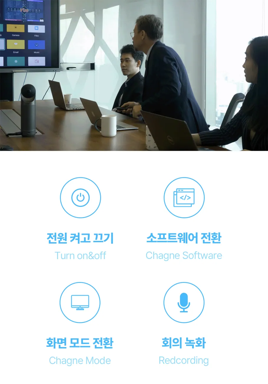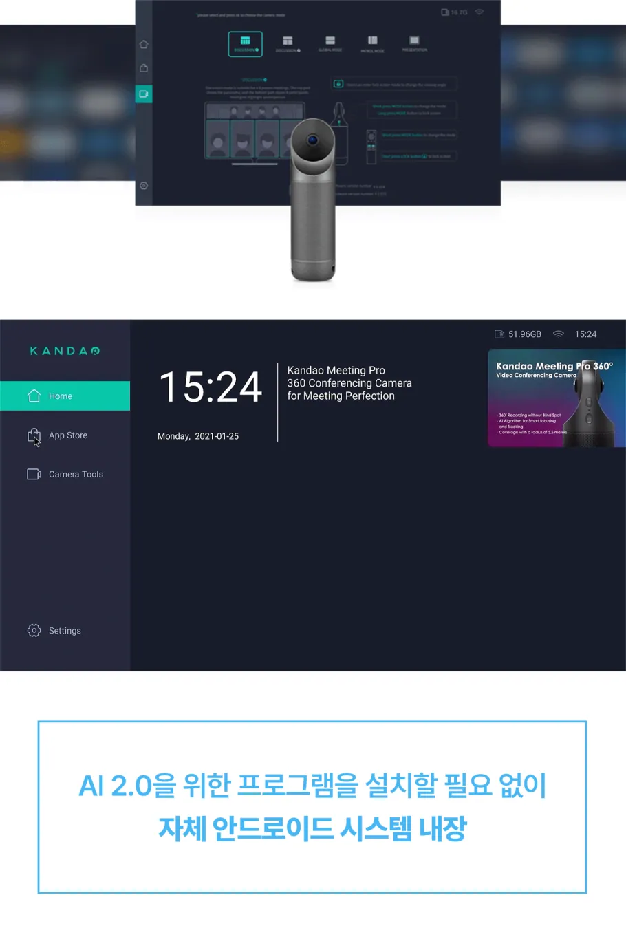회의 한 번 할 때마다 이런저런 프로그램을 깔아 복잡해진 노트북 바탕화면, 정리하실 때도 됐잖아요. 칸다오 미팅 프로에는 AI가 안드로이드 시스템으로 자체 내장되어 있어 펌웨어 업데이트부터 여러 화상 회의 플랫폼과의 연결까지 한번에 진행할 수 있습니다.