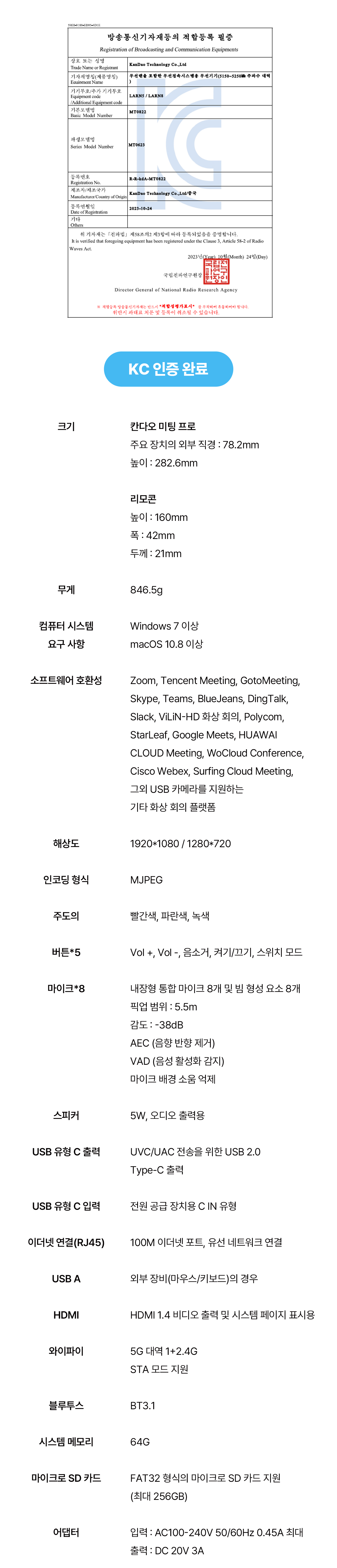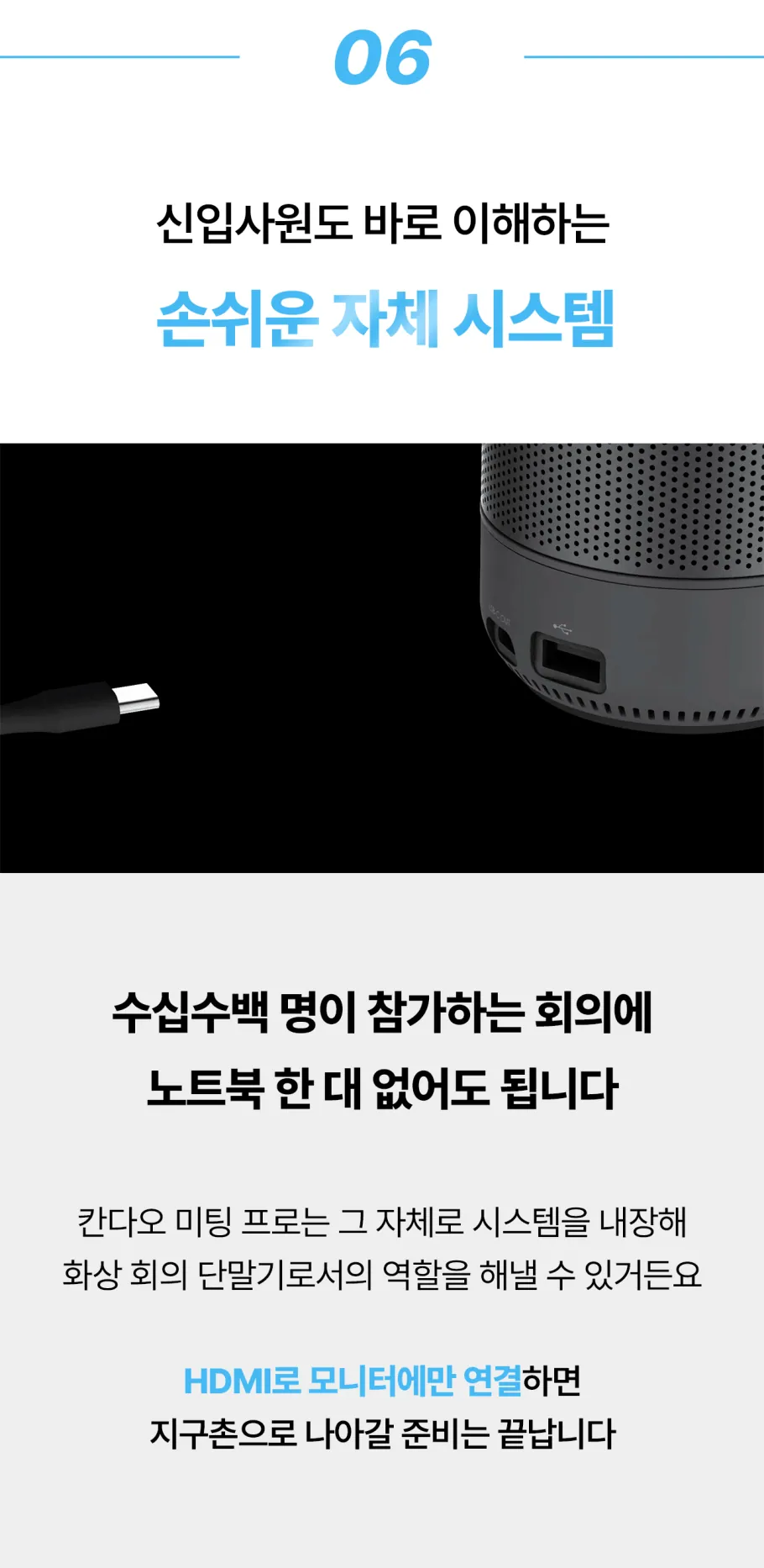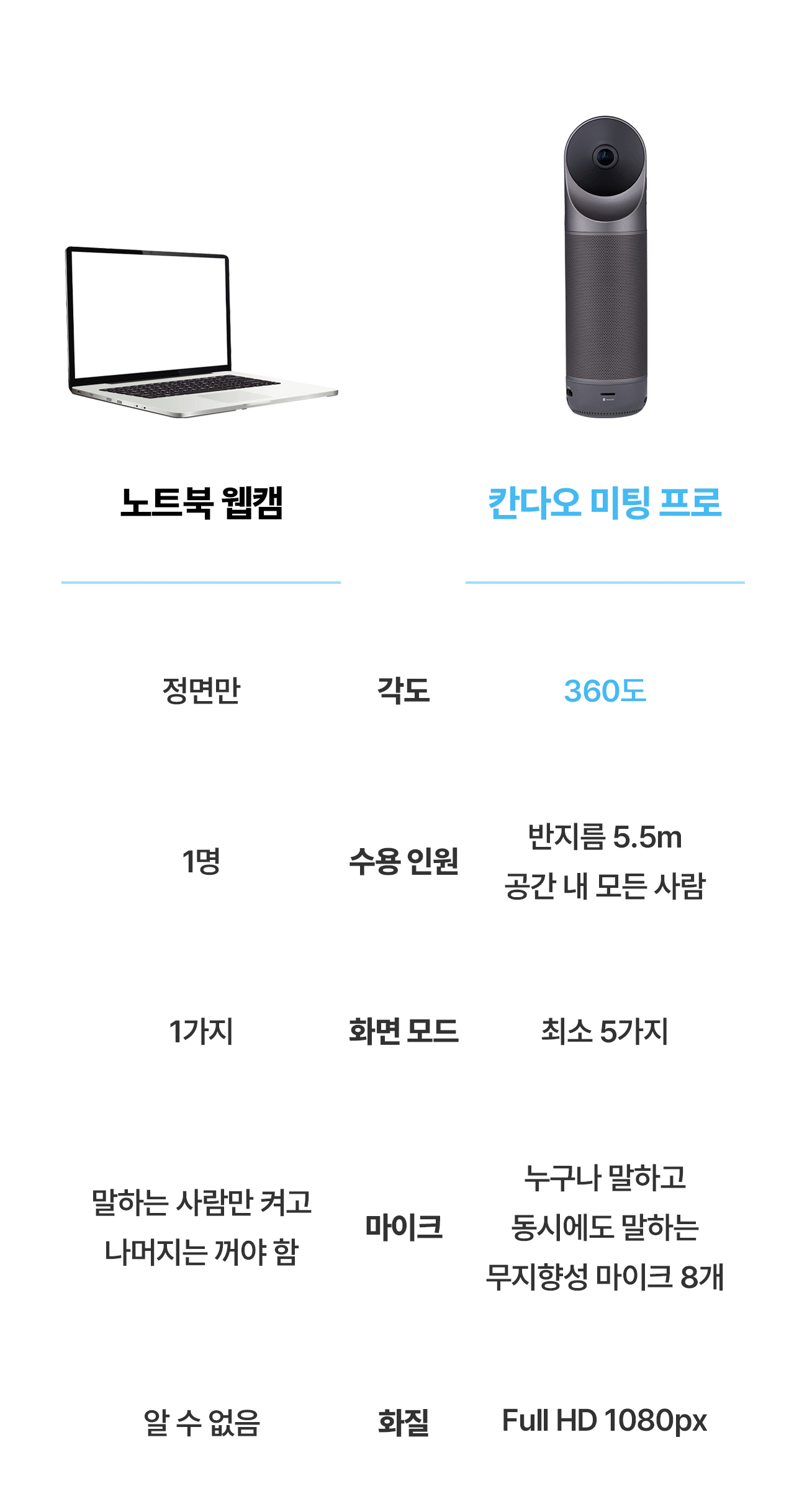 칸다오 미팅 프로의 유일한 단점은 미팅에 들어가기 전, 피부에 좀 더 신경을 쓰게 된다는 것? 작은 피부 트러블들까지 선명하게 전달이 되는 Full HD 1080p의 해상도 출력은 화상 회의가 아니라 비즈니스 영화의 한 장면 같을 겁니다.