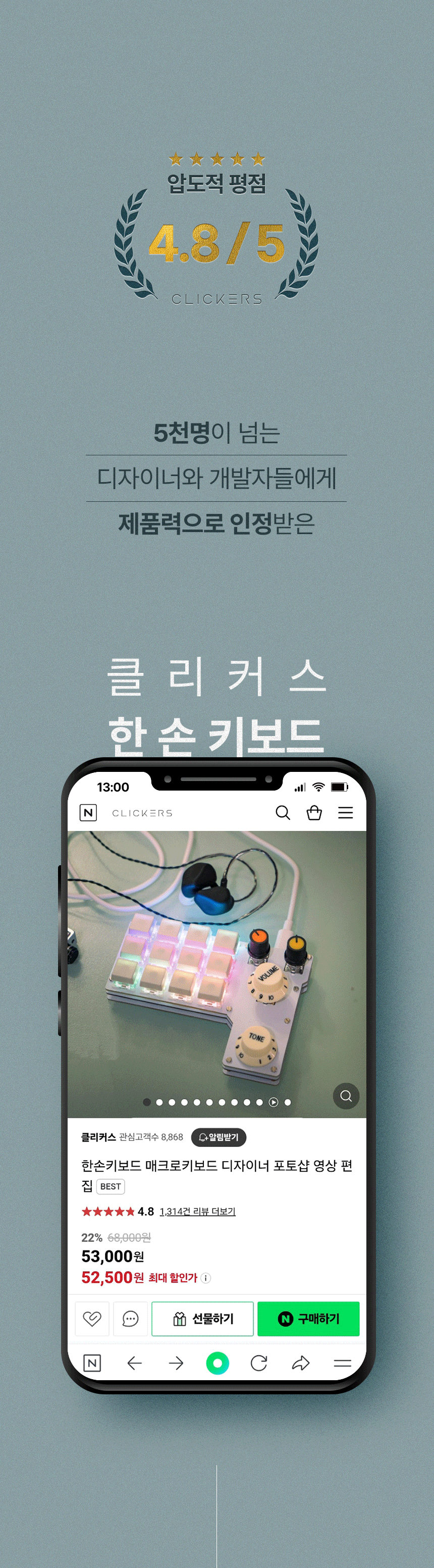 2022년, 2023년, 2024년까지 네이버 "한손 키보드", "매크로 키보드"에서 판매량기준 1위를 달성하고 있습니다.