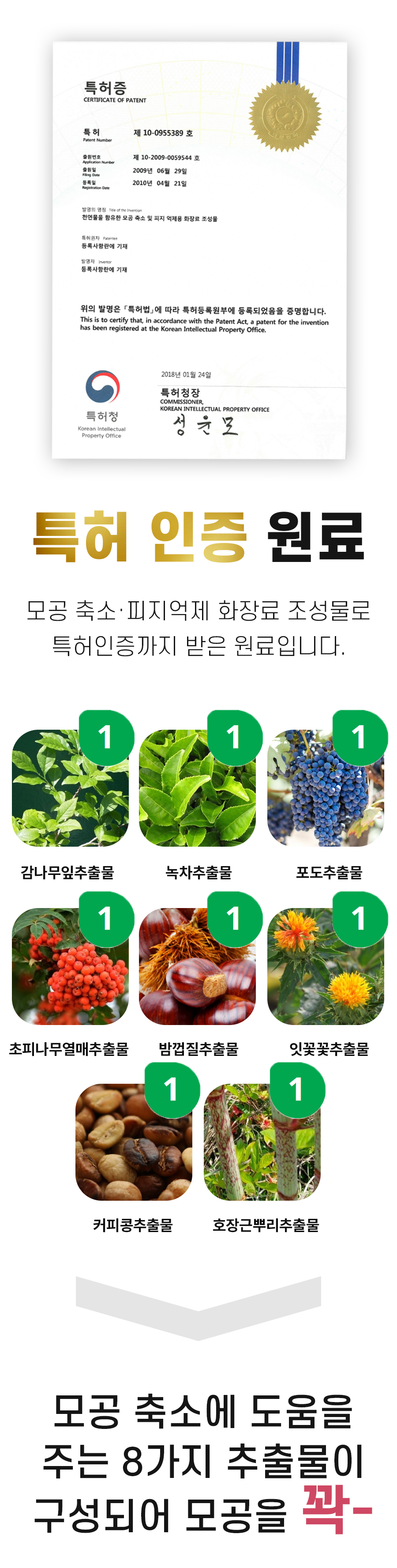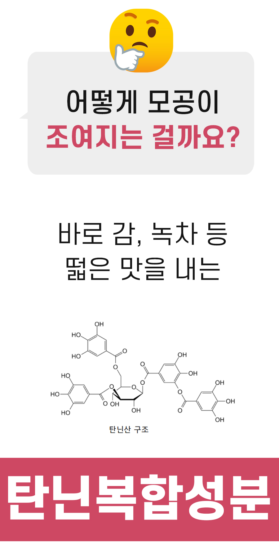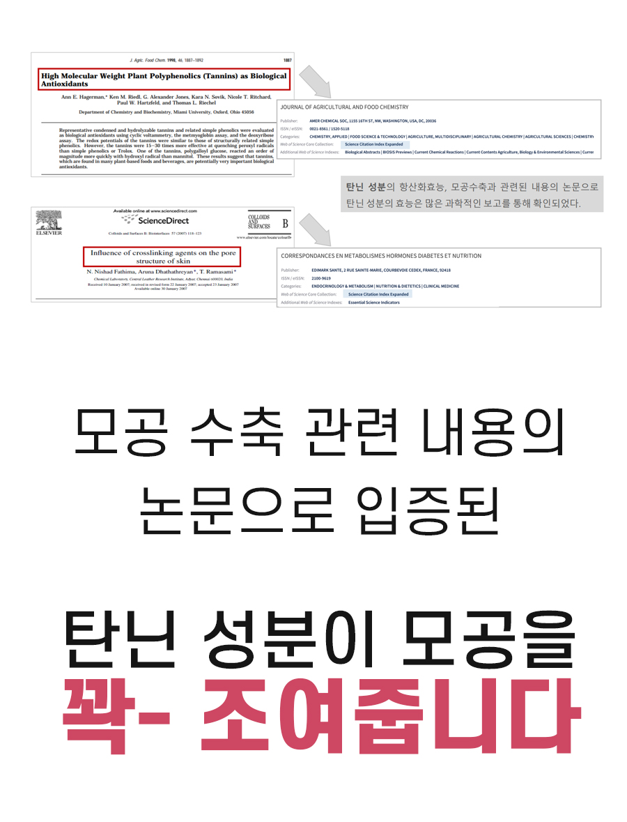 탄닌 성분은 피지 억제 기능 및 모공 수축 기능이 우수하여, 왕성한 피지 분비로 인한 모공 확장을 효과적으로 억제하여 건강한 피부 유지에 도움을 주는 효능이 있다고 합니다.