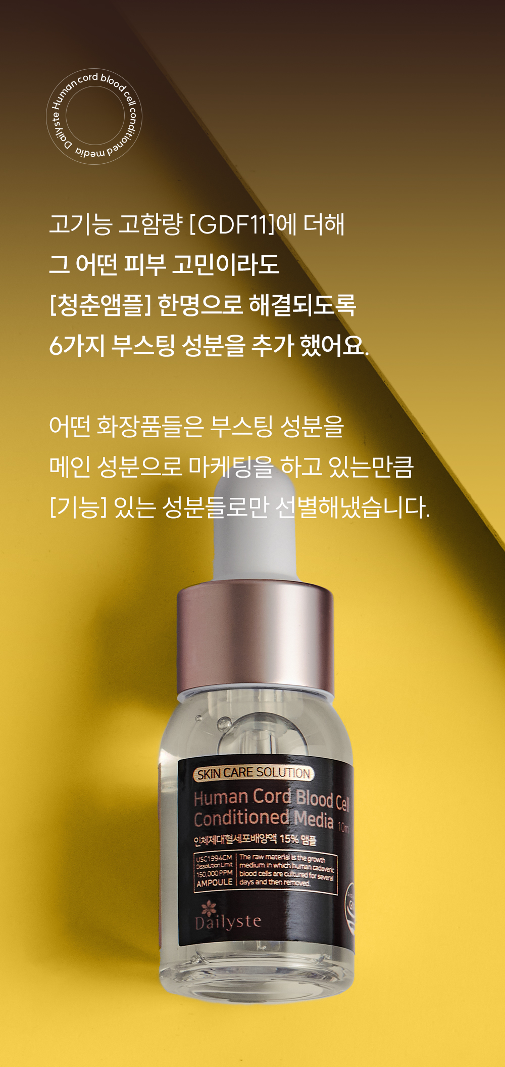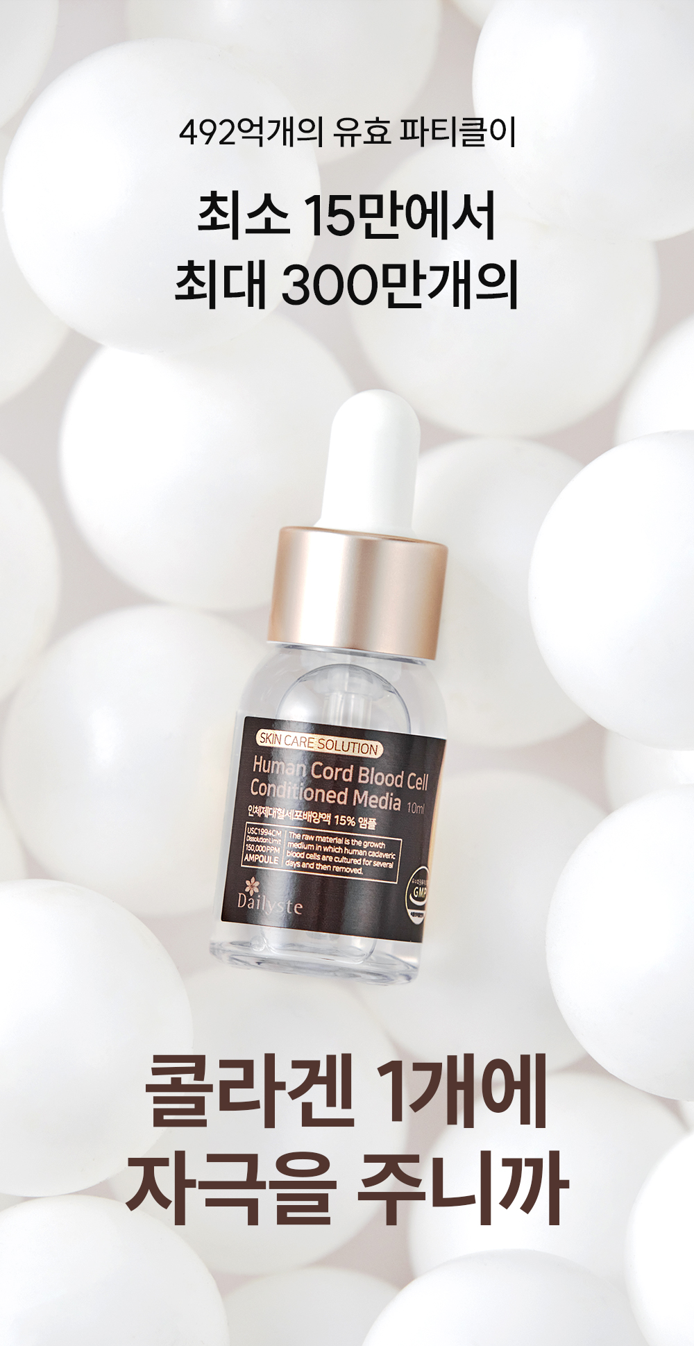 A. 데일리스테 인체제대혈세포배양액 15%앰플은 순수한 USC-CM 원액을 15% 고함량 함유한 제품으로, 유효성분을 소량 포함하여 동결건조시킨 원료나, 추출물을 사용한 제품들과 비교할 수 없는 유효성분 함량을 가지고 있습니다. 순수한 100% 인체제대혈세포배양액이 주는 극대화 된 효능을 느껴보세요.