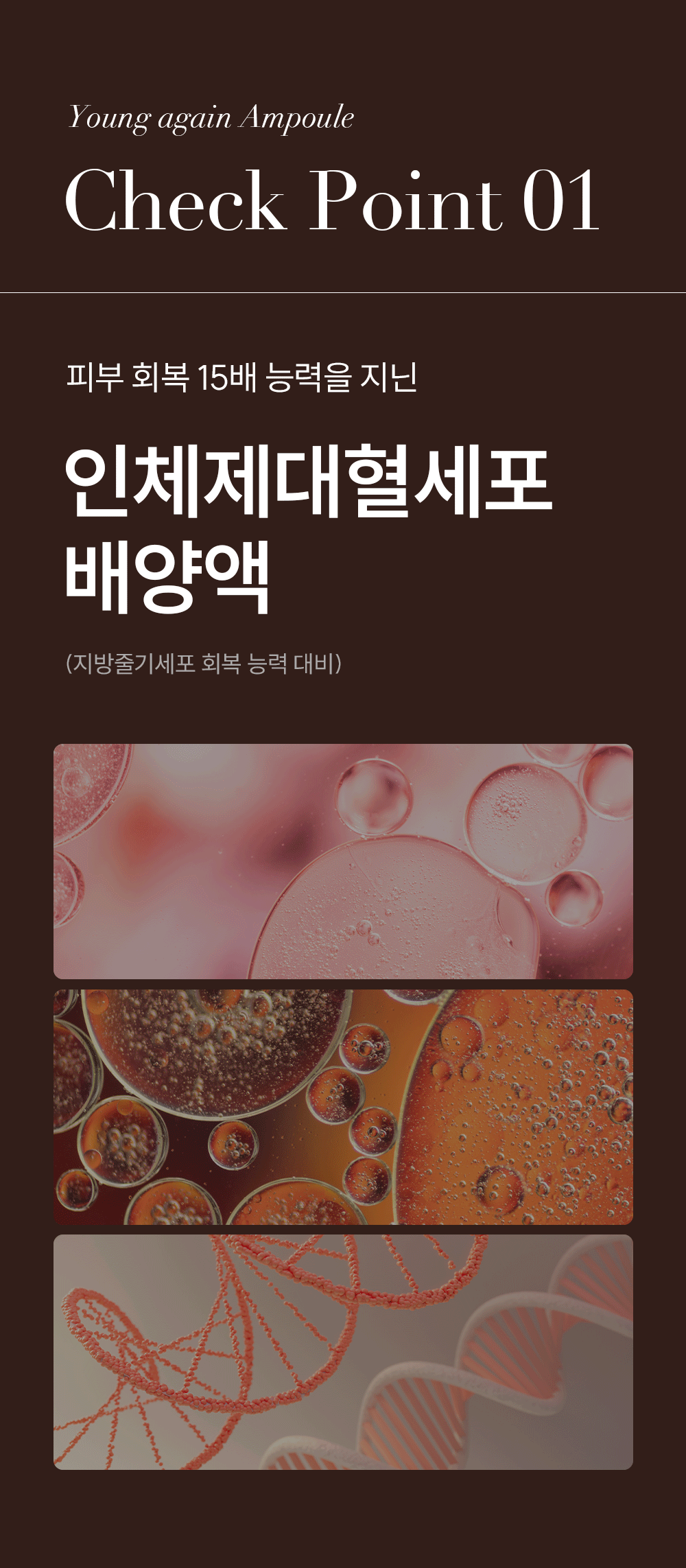 인체제대혈세포배양액은 현 시점 피부에서 만큼은 독보적인 효과를 발휘하는 가장 뜨거운 원료이자 바이오생명과학 테크놀로지를 통해 완성된 피부 과학의 정수가 담겨 있으며 290여 편 이상의 SCI급 논문 및 국제 특허로 그 효과가 증명 되었습니다.