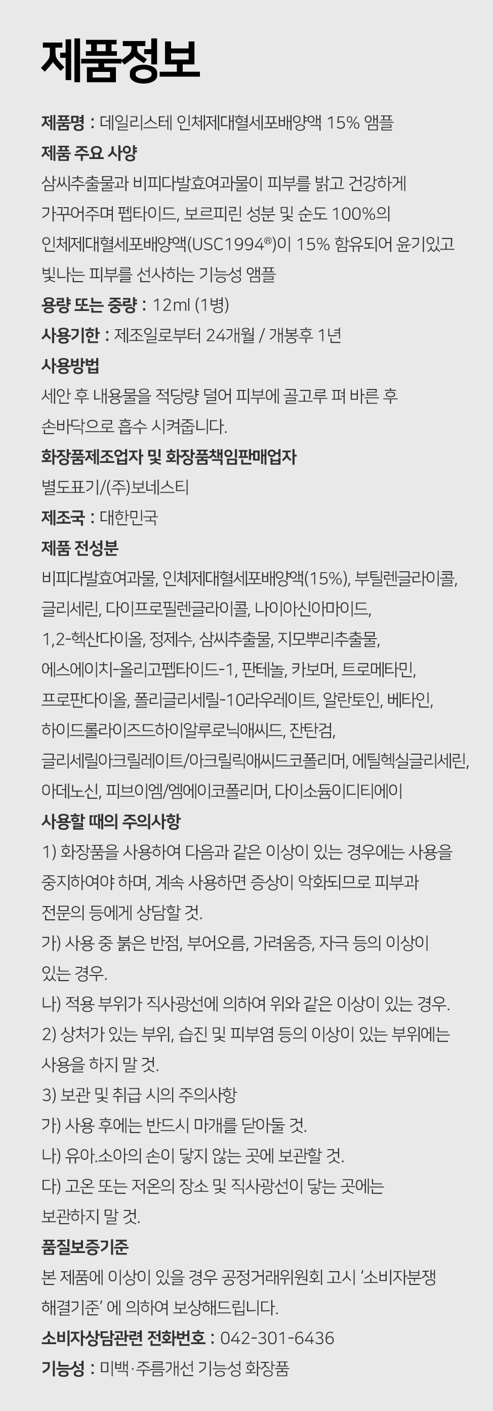 데일리스테는 (주)보네스티가 만드는 코스메틱 제품으로 모두에게 꼭 필요한 화장품을 만드는 브랜드 입니다. 이번에 서포터 여러분께 선보이는 청춘앰플은 ‘인체제대혈줄기세포배양액’이라는 원료를 15% 의 높은 함량으로 담아 낸 제품으로, 13년 제품 개발 원칙을 이 앰플 한 병에 고스란히 담아 내었습니다.