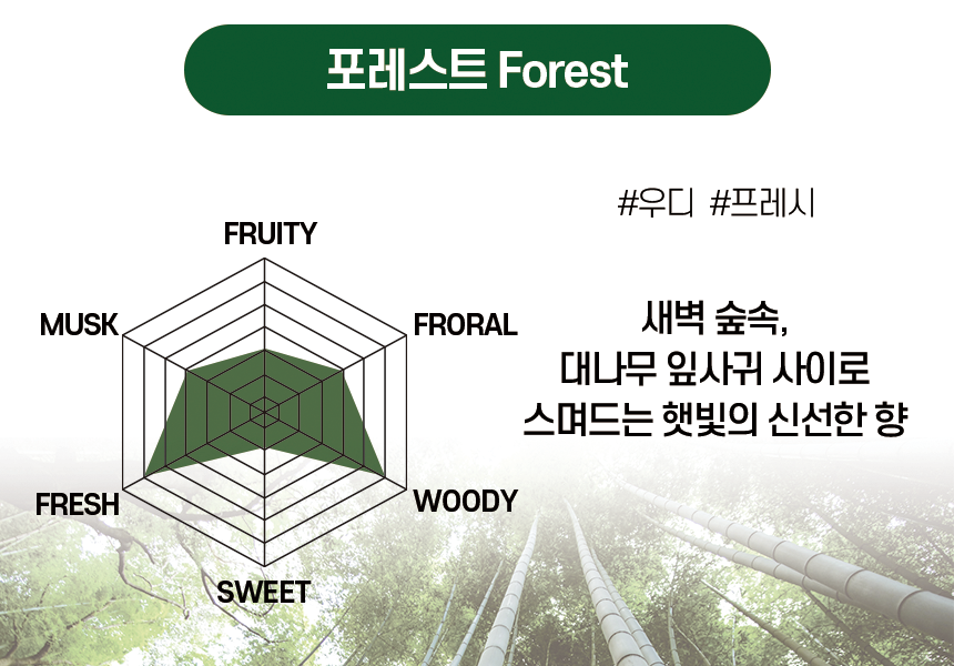 새벽안개가 가득한 숲속, 대나무 잎사귀 사이로 스며드는 햇빛의 신선함과 평온함이 느껴지는 향입니다.