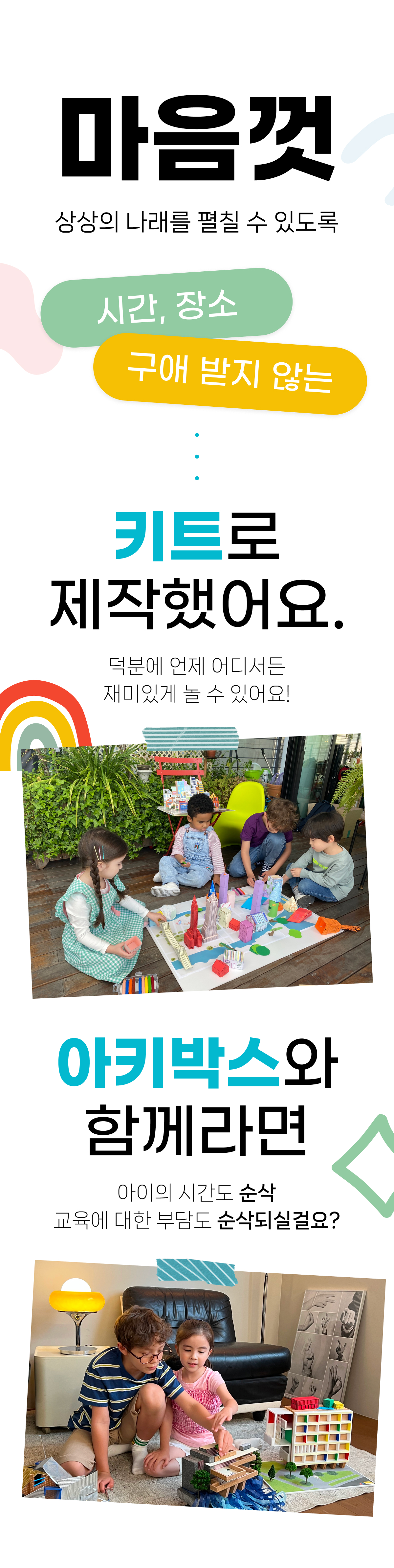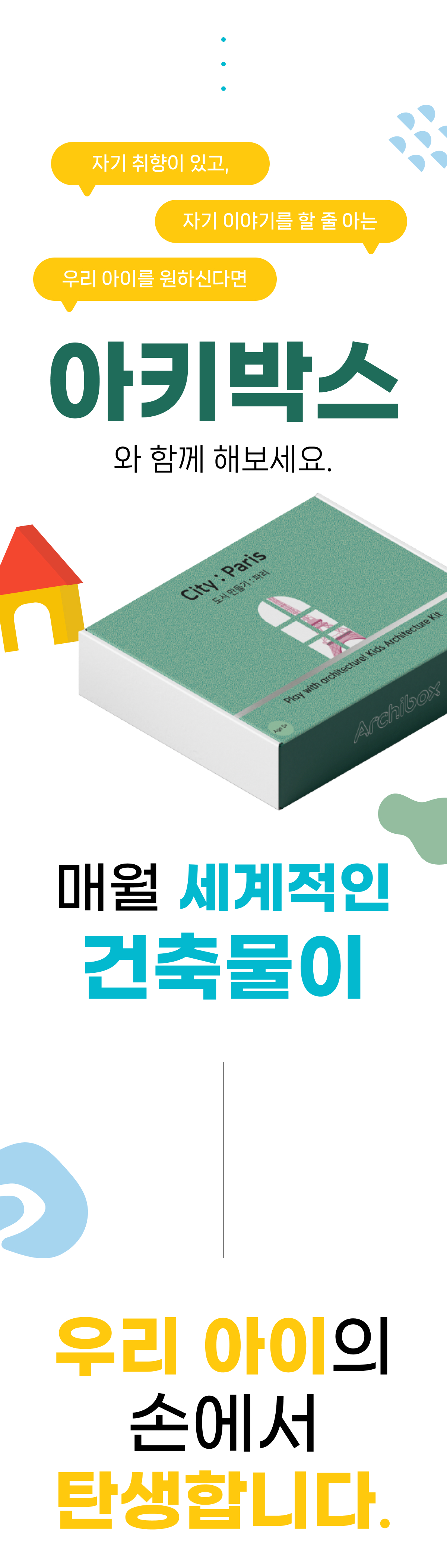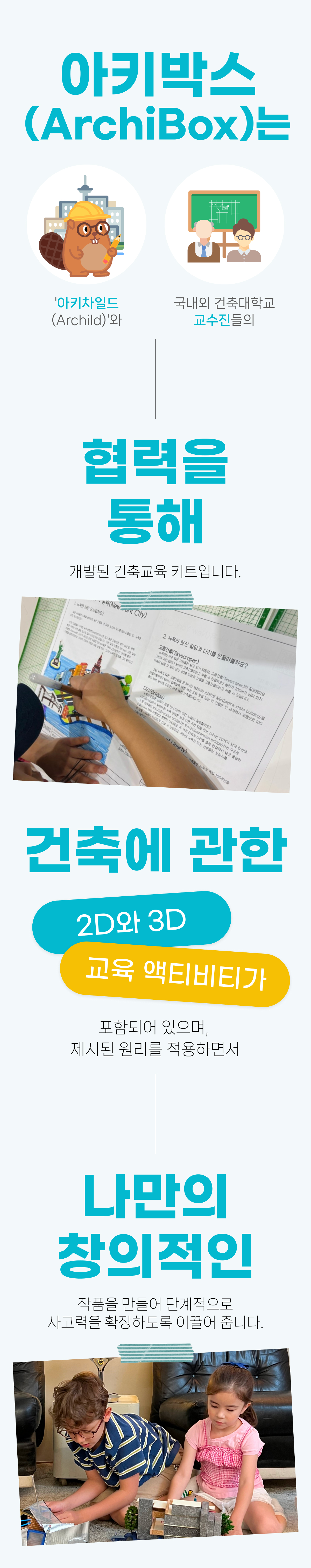 아키박스(ArchiBox)는 국내 최초 어린이 영어건축 교육기관 '아키차일드(Archild)'에서 직접 연구 개발한 아키텍처 키트입니다. 뉴욕과 런던의 어린이 건축학교 커리큘럼을 이수한 교육 전문가들이 연구 개발한 결과물로서, 건축에 관한 2D와 3D 액티비티가 포함되어 있으며, 제시된 원리를 적용하면서 나만의 창의적인 작품을 만들어 단계적으로 사고력을 확장하도록 이끌어 줍니다.
