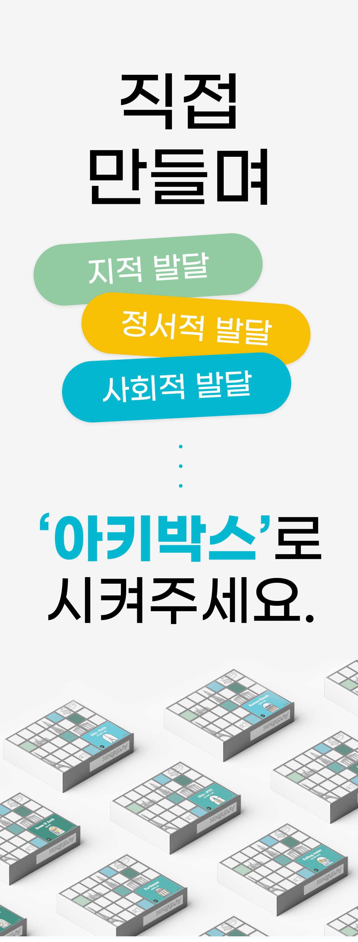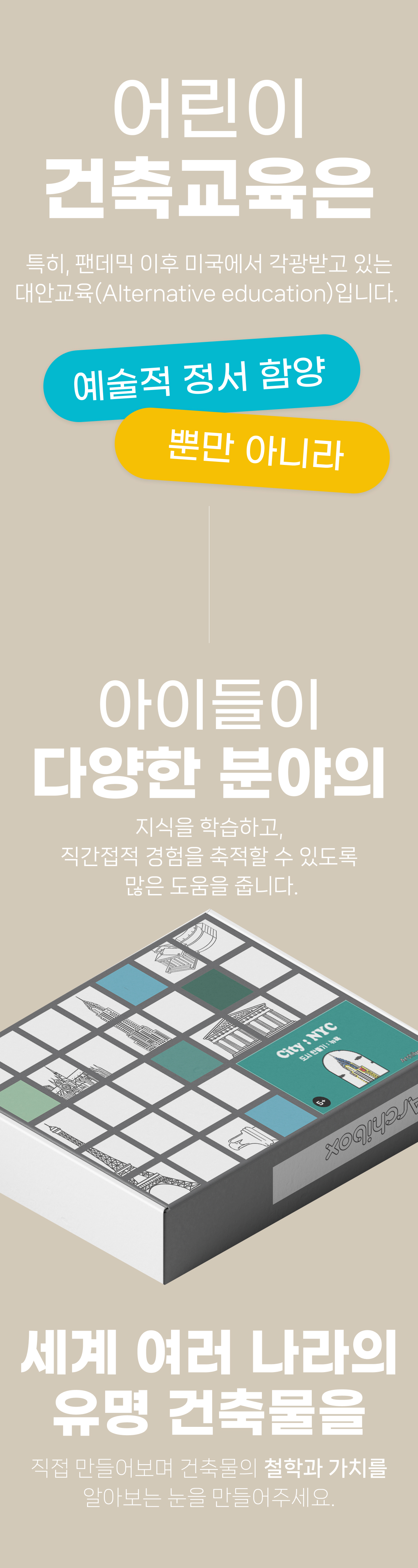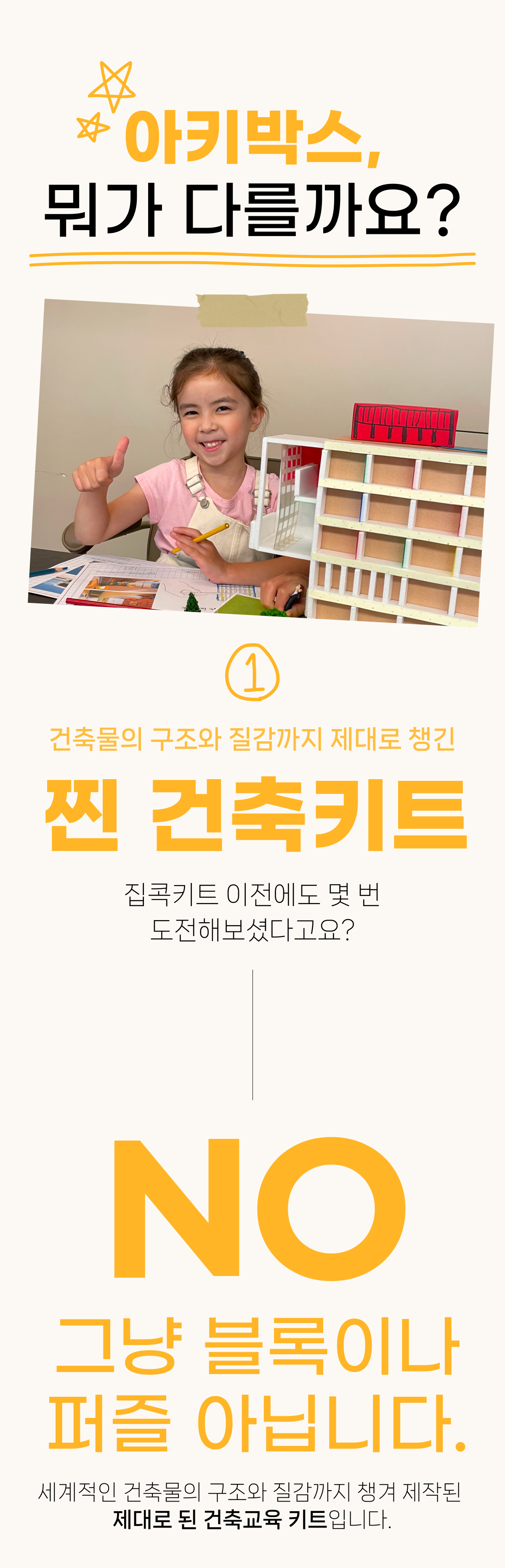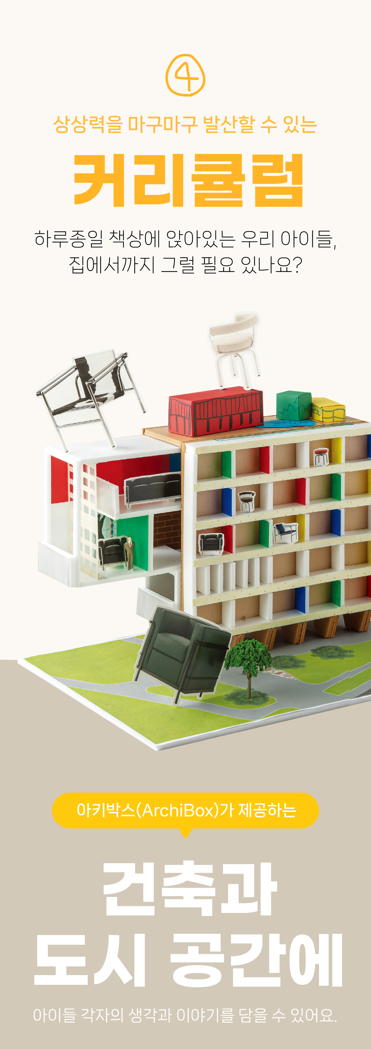 아키박스(ArchiBox)는 국내 최초 어린이 영어건축 교육기관 '아키차일드(Archild)'에서 직접 연구 개발한 아키텍처 키트입니다. 뉴욕과 런던의 어린이 건축학교 커리큘럼을 이수한 교육 전문가들이 연구 개발한 결과물로서, 건축에 관한 2D와 3D 액티비티가 포함되어 있으며, 제시된 원리를 적용하면서 나만의 창의적인 작품을 만들어 단계적으로 사고력을 확장하도록 이끌어 줍니다.