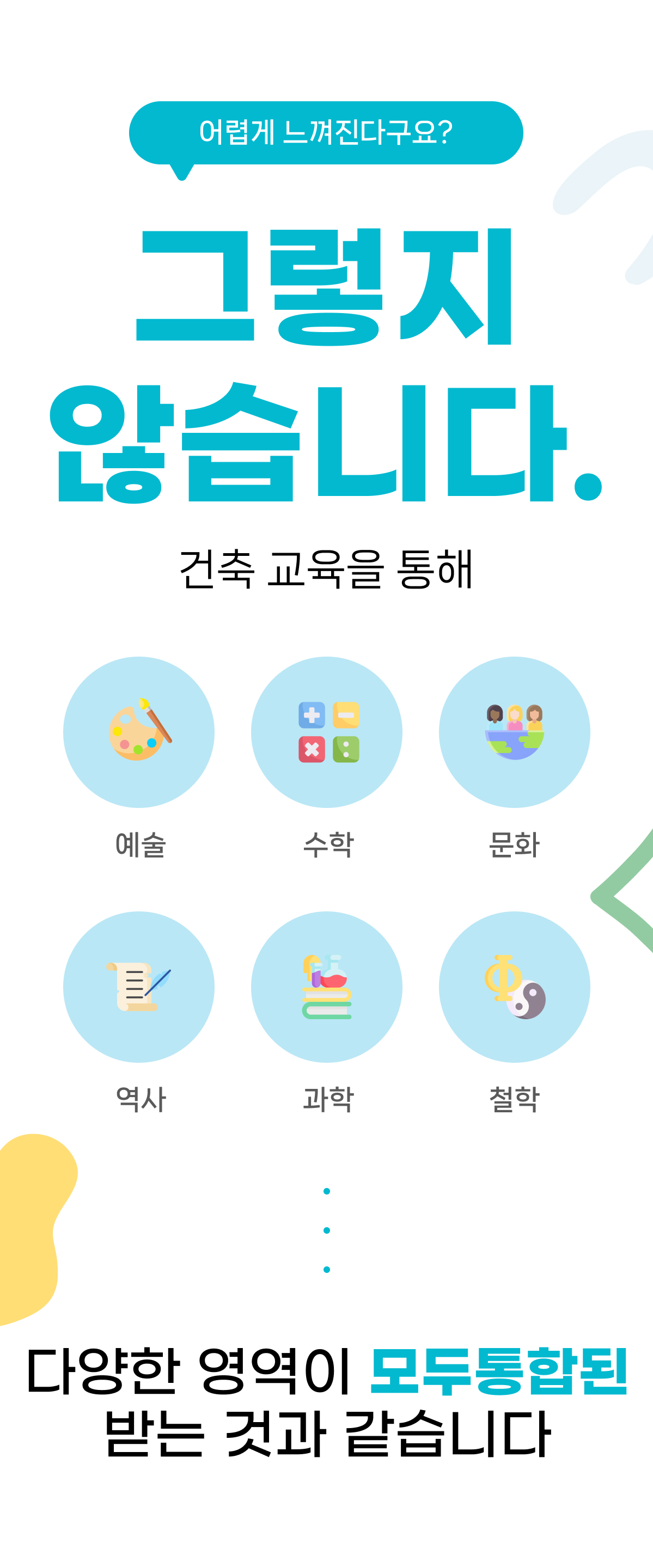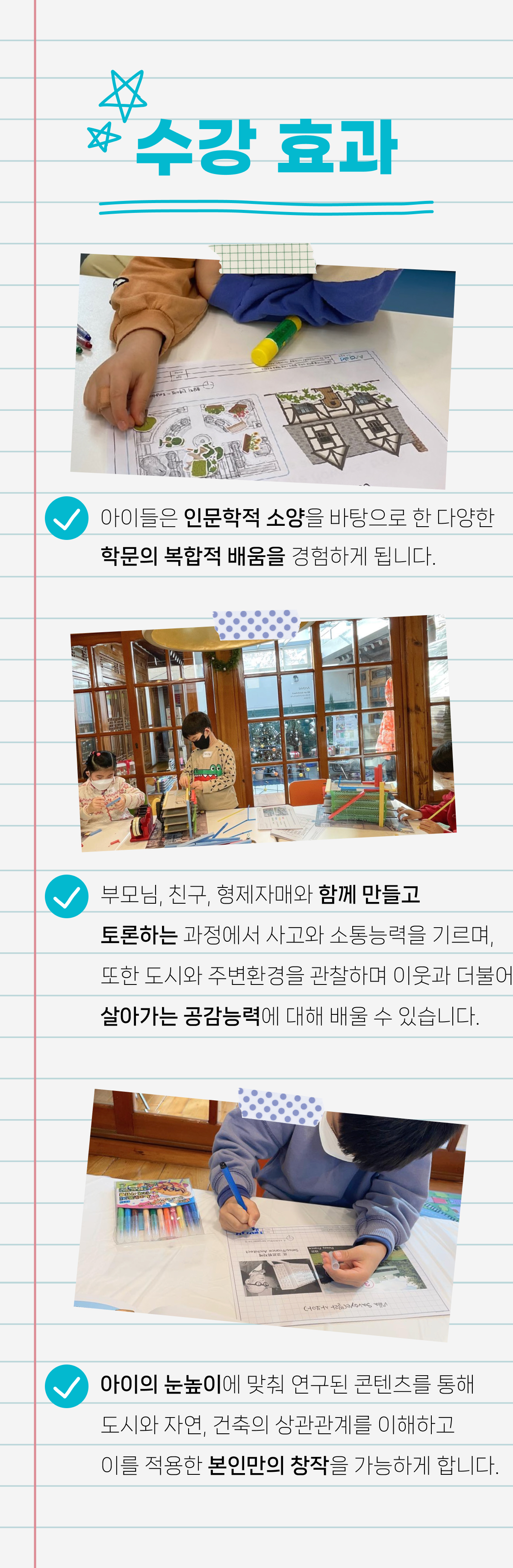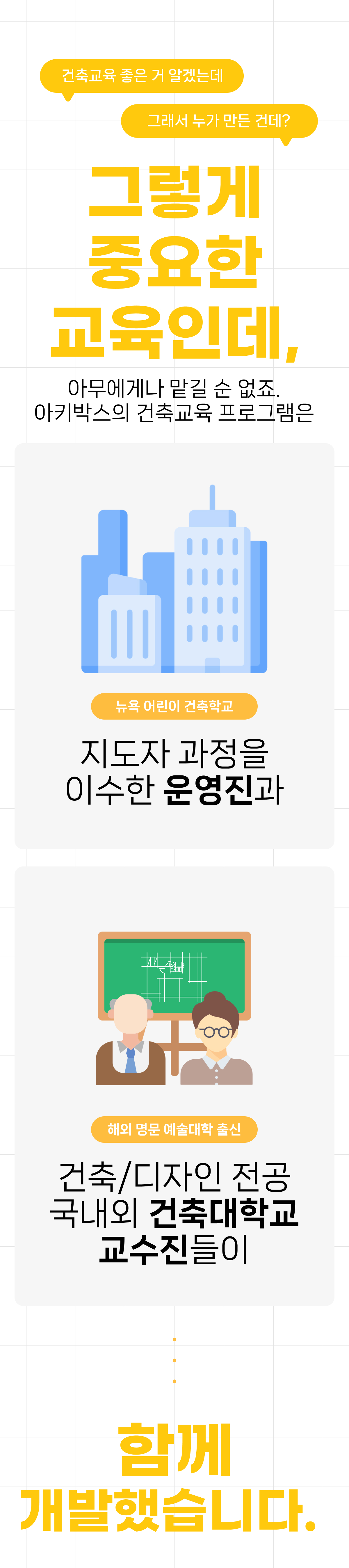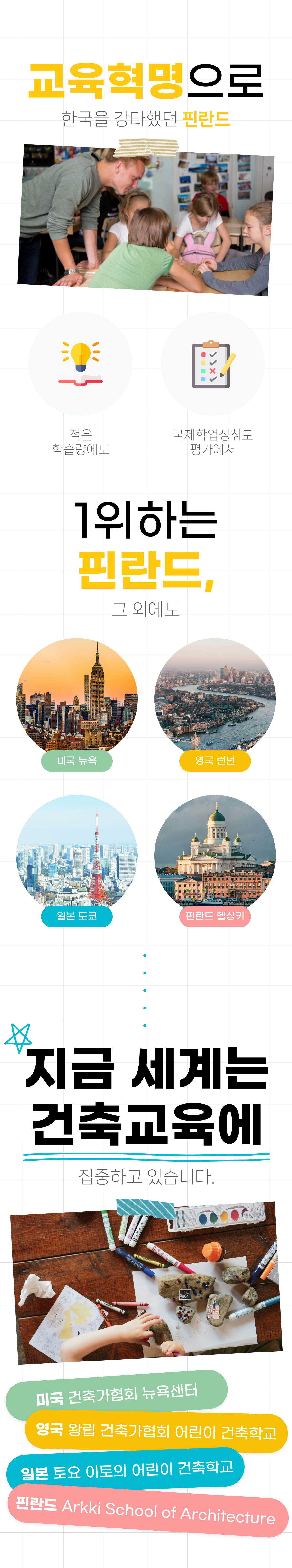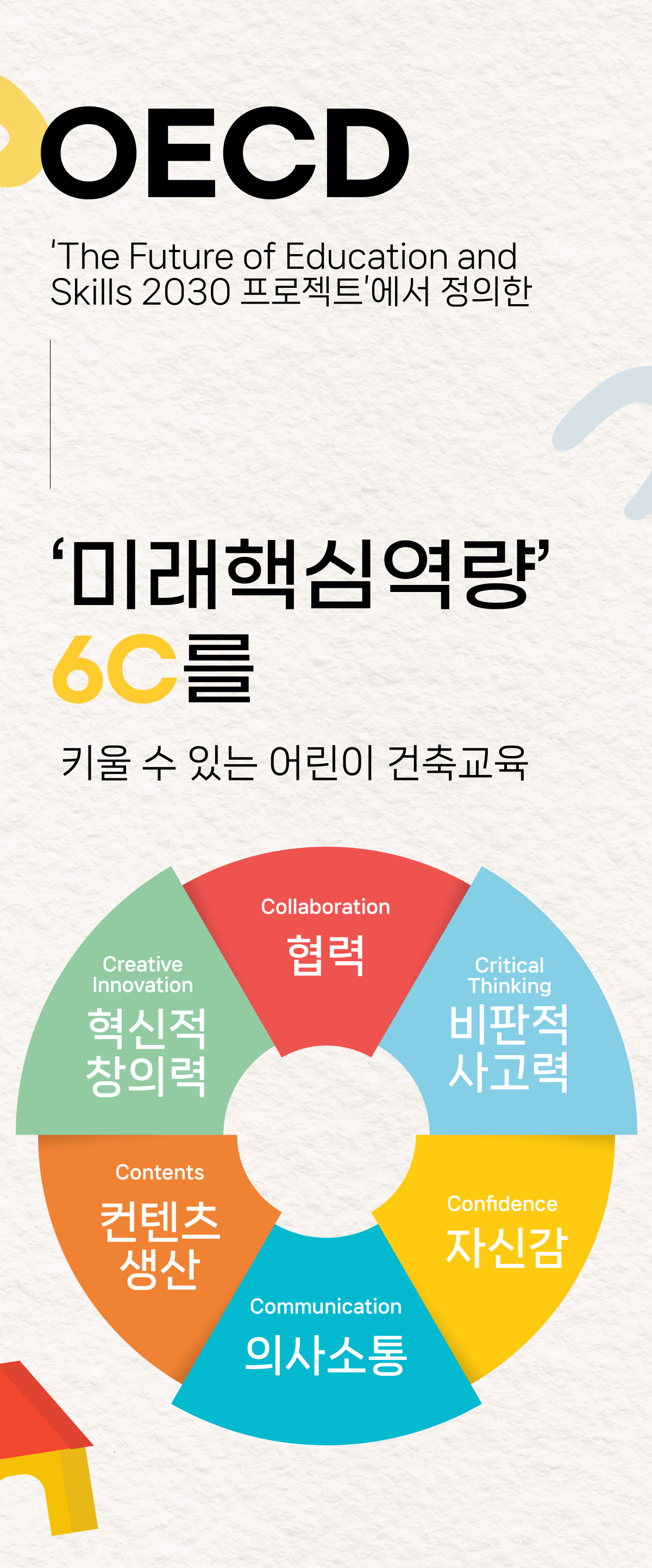어린이 건축교육은 단순히 건물의 구조를 배우는 것이 아닌, 건축물 하나하나에 녹아있는 예술, 수학, 문화, 역사를 통해 주변 환경에 대한 이해와 분석의 폭을 넓혀주는 교육입니다. 또한, 건축물의 원리를 탐구하고, 지역사회와의 관계성을 고려해 보고, 마지막으로 직접 설계하며 만드는 과정을 통해 아이들의 사고력과 상상력, 나아가 공감능력과 사회성까지 발달시킬 수 있는 창의융합형 인재교육입니다.