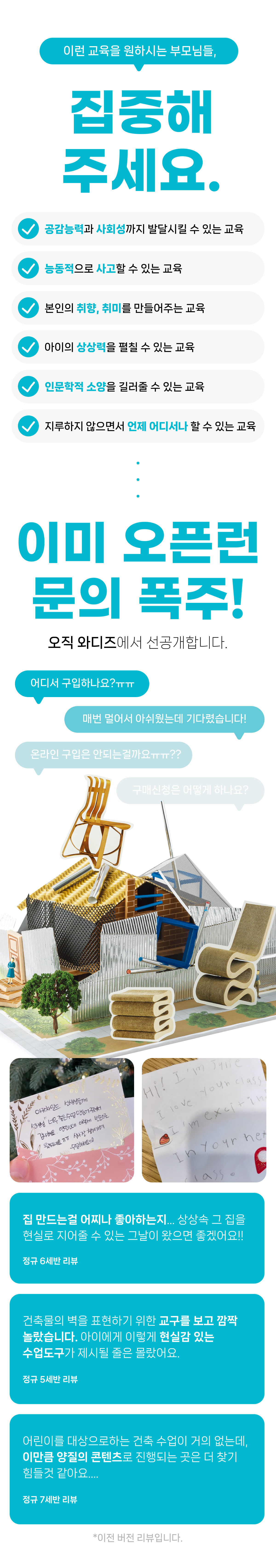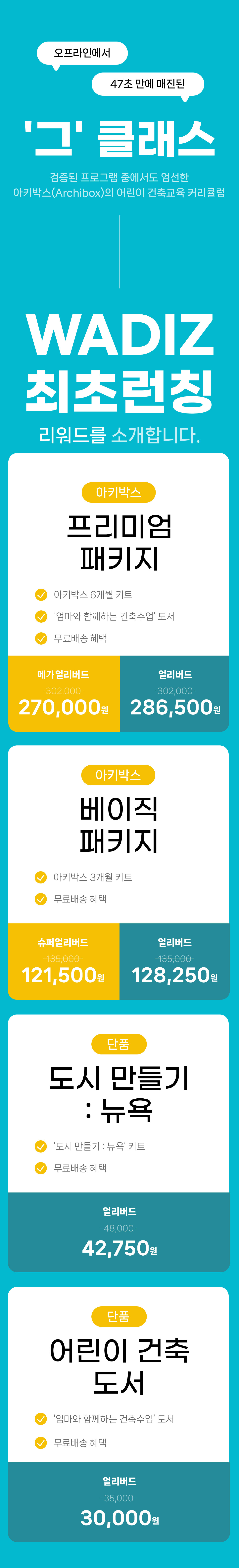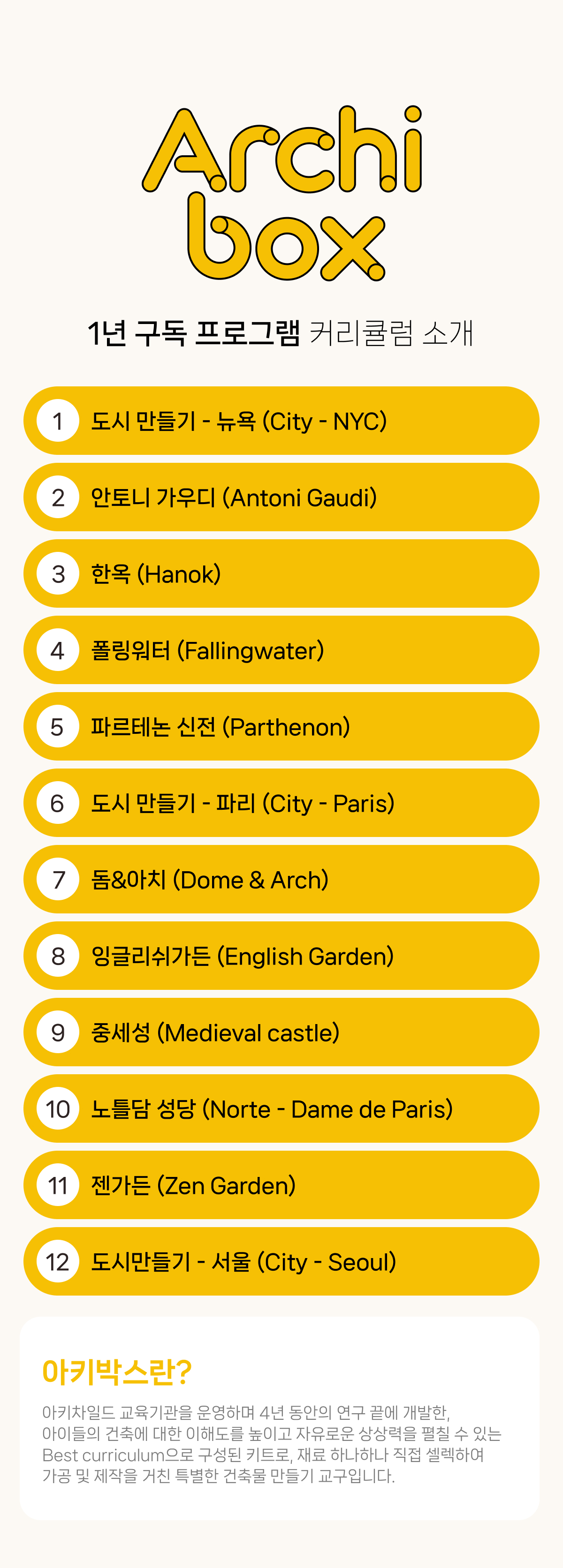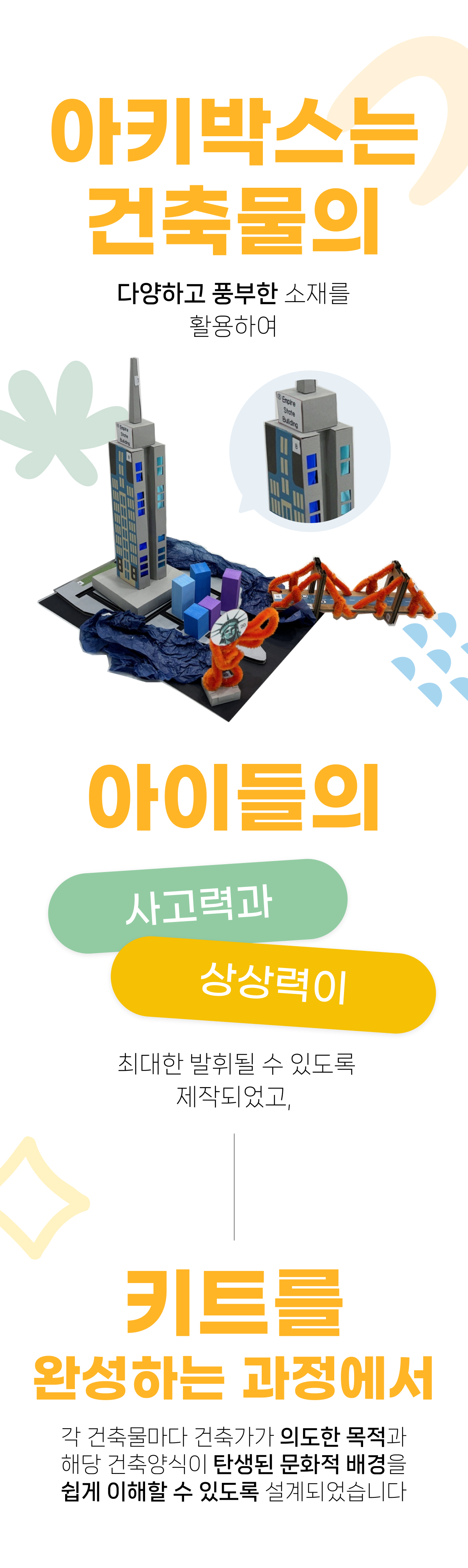 지난 5년간 어린이 건축 교육기관 '아키차일드'를 운영하면서 많은 국내외 어린이 친구들을 만났습니다. 처음에는 어린이 건축수업이 생소하고 어려움을 느끼셨지만, 수업 후에는 아이들, 부모님 모두 만족도가 높았고, 꾸준히 건축수업을 받고 싶어했습니다. 아이들의 사고력, 창의력, 표현력, 문제해결 능력, 공간감 등 다양한 면에서 성장하는 과정을 부모님들이 직접 체험하셨기 때문입니다. 실제로 2020년부터 현재까지 많은 아이들이 아키차일드에서 건축 수업을 꾸준히 받고 있습니다. (5살이었던 친구가 이제는 초등학교 2학년이 되었어요!) 아키차일드에서 사용하는 모든 교재와 교구는 저희가 직접 연구하여 개발하고 있습니다. 집이 멀어서 매주 수업에 참석할 수 없는 아이들이나 해외 거주자들을 위해 건축물 키트 배송에 대한 문의가 많아졌습니다. 어떤 커리큘럼이 아이들에게 도움이 될 수 있을지 오랜 시간을 고민한 끝에 건축물 만들기 키트 구독서비스인 '아키박스(Archibox)'를 론칭하게 되었습니다. 아키박스는 아이들의 건축 이해도를 높이고 자유로운 상상력을 펼칠 수 있는 Best curriculum으로 구성되었으며, 재료 하나하나까지 직접 선택하여 샘플 제작을 완료했습니다. 이후에는, 아키박스를 어디서 어떻게 소개할지에 대한 고민이 많았는데요, 좋은 제품을 잘 소개할 수 있는 와디즈에서 첫 론칭을 계획하게 되었습니다. 펀딩을 진행하면서, 많은 서포터분들께 어린이에게 도움이 되고, 중요한 건축 교육을 널리 알리고, 소개하고자 합니다. 펀딩 금액은 제품 제작에 사용될 예정이며, 추후에는 새로운 커리큘럼과 교구 개발에도 집중하고자 합니다.