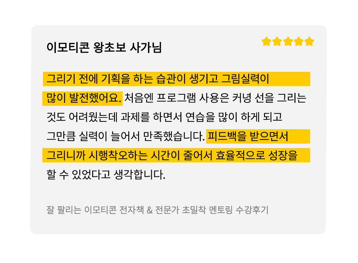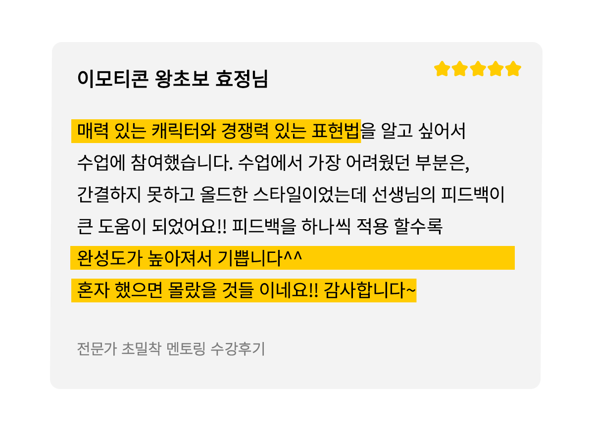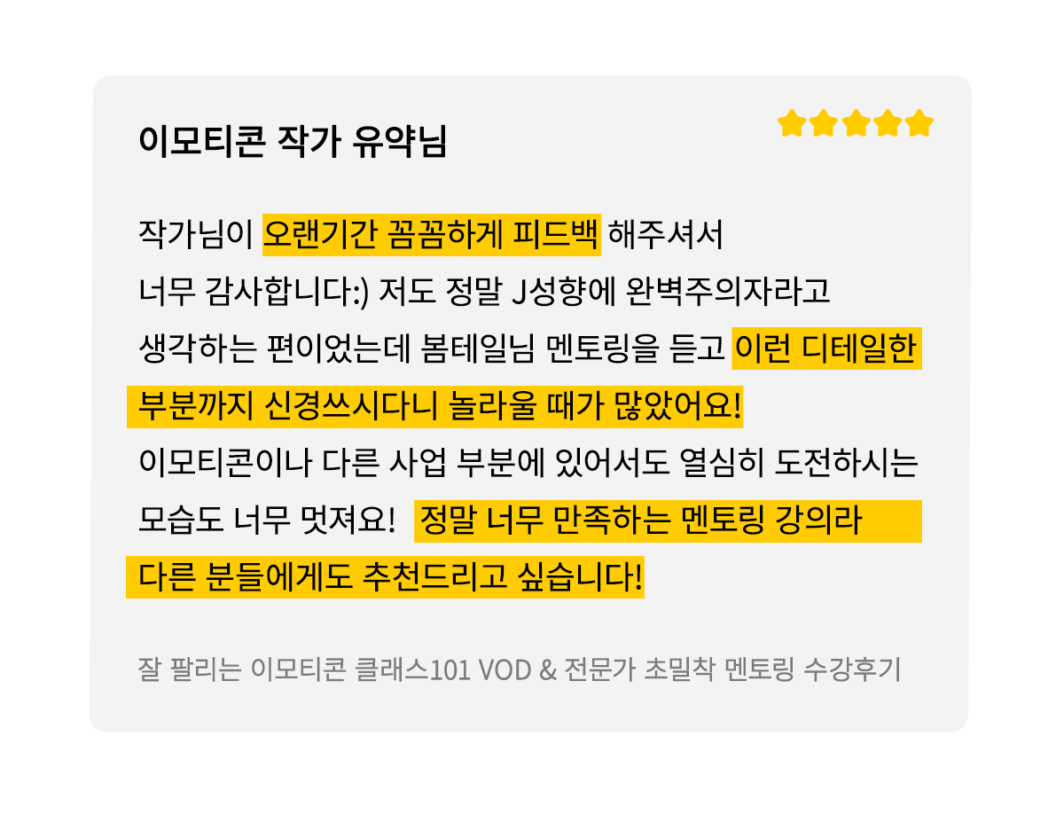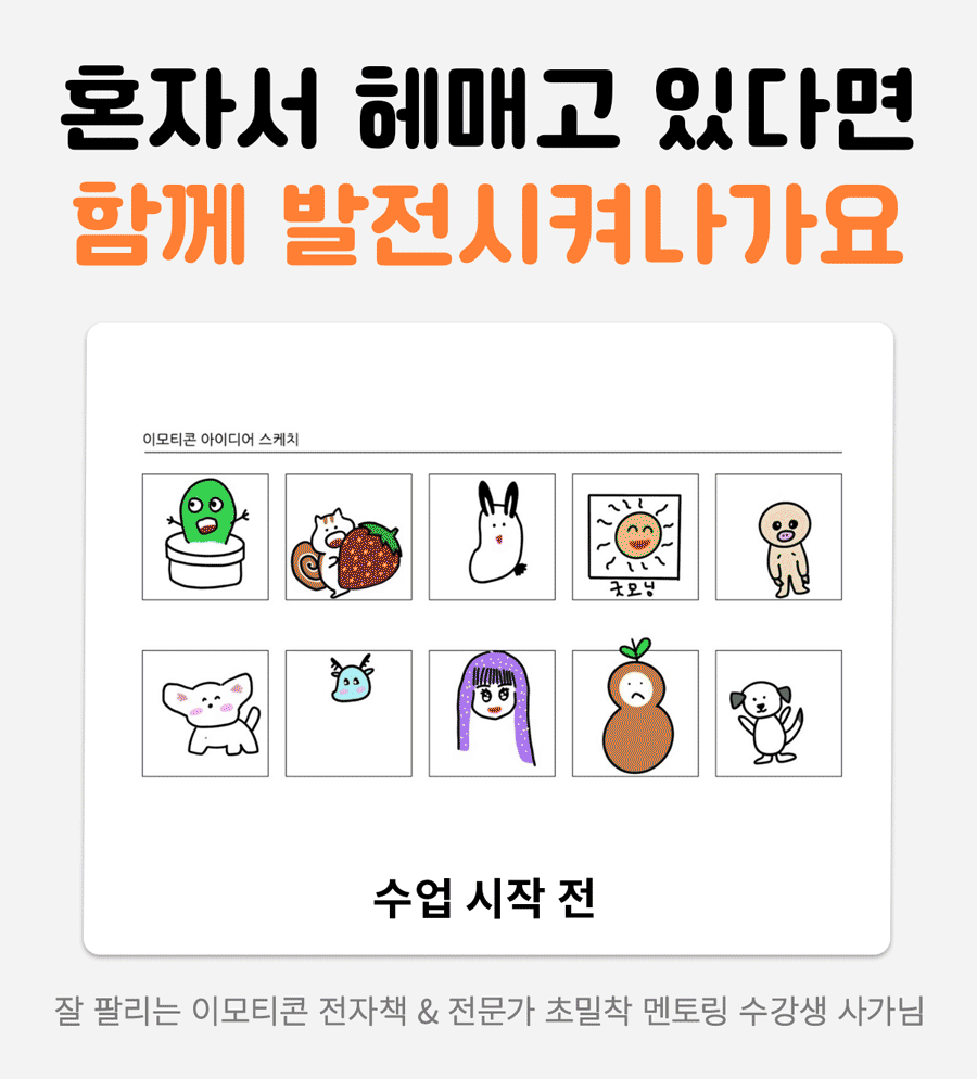 이런 경험을 이모티콘을 처음 시작하시는 분들께도 알게 해드리고 싶었고,  창작자들이 제가 돌아온 먼 길을 겪지 않도록!  3,4년이 걸릴 수 있는 시행착오를 단축시켜 빠르게 성장할 수 있도록 해드릴거예요.