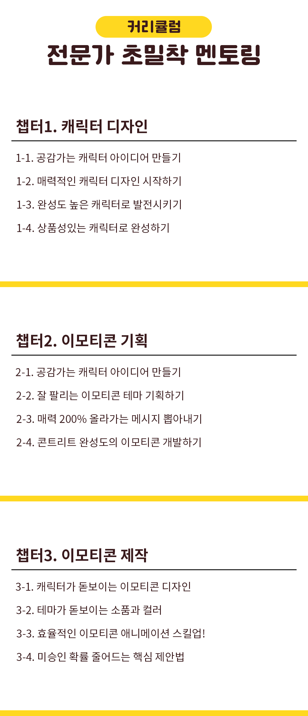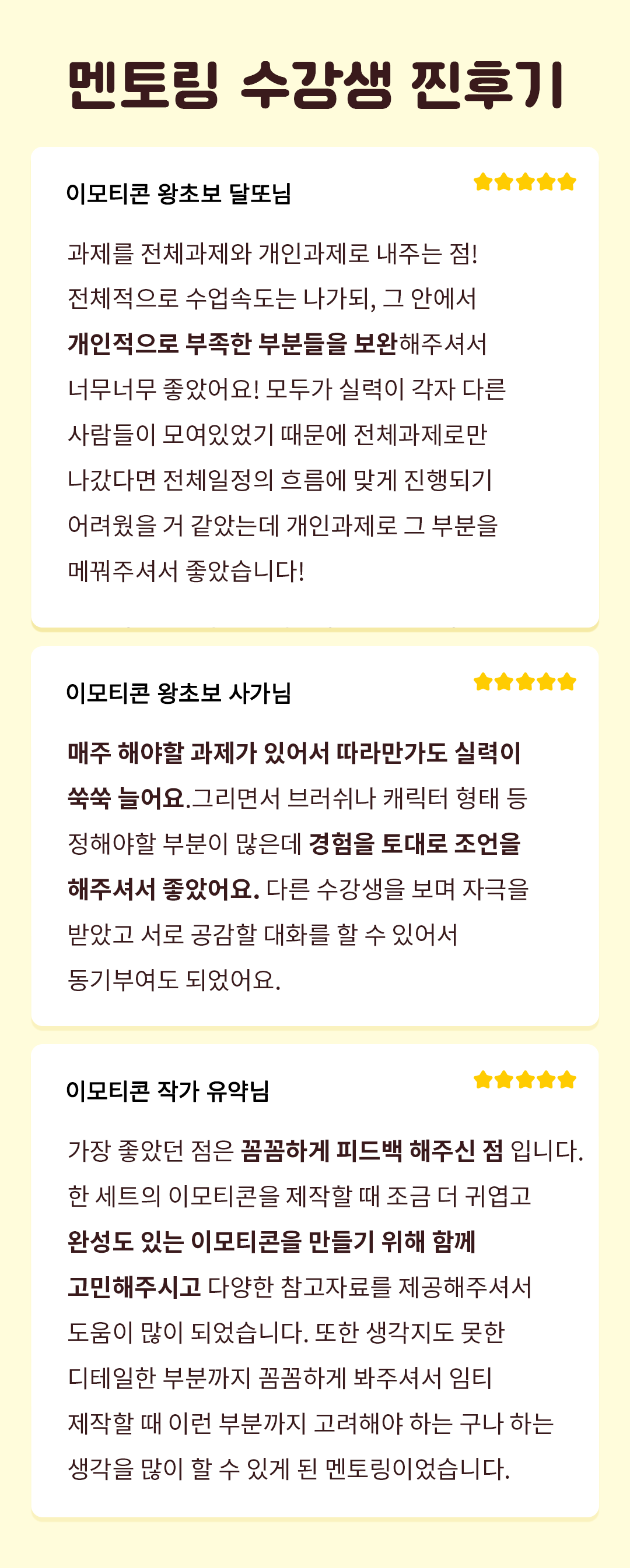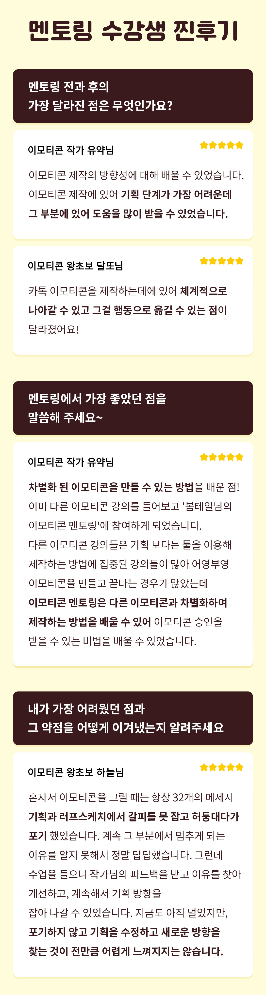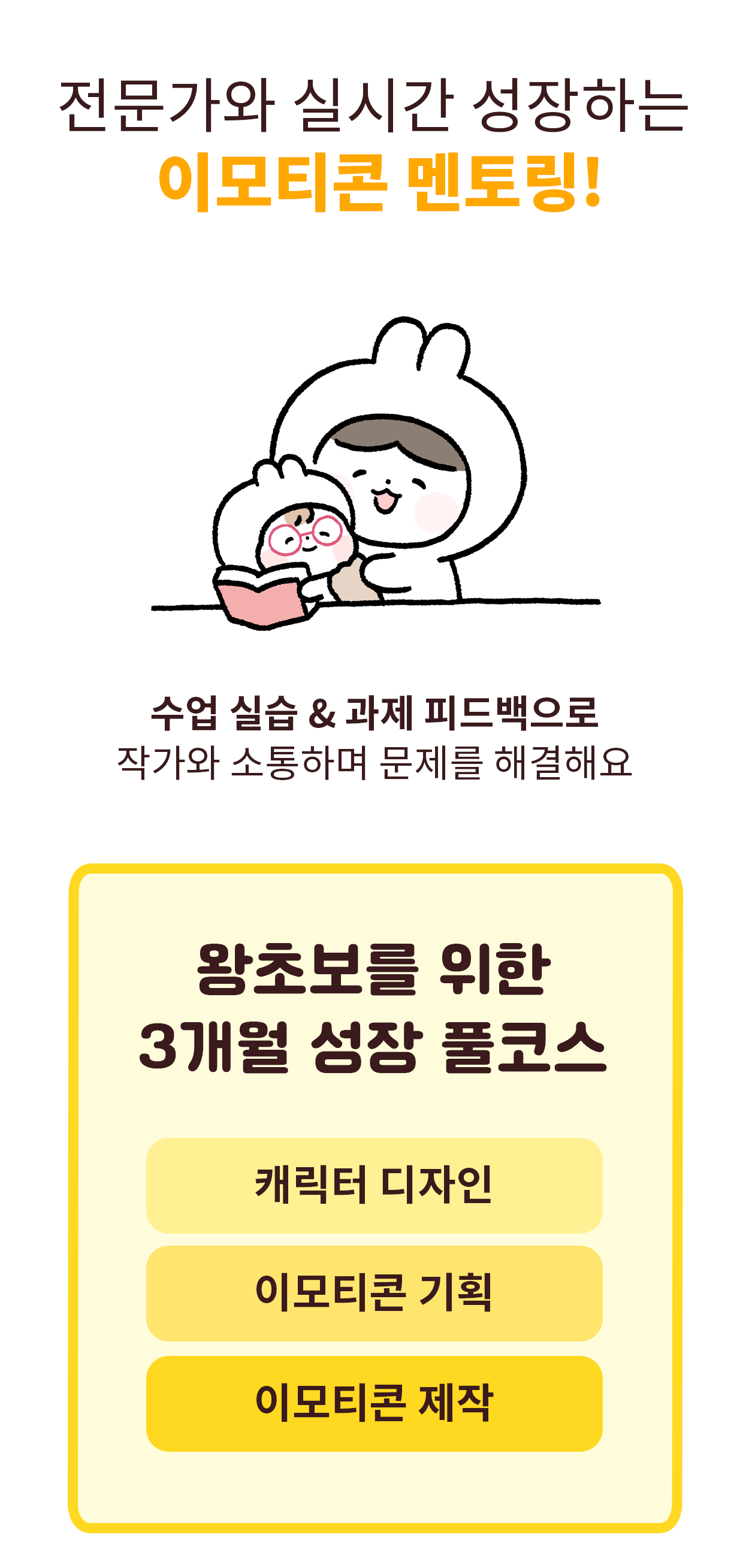 이런 경험을 이모티콘을 처음 시작하시는 분들께도 알게 해드리고 싶었고,  창작자들이 제가 돌아온 먼 길을 겪지 않도록!  3,4년이 걸릴 수 있는 시행착오를 단축시켜 빠르게 성장할 수 있도록 해드릴거예요.