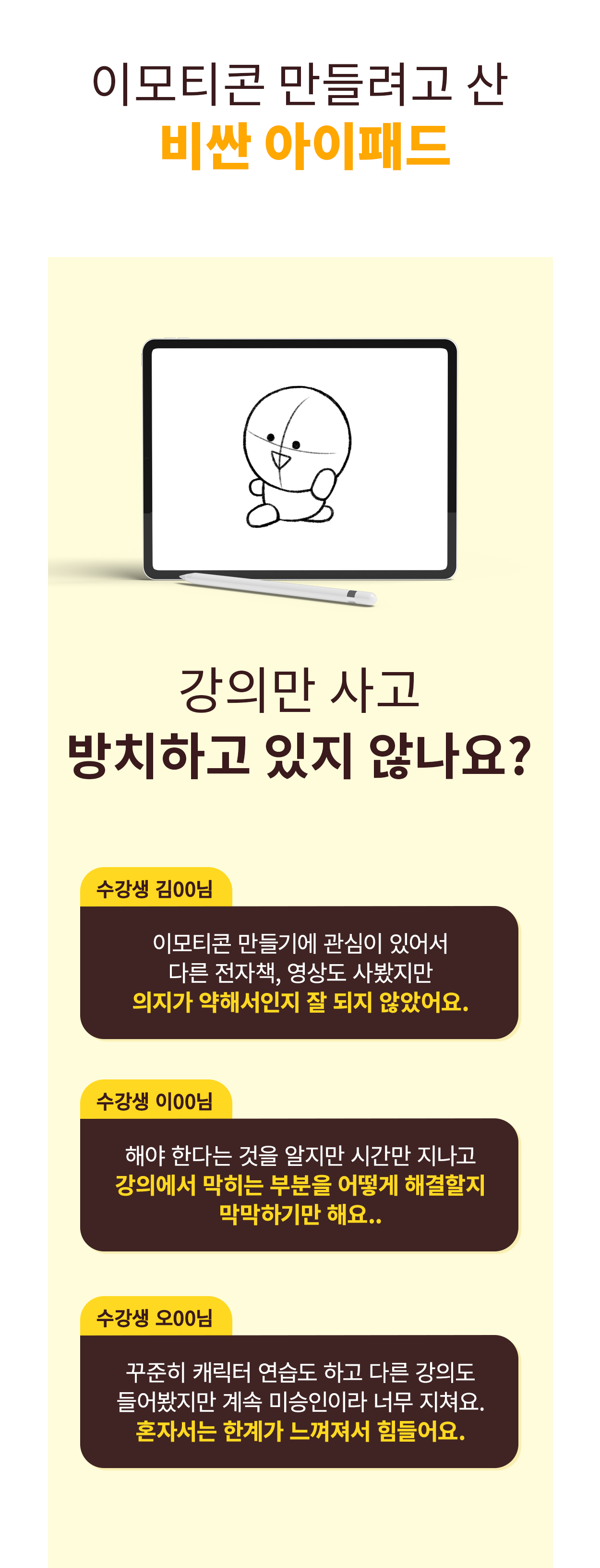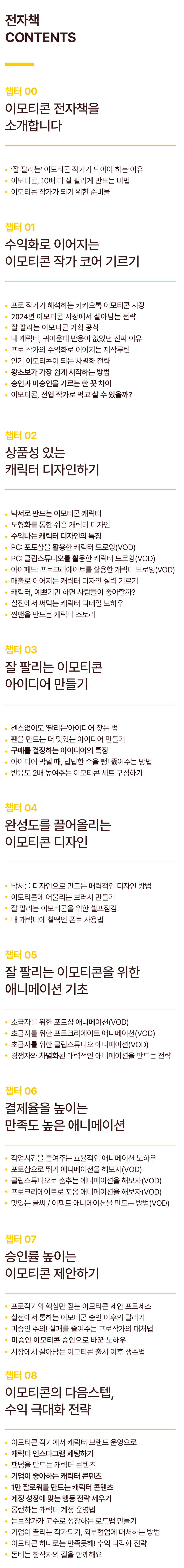 이번 프리오더는 이와 같은 경험을 바탕으로 저와 같은 시행착오 없이 이모티콘 제작 경험이 없으신 분들도 따라오실 수 있도록 처음부터 1위를 하며 잘된 케이스가 아닌 이모티콘 시장 초창기부터 7년 간 다양한 컨셉으로 도전하며  인기순위를 역주행했던  저만의 경험과 기왕 창작하는 이모티콘으로 일러스트, 애니메이션  등 캐릭터 브랜딩을 통해 더 많은 수익을 창출할 수 있었으면 하는 마음을 더해 만들어졌습니다.