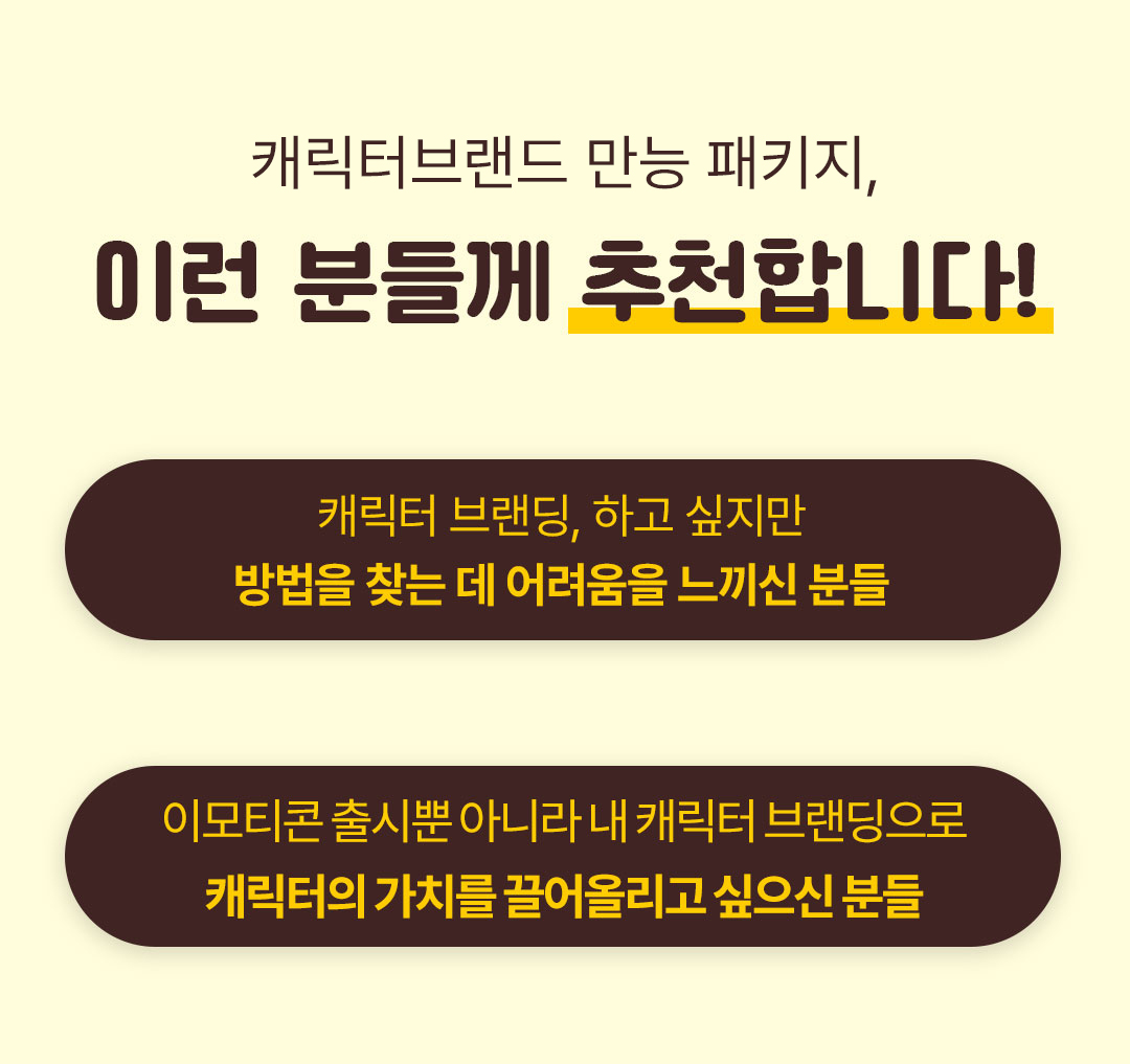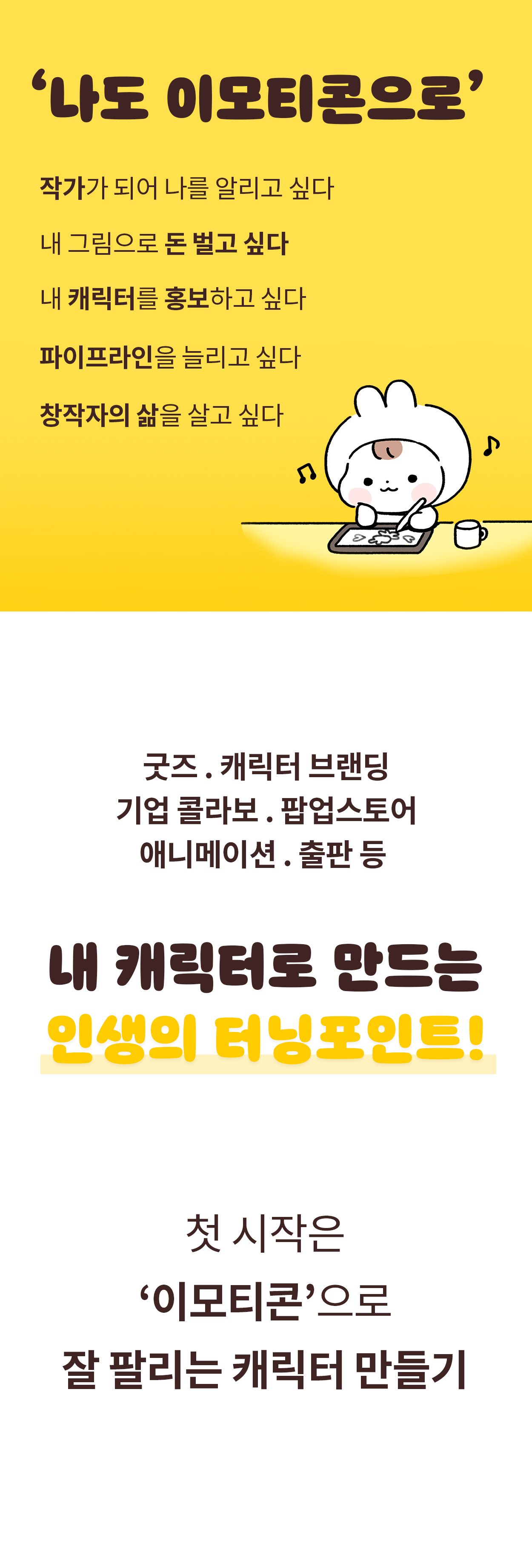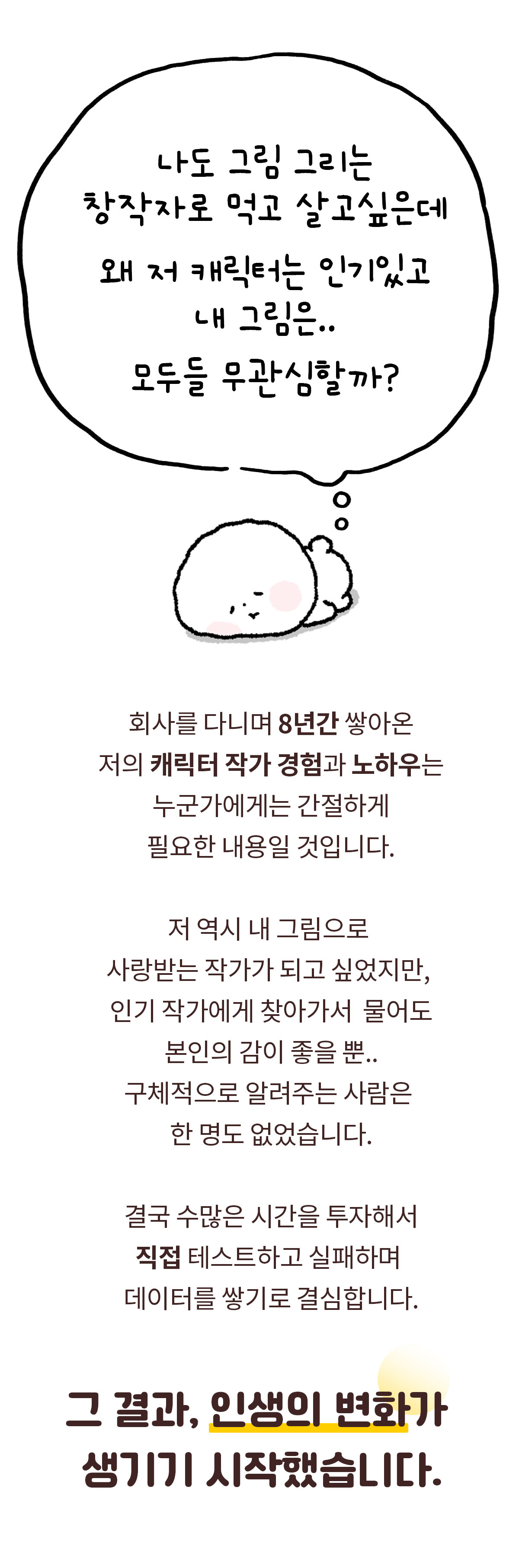 이모티콘은 제 인생의 터닝 포인트가 되어 주었습니다. 퇴사 후 캐릭터를 만든 이후로 작가의 길을 걷게 되었고, 회사에서도 캐릭터 디자이너로서 일하게 되었으며, 퇴근 후에 저만의 캐릭터 브랜드를 운영하는 창작자로서의 삶을 살게 되었죠. 제 노하우를 살려 강의와 여러 기업과의 멋진 프로젝트도 진행하고요! 제가 늘 꿈꿔왔던 제 창작으로 행복하게 일하는 삶을 살게 된 것입니다.