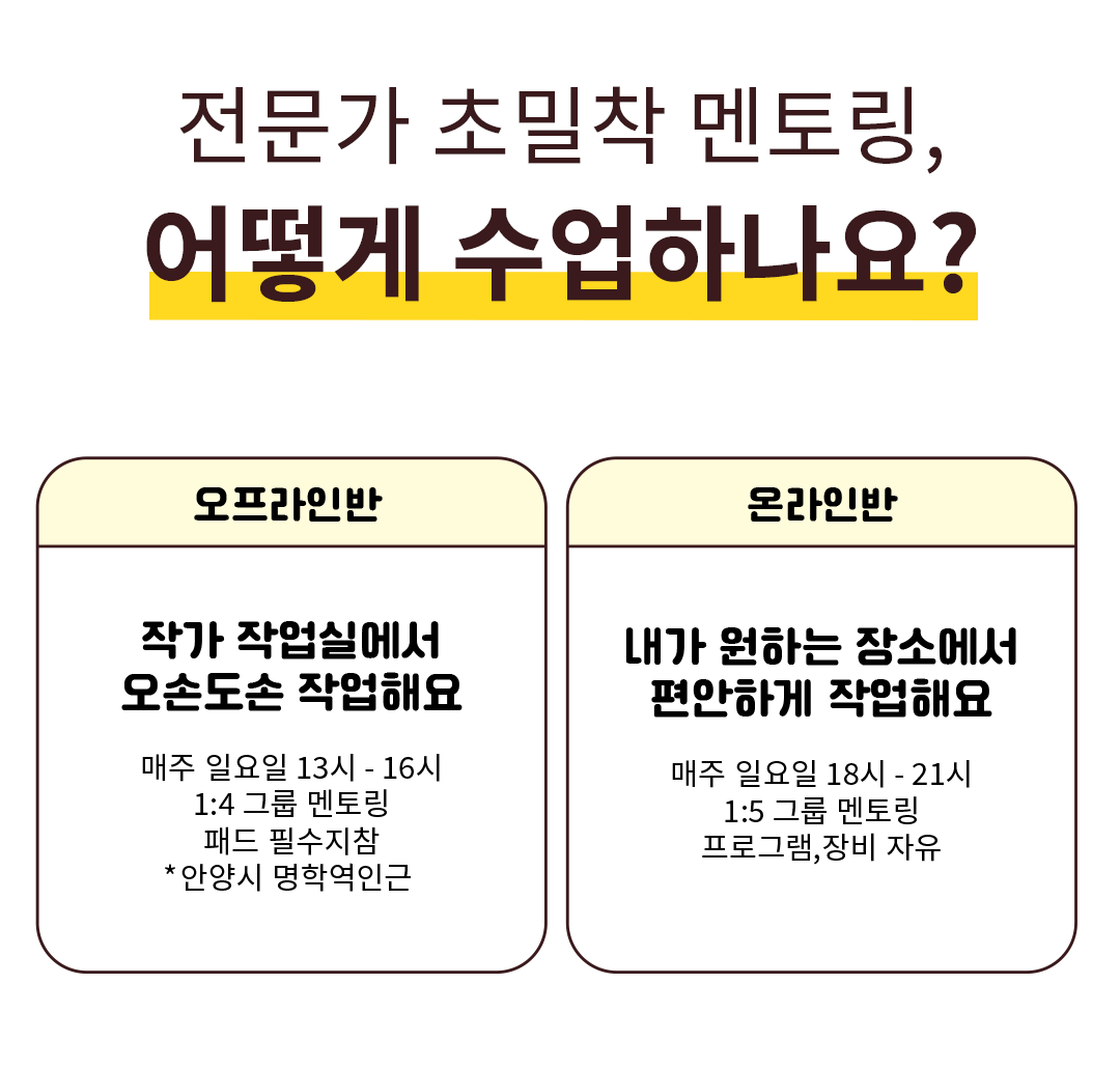 수도권이 아니라서, 시간을 내기 어려워서 오프라인 멘토링에 참석하지 못하셨다면 온라인 멘토링을 추천드려요! 화상 프로그램을 사용해서 캠과 작업 화면을 켜고 3시간동안 찐-한 피드백을 나눈답니다. 전문가가 내 작업을 보면서 조언을 주고, 다른 수강생들과 의견을 나누며 함께 발전할 수 있는 소중한 시간이에요. 수업진행은 전문가의 강의를 들은 다음, 수업 과제를 실시간으로 실습하거나 지난주 작업한 과제에 대한 피드백을 나눕니다. 개인의 역량과 작업 속도에 따라 맞춤형 1:1 피드백 위주로 진행하게 될 거예요.