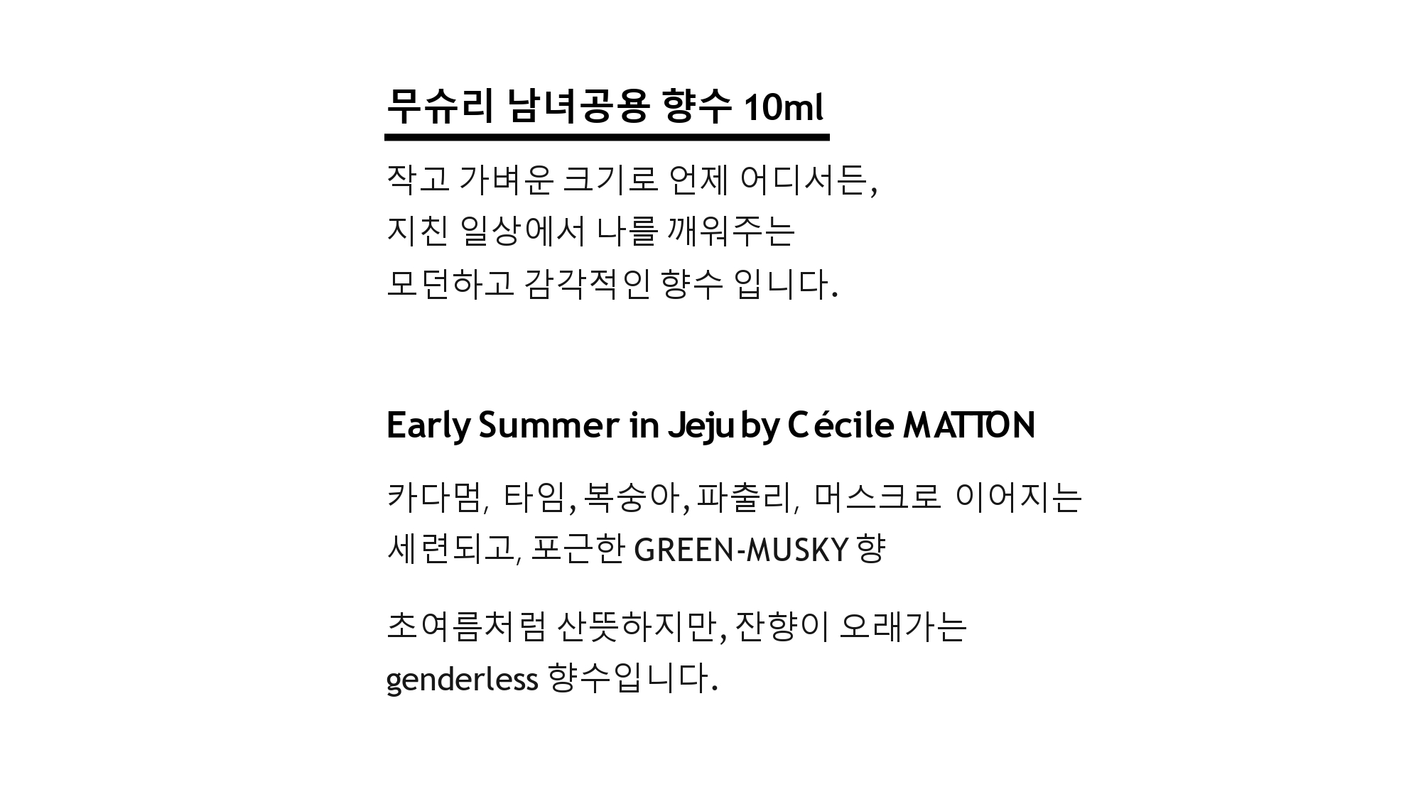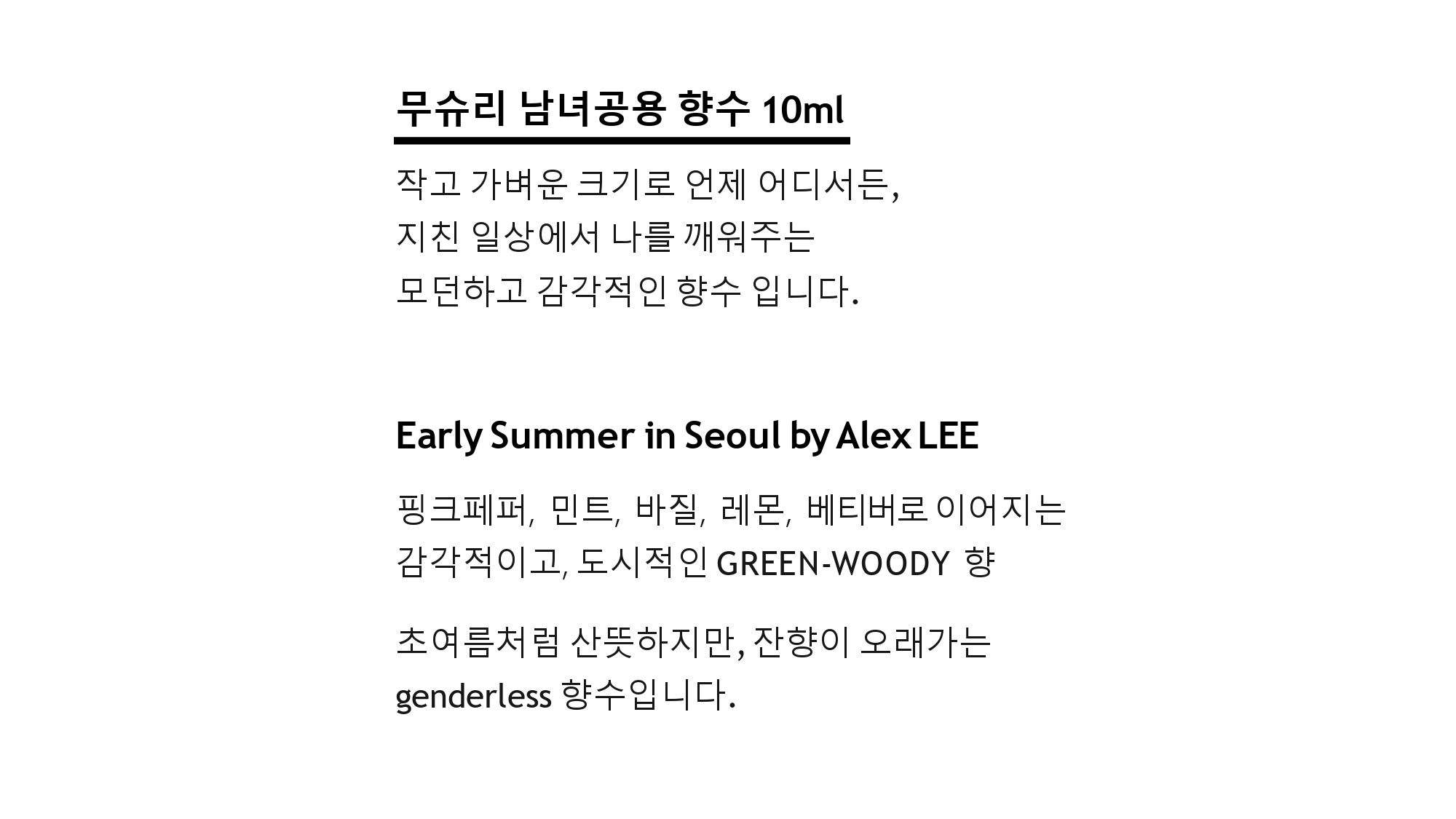 지금껏 여러분께서 경험해보지 못했던 GREEN-WOODY, GREEN-MUSKY 로 한국의 초여름을 MANE 파리 Creative Center 소속의 조향사분들과 함께 소개하려고하며, 두 제품 모두 산뜻하면서도 잔향이 오래가기 때문에 사계절 내내 사용이 가능합니다.