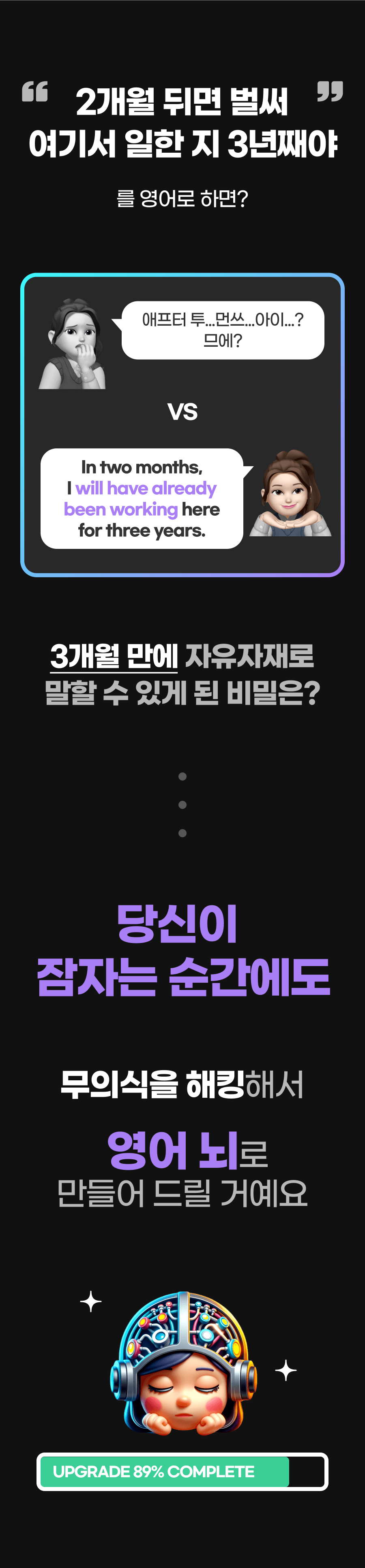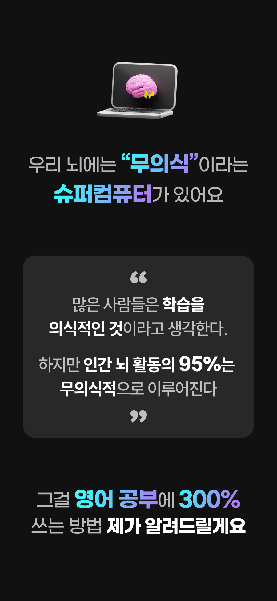 아니에요, 정말이에요! 우리 뇌에는 모두 "무의식"이라는 고성능 슈퍼컴퓨터가 있어요. 이걸 사용하면 언어 습득이 이전과는 비교도 안 되게 엄청나게 빨라져요.