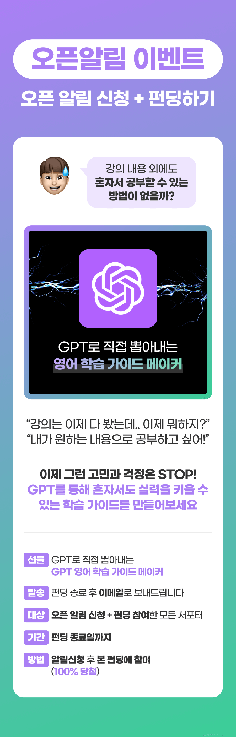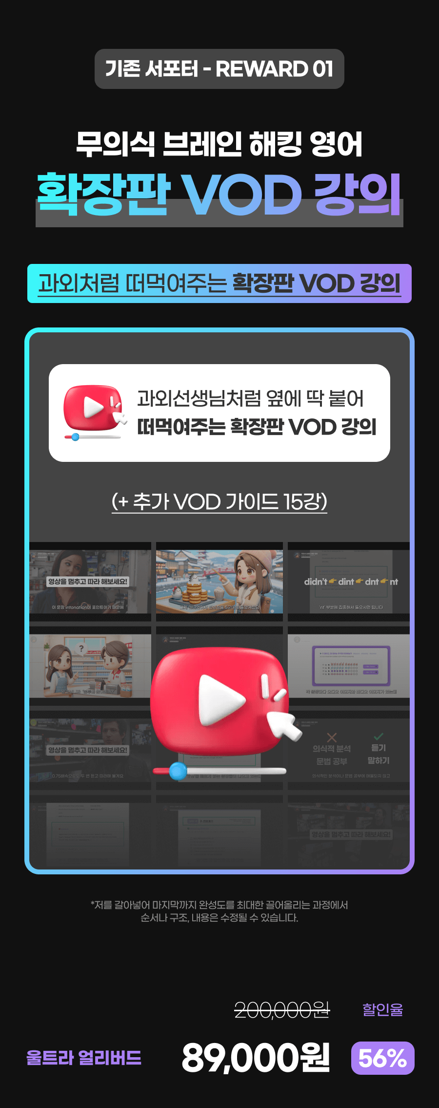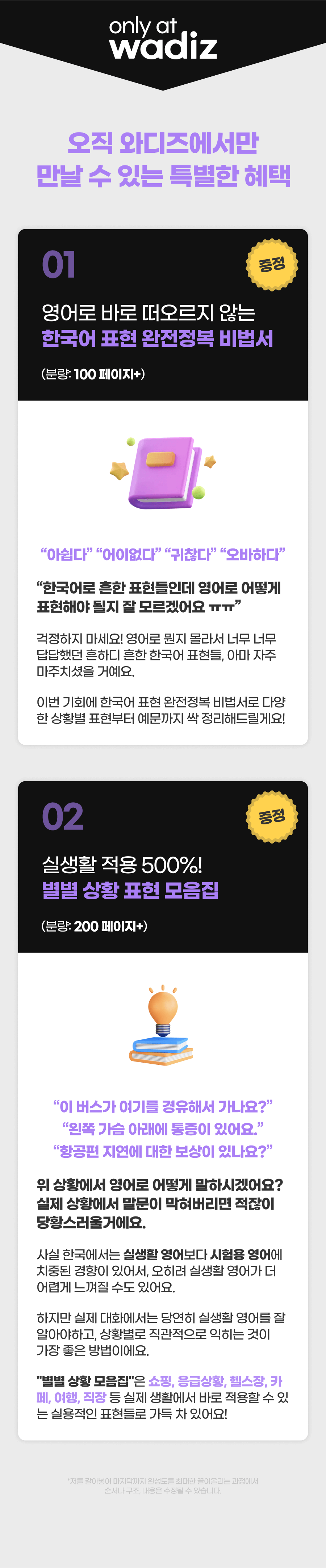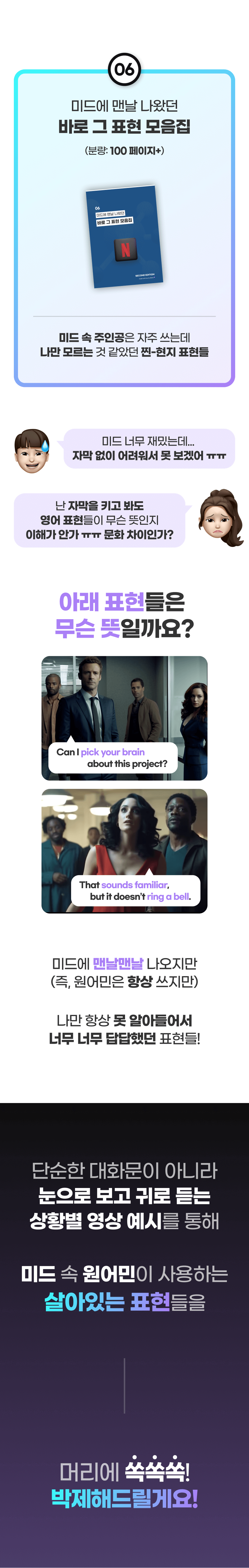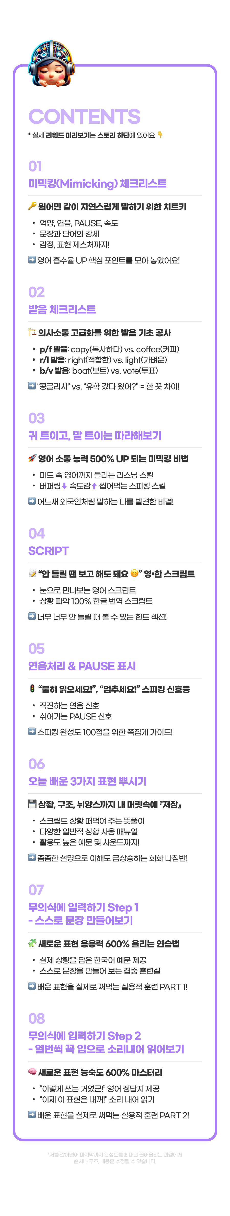 또한, 이 학습법을 체험하게 될 모든 학습자들이 더욱 풍부한 경험을 할 수 있게 하기 위해 추가적으로 다양한 학습 자료를 만들게 될 예정이에요. 학습자들이 영어에 부담을 느끼지 않고 더욱 재미있고 효과적으로 배울 수 있도록 도와주는 것이 목표니까요!