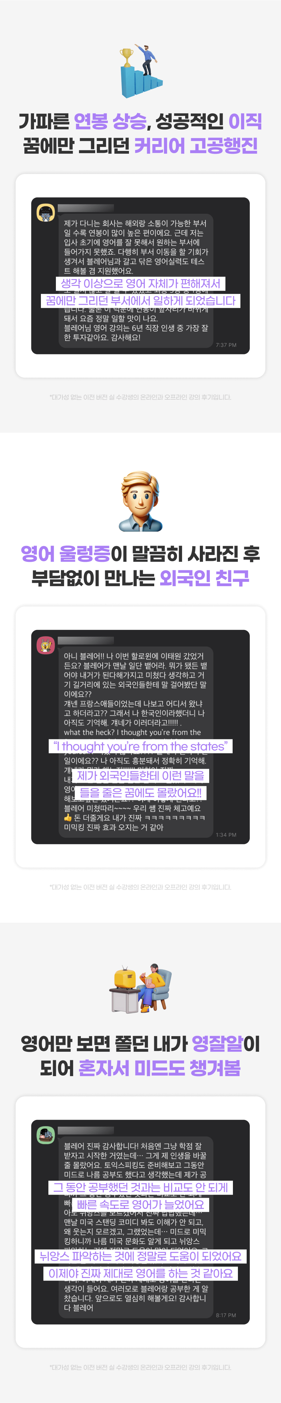 수강생들은 이전에는 상상도 못 했던 영어 회화 능력의 향상을 경험했고, 그들의 성공 사례와 감사의 메시지는 제가 이 방법을 더 많은 사람들에게 알려야 한다는 확신을 주었습니다.